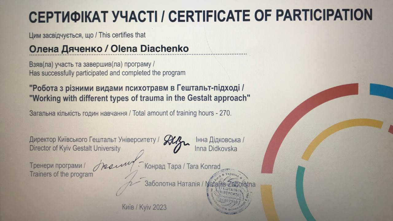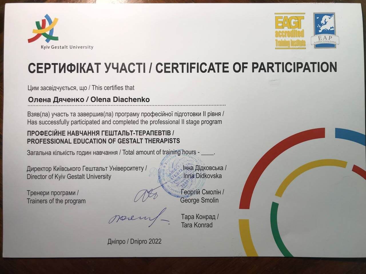 Киевский Гештальт Университет Сертификат о прохождении 1й ступени гештальт-терапии