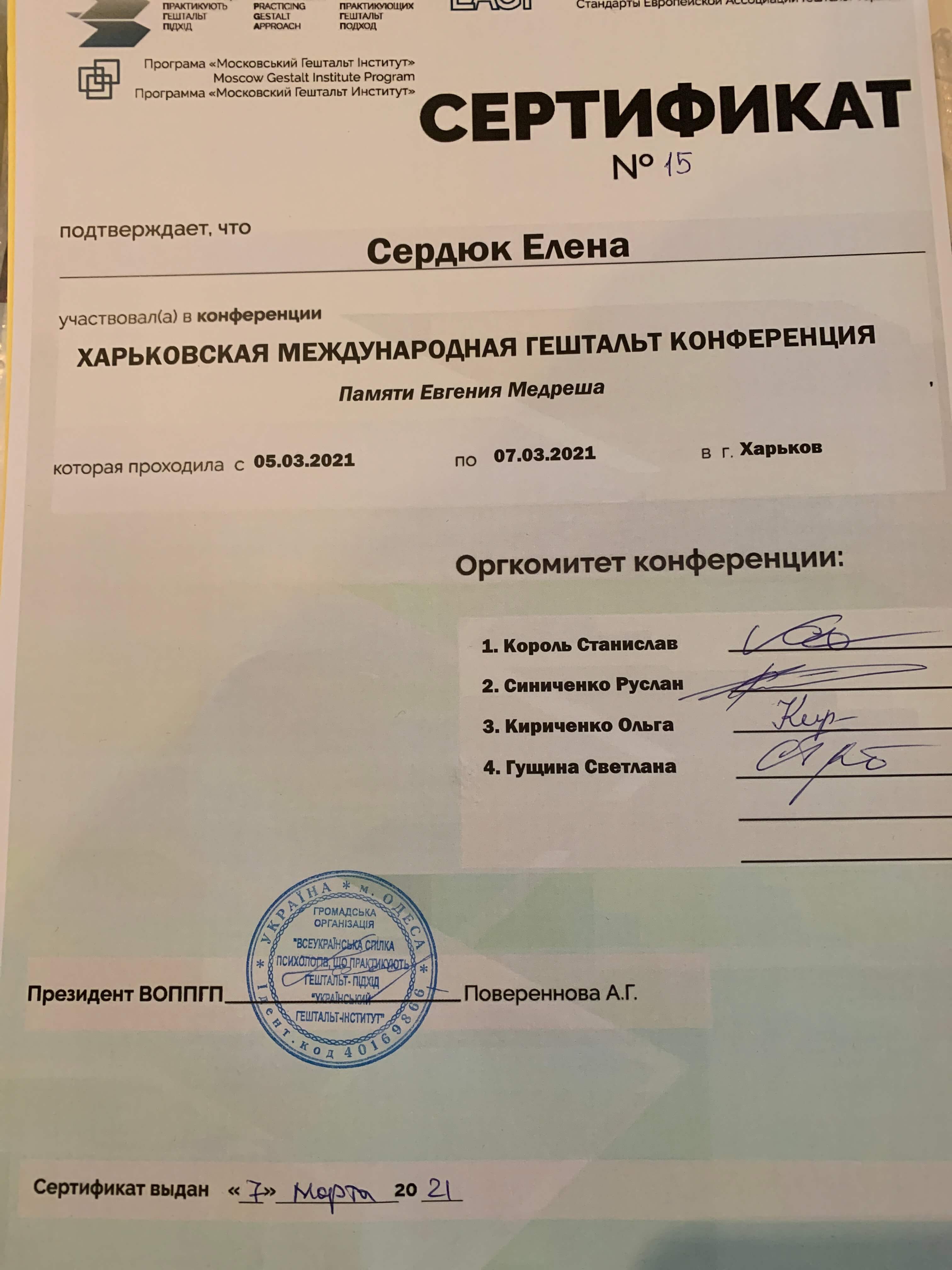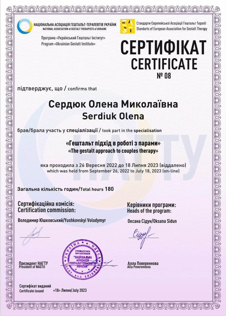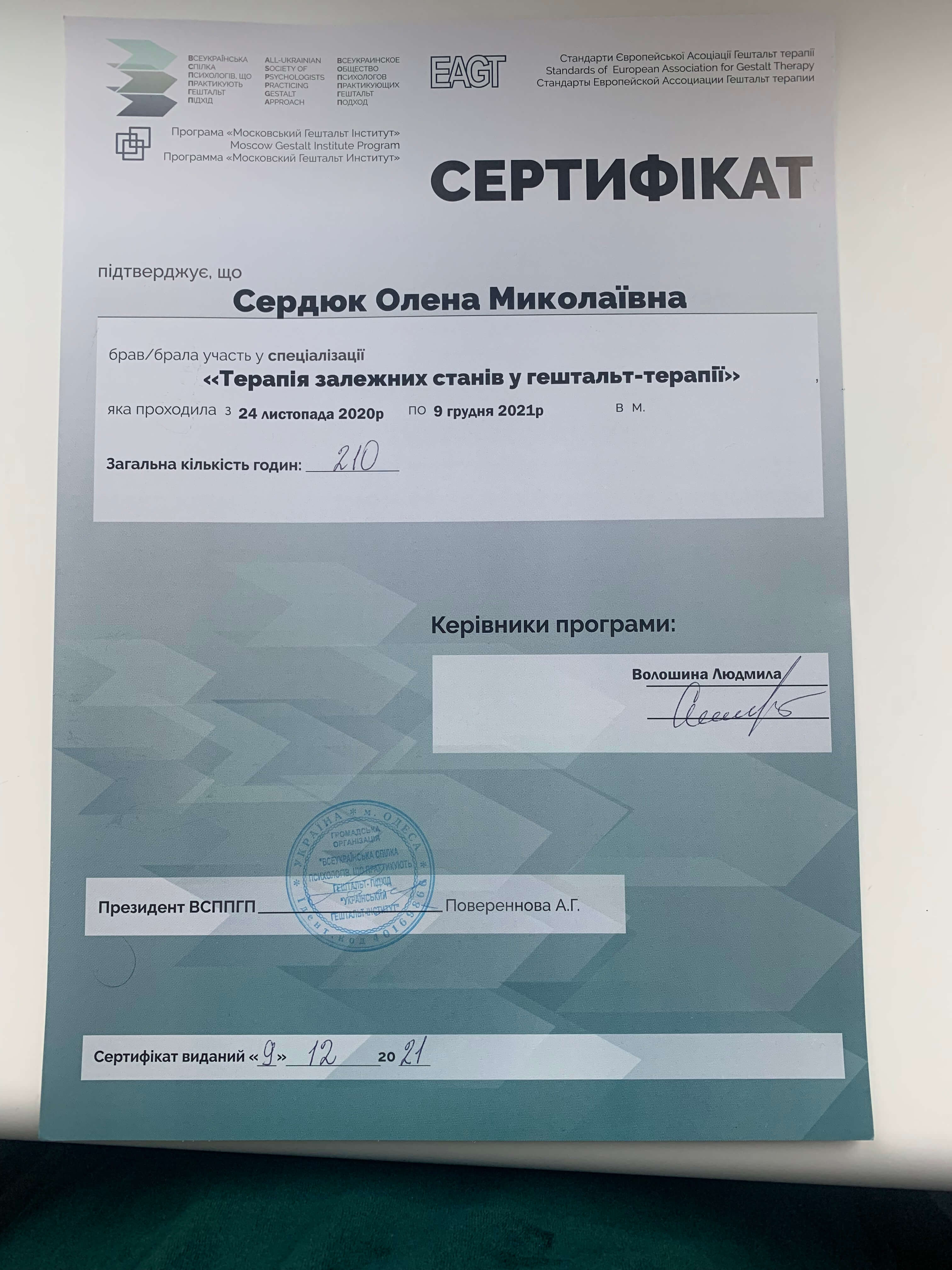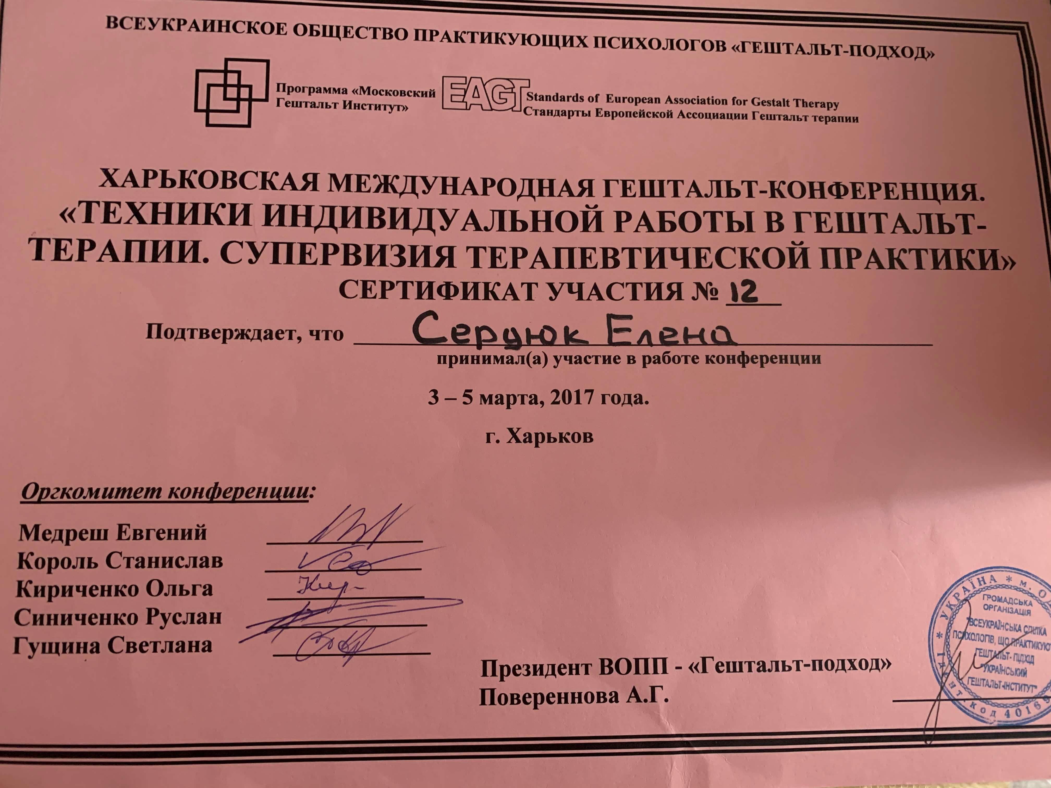 УИПА -магистр психология, ВОПП - Гештальт окончена 2 Ступень, Специализации: психосоматика и работа с телом в Гештальт- подходе. Созависимые и зависимые отношения в ГП