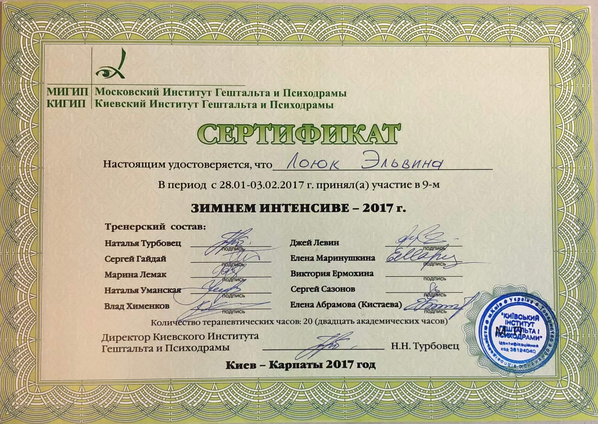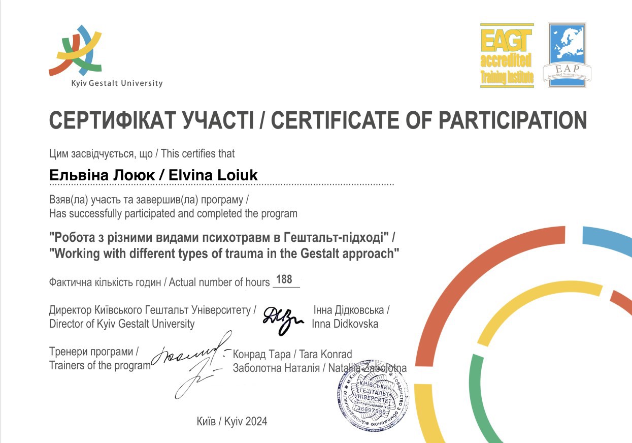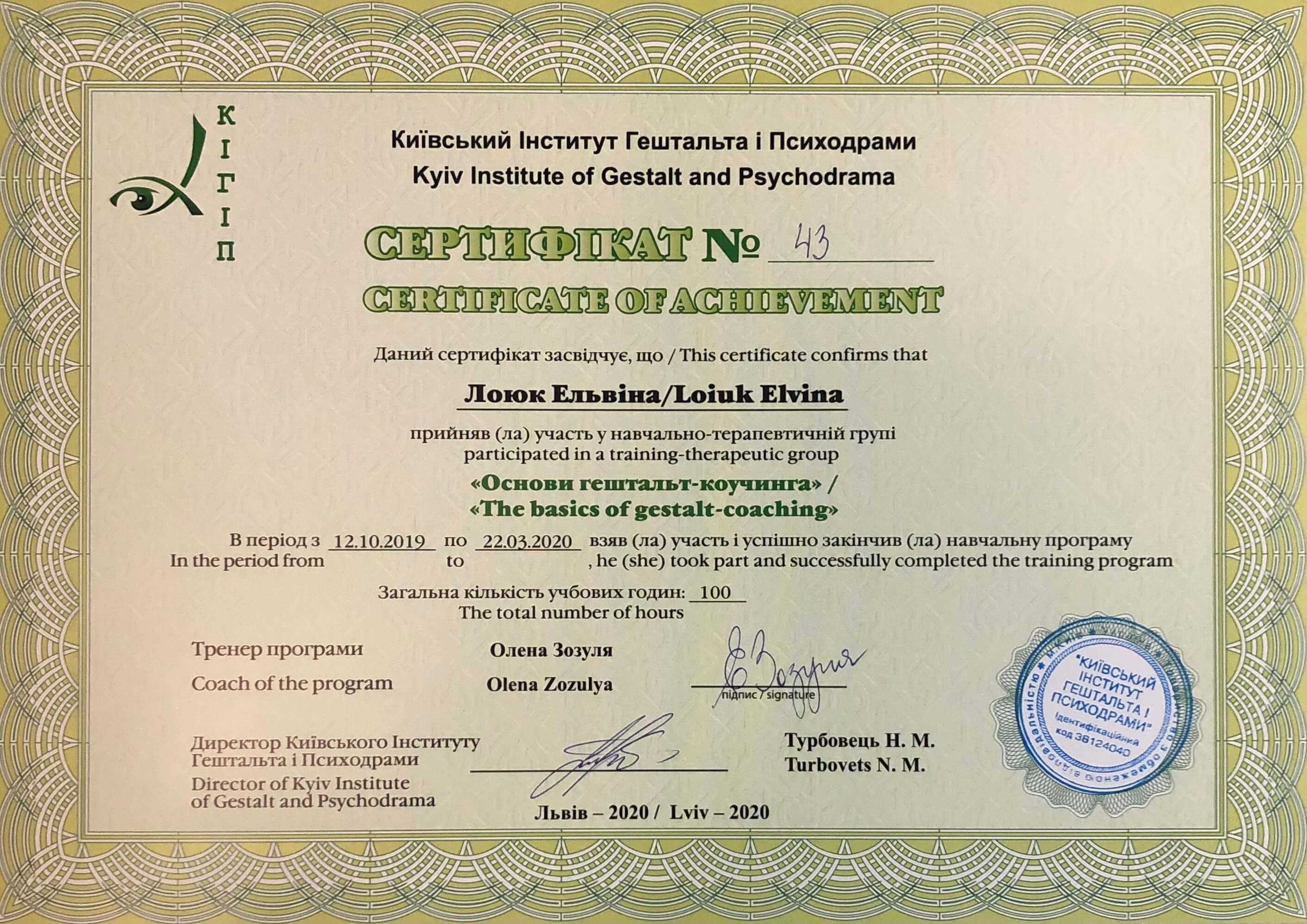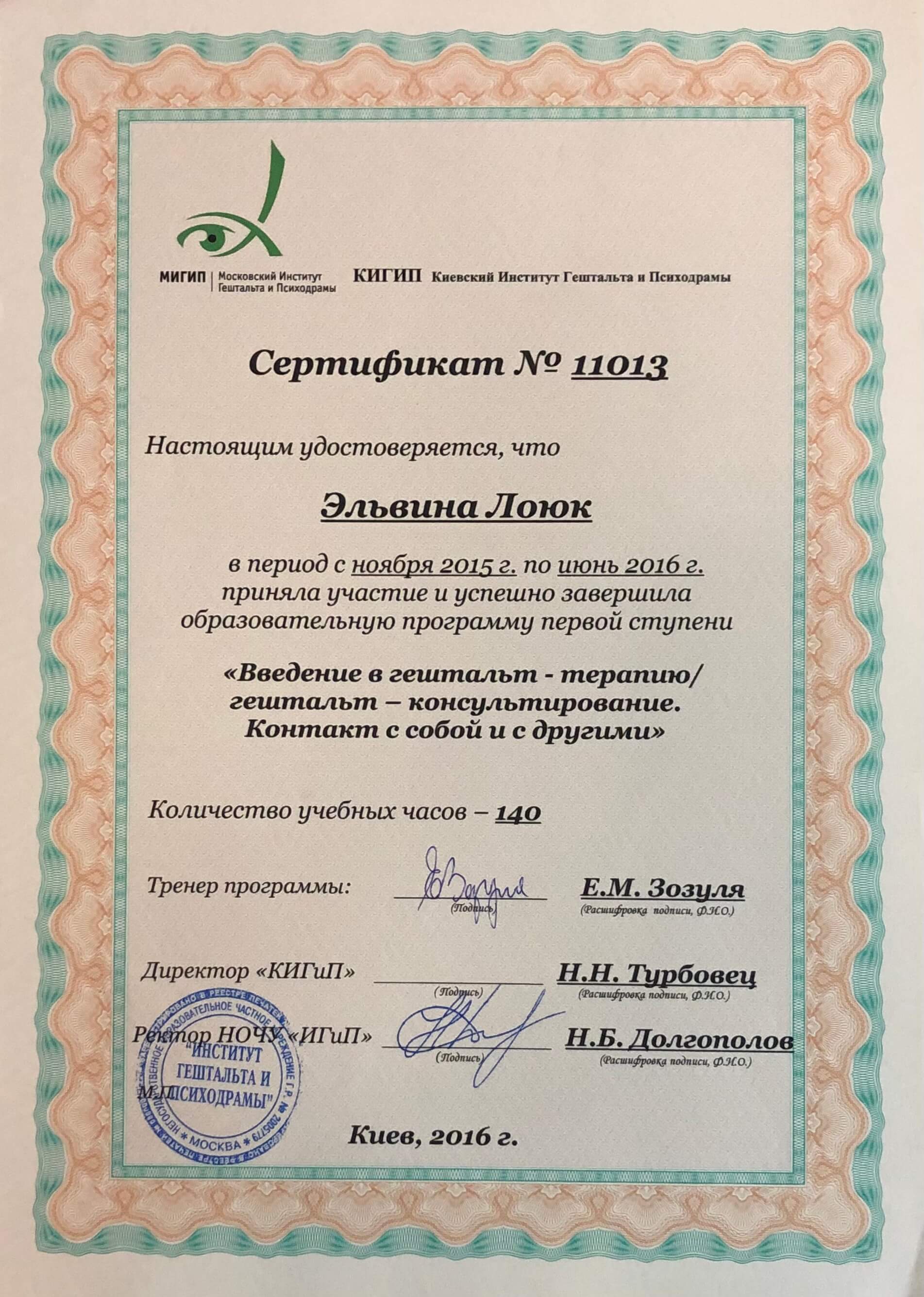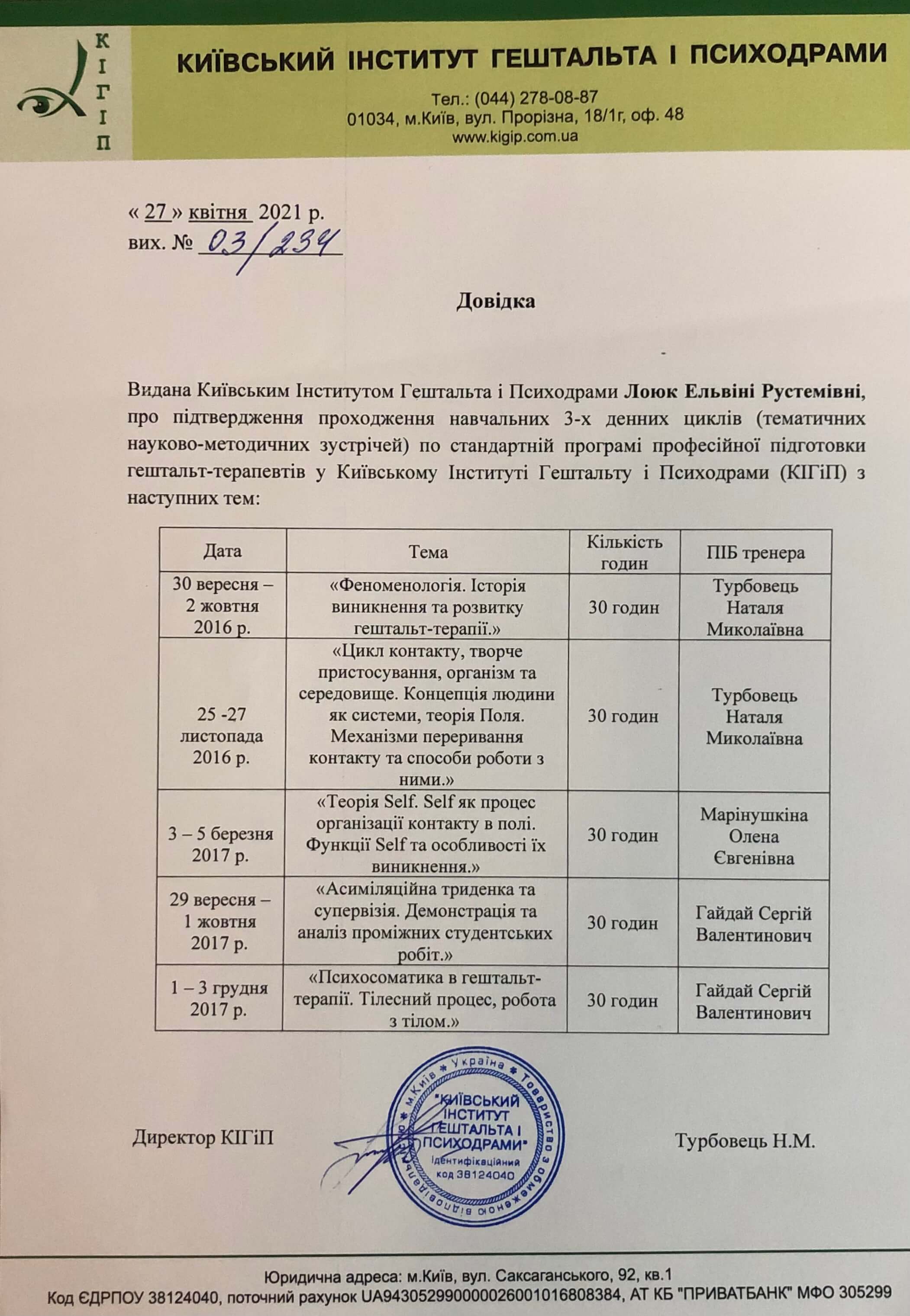 Київський Інститут Гештальта и Психодрами, Гештальт-терапія,1 ст.,2 ст., 2015-2017; Гештальт-коучинг, 2019-2020.