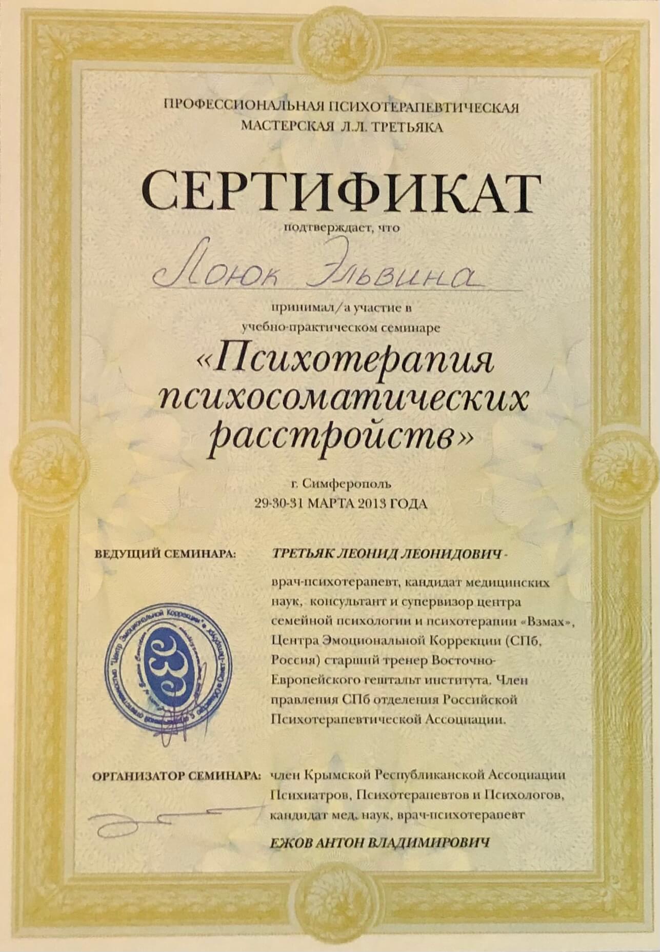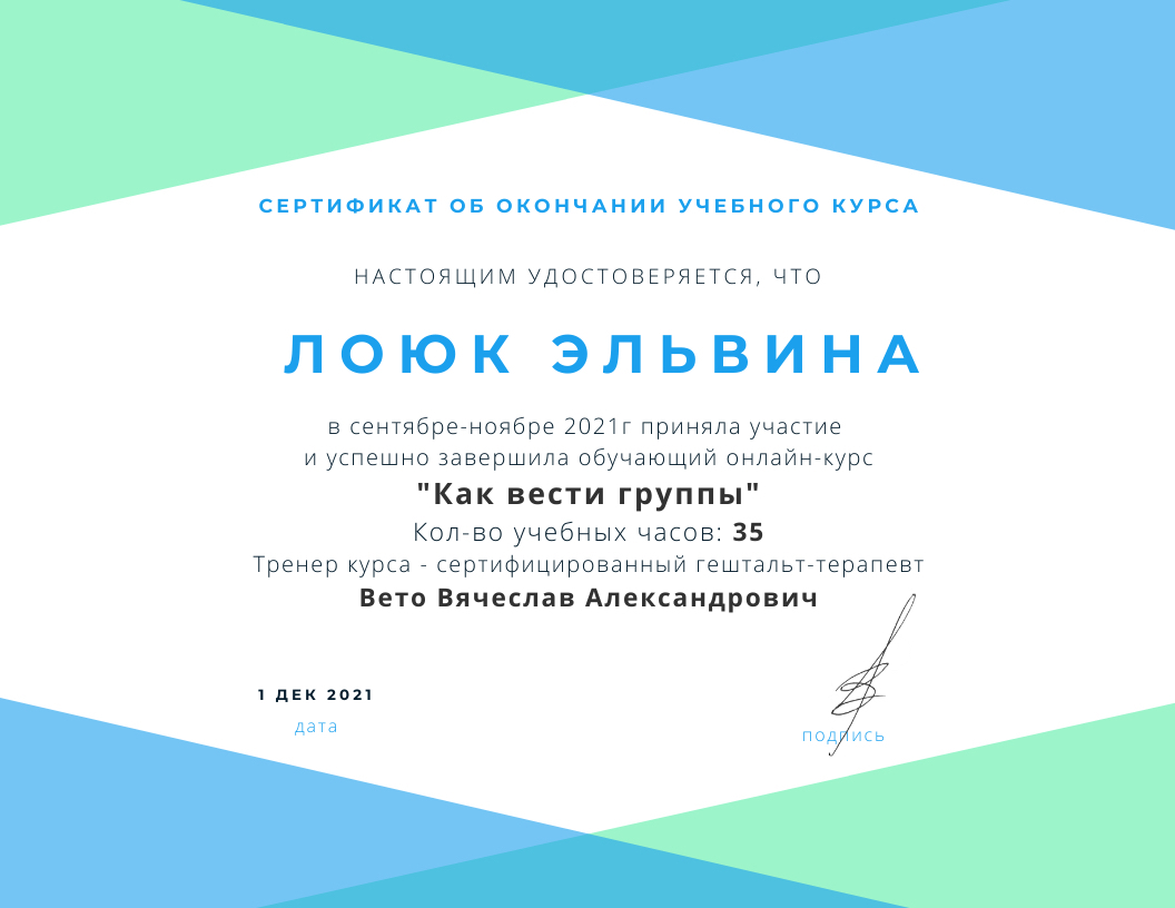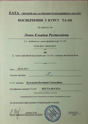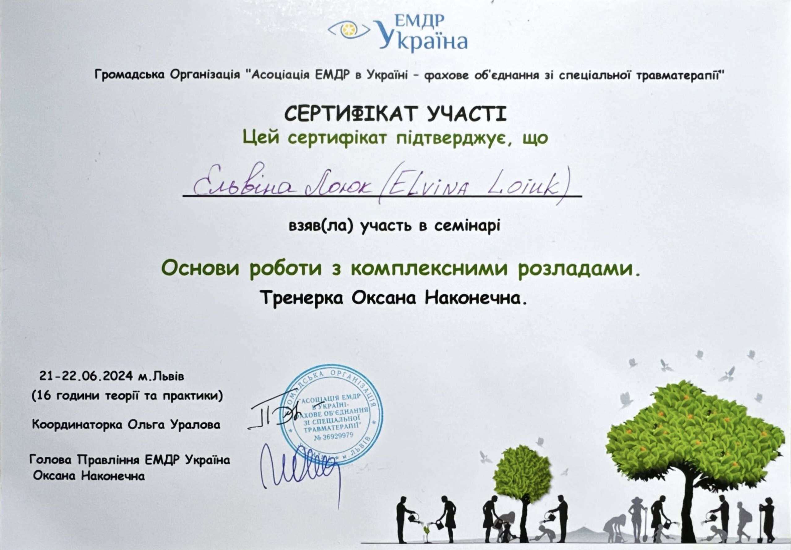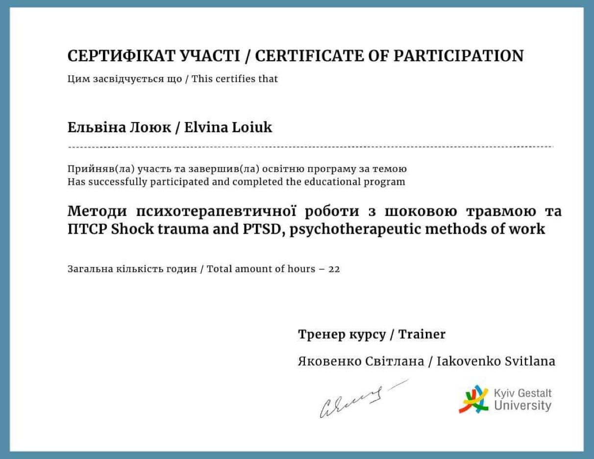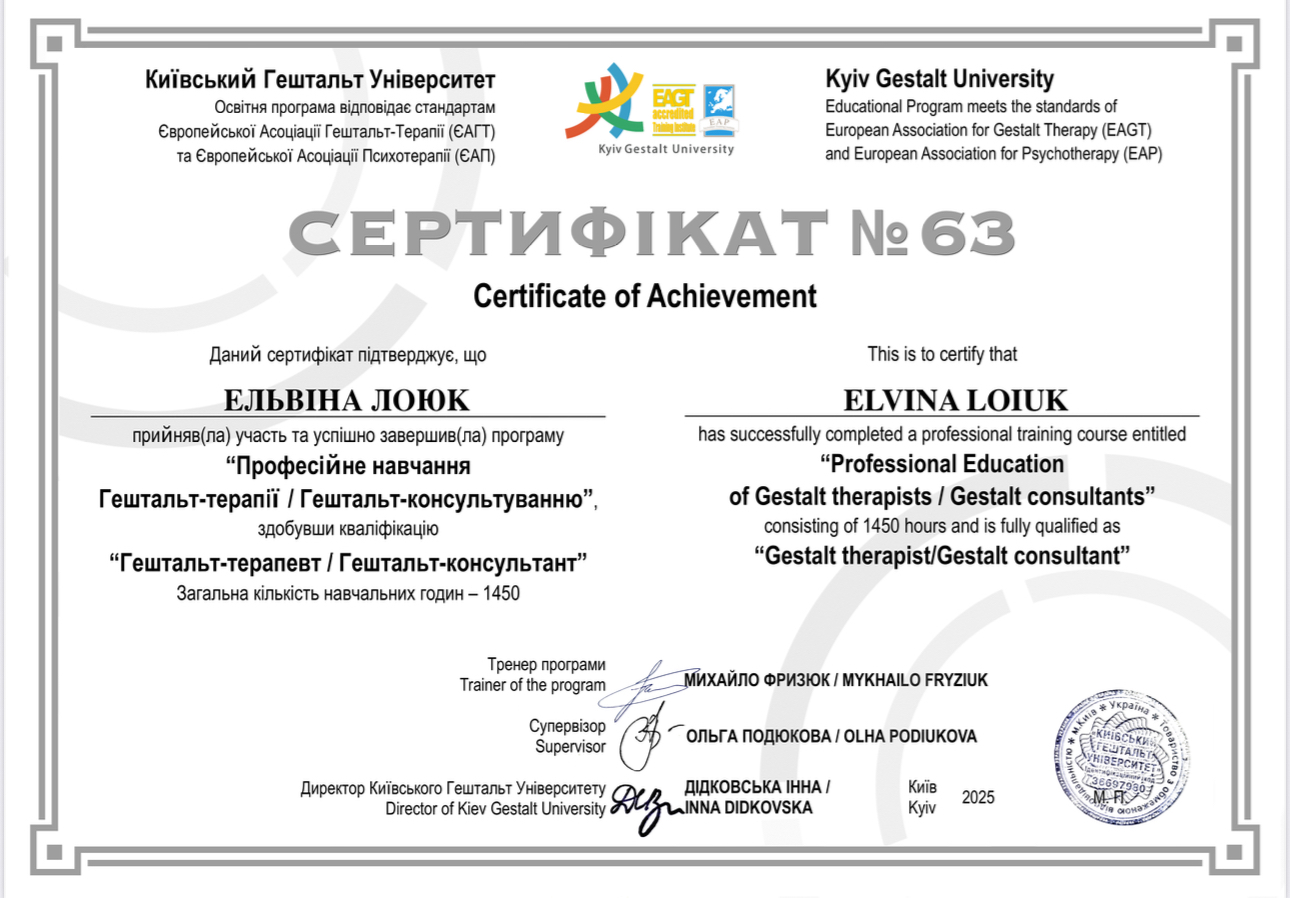 Київський Інститут Гештальта и Психодрами, Гештальт-терапія,1 ст.,2 ст., 2015-2017; Гештальт-коучинг, 2019-2020.
