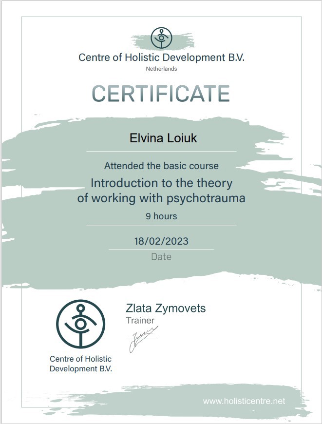 Захоплююся психологією та психотерапією зі школи, під час навчання в університеті на факультеті психології шукала для себе найбільш підходящий напрямок психотерапії. У 2013 як клієнт познайомилася з гештальт-підходом, бодинамикою у груповій роботі, і зрозуміла, що нарешті знайшла своє.