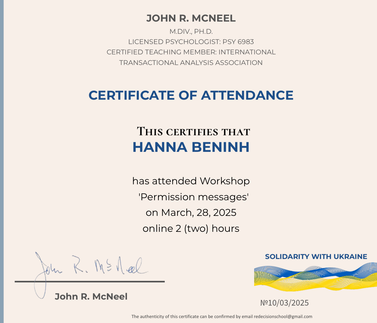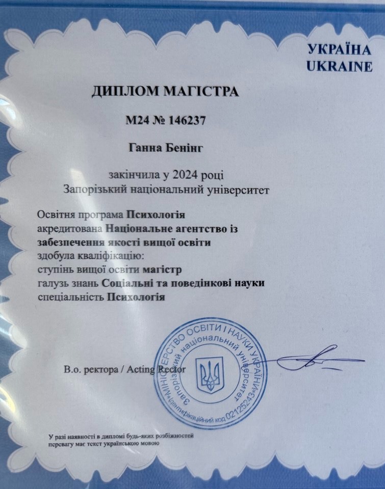 Есть диплом магистра психологии. Транзактный анализ, специализация «Терапия пар», курсы по личностным адаптациям
