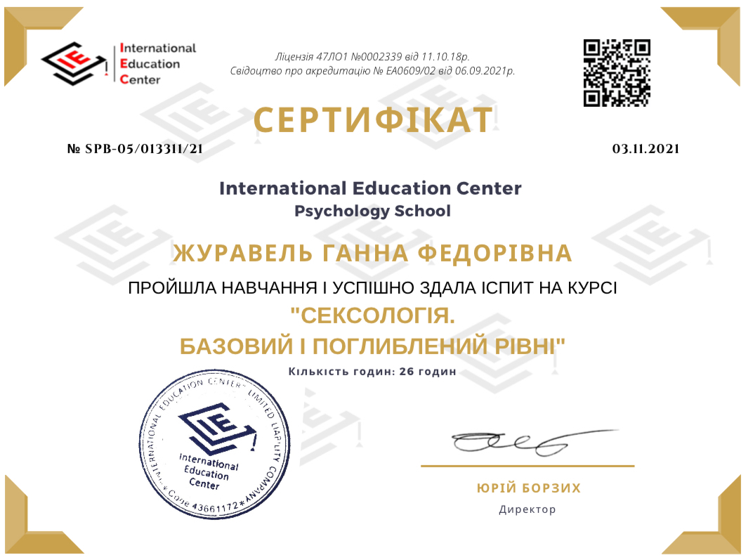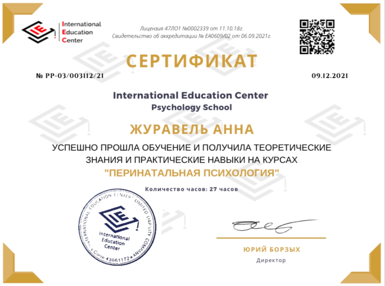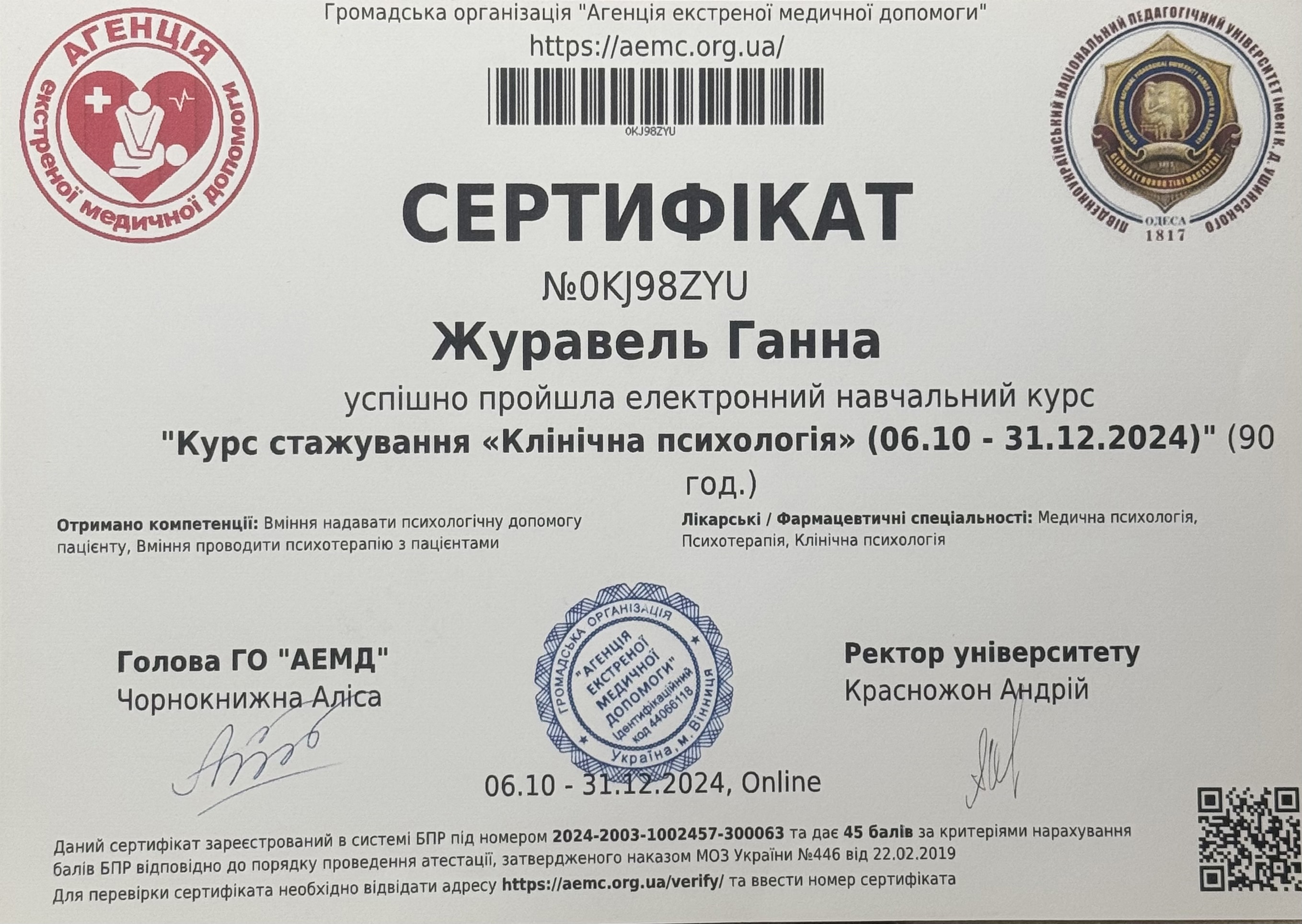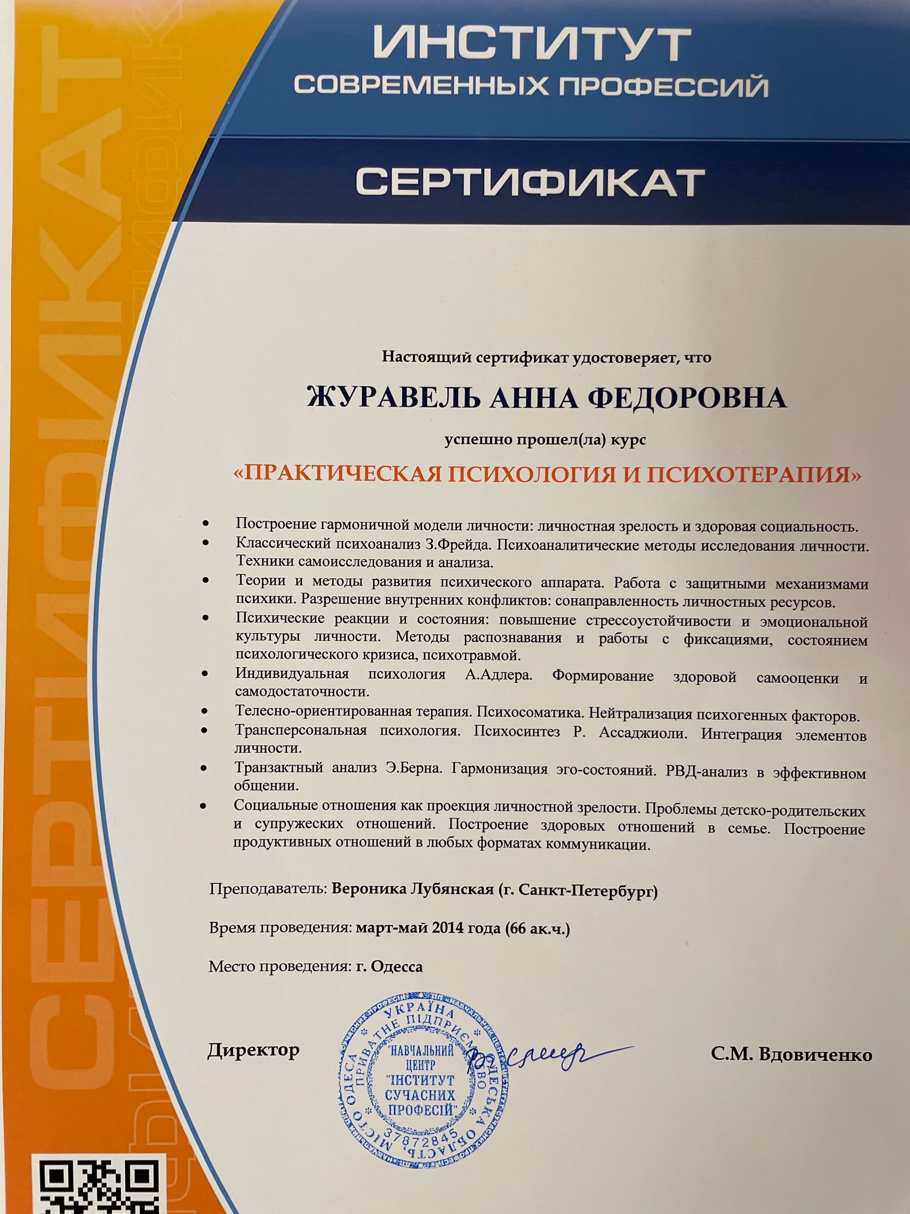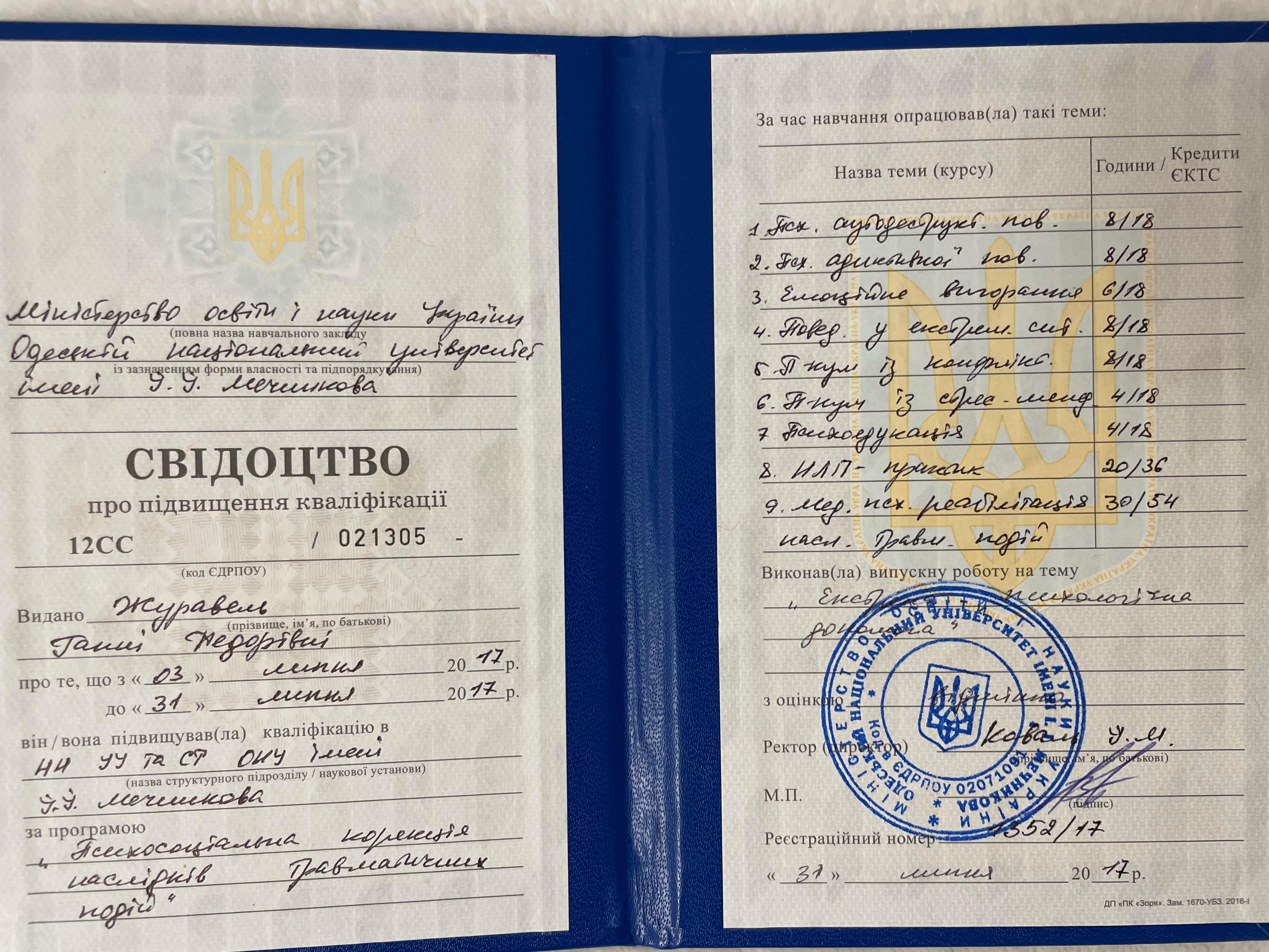 Курсы повышения квалификации «Клиническая психология», курс «Нейропсихология», курс «Самооценка, практический подход», Курс «Перинатальная психология», курс «Психосоматика», курс «Сексология, базовый и углубленный уровни, Особенности психологической помощи учащимся с тревожностью, страхами , фобиями", "Психотравмы и психосоматические проявления у детей.