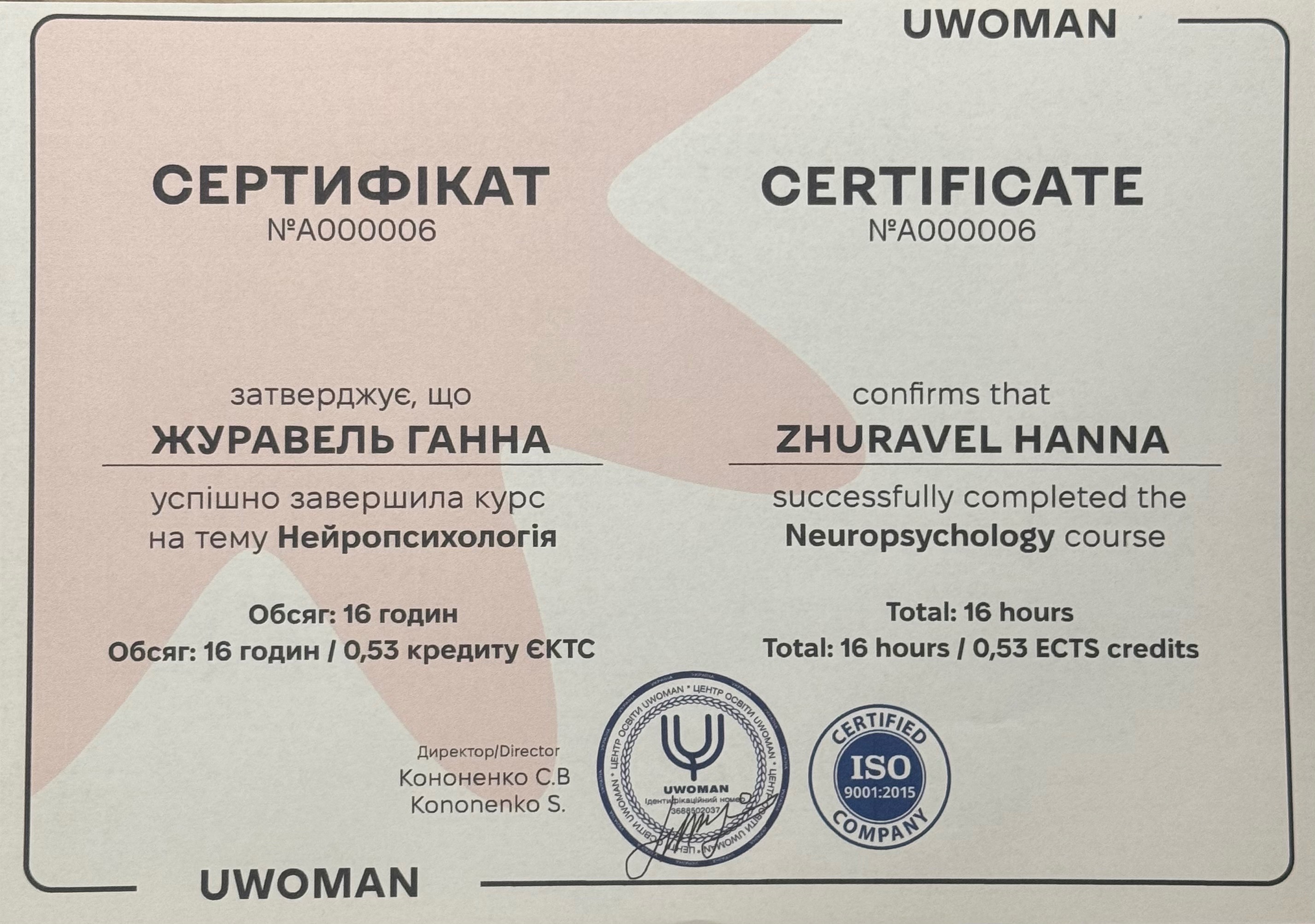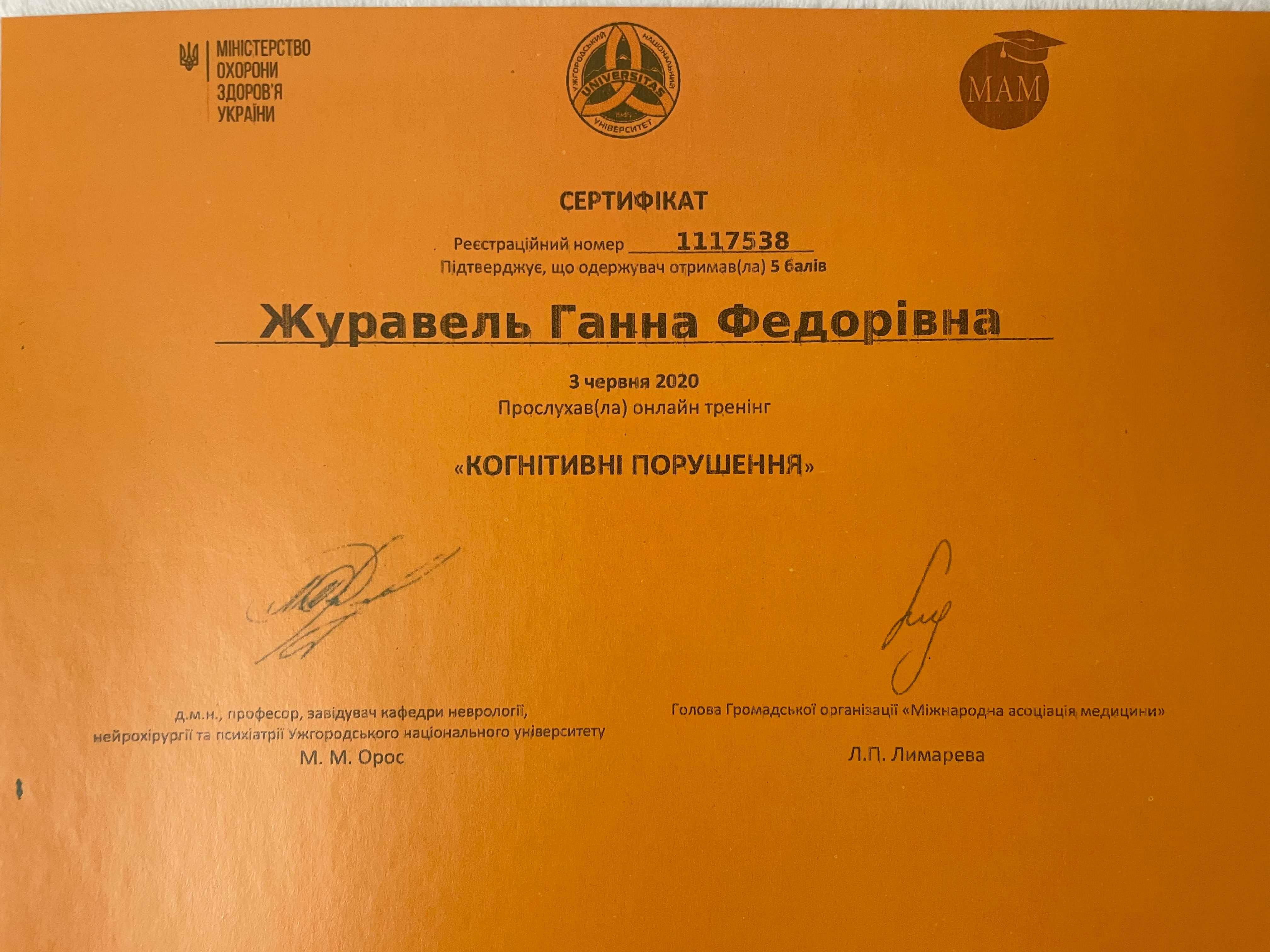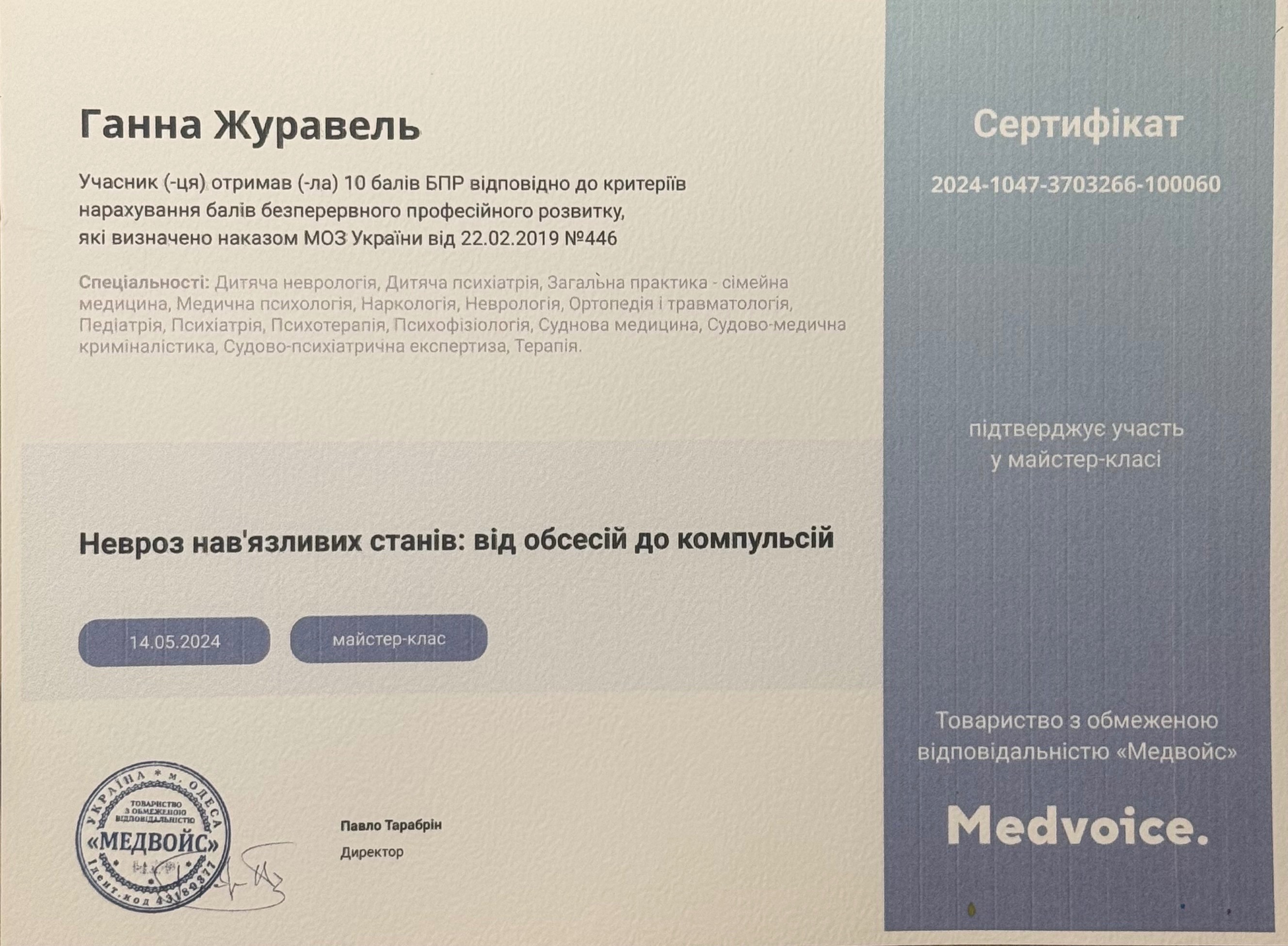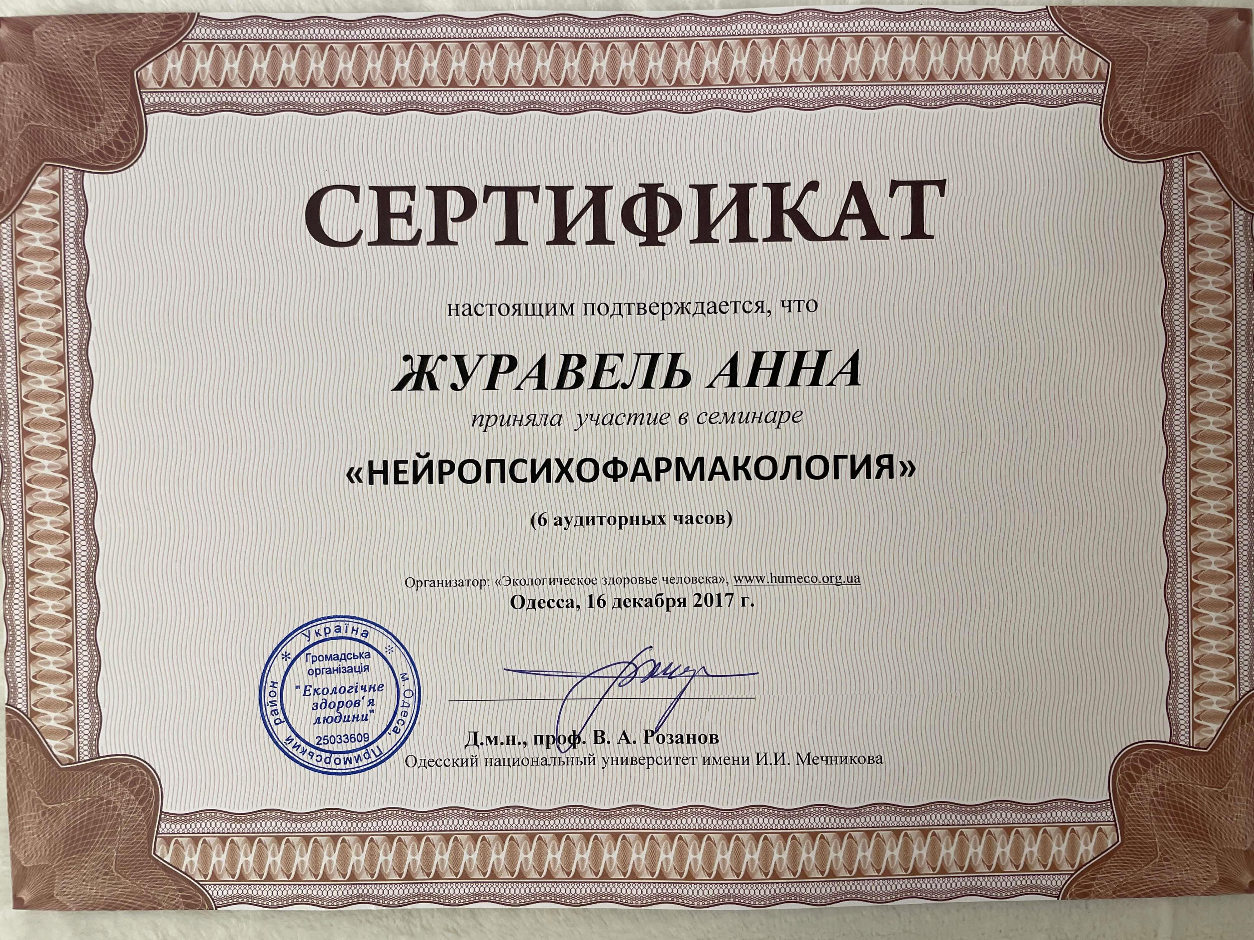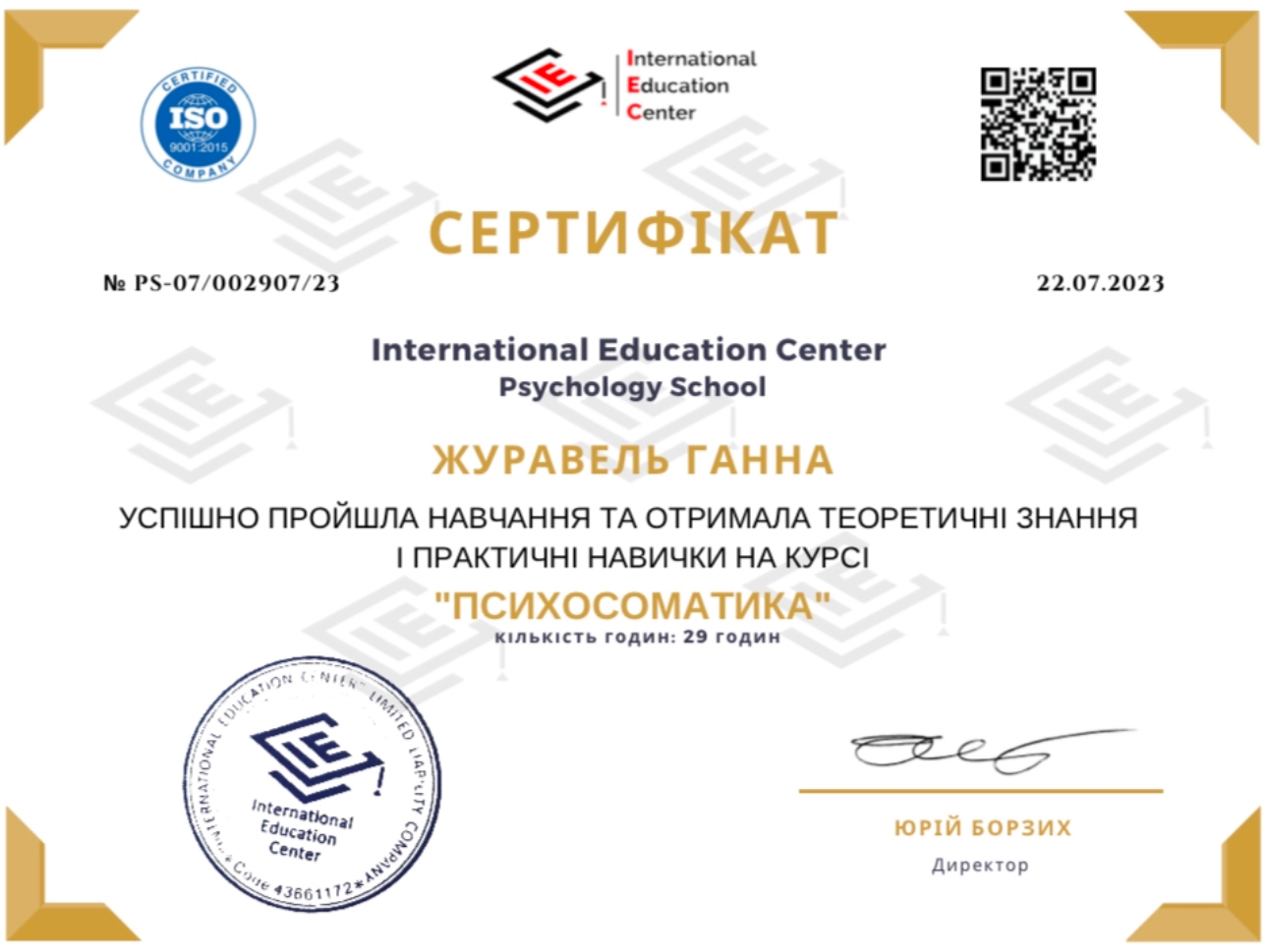 Курсы повышения квалификации «Клиническая психология», курс «Нейропсихология», курс «Самооценка, практический подход», Курс «Перинатальная психология», курс «Психосоматика», курс «Сексология, базовый и углубленный уровни, Особенности психологической помощи учащимся с тревожностью, страхами , фобиями", "Психотравмы и психосоматические проявления у детей.