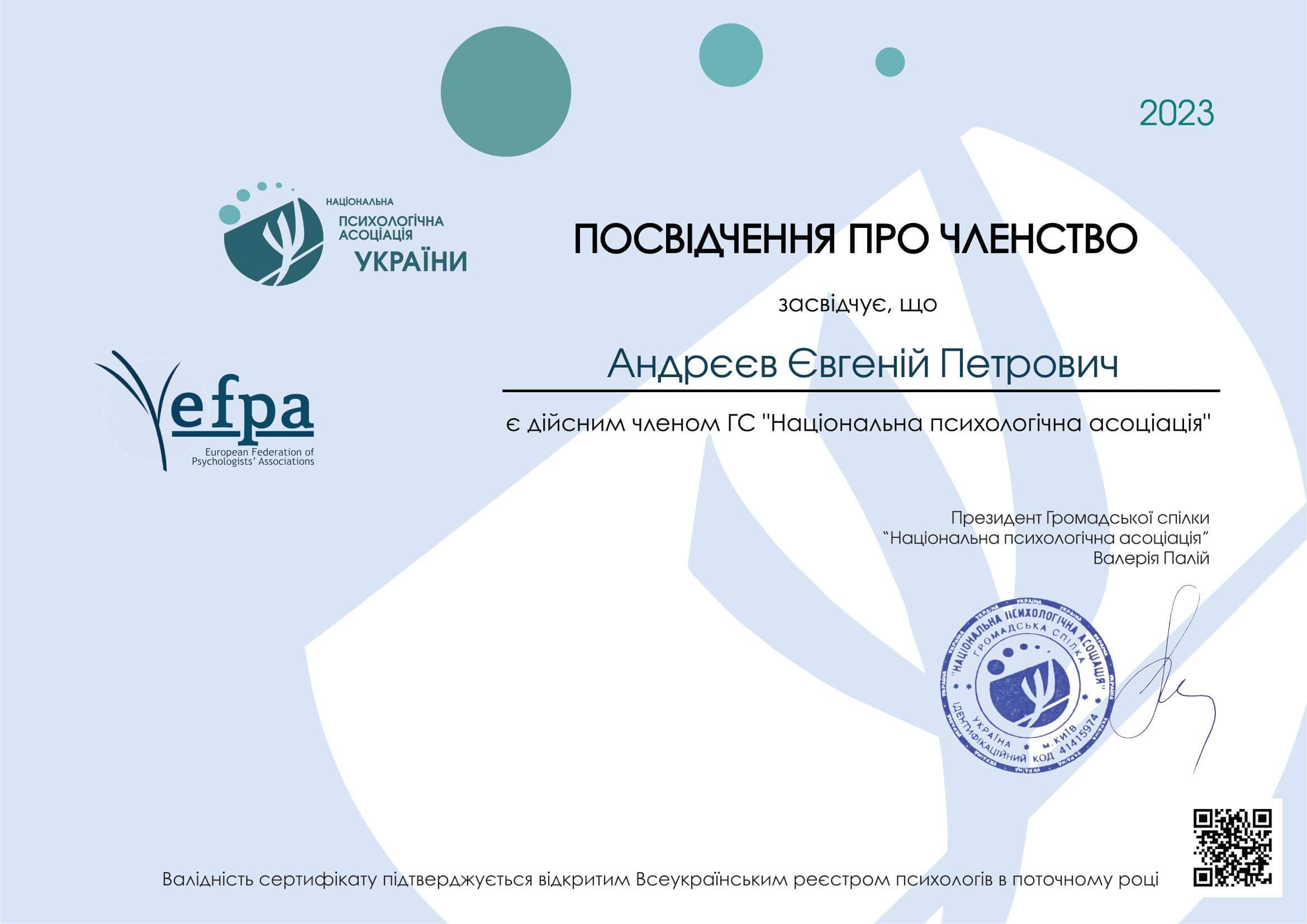 С марта 2023 года является членом Национальной психологической ассоциации (НПА) и членом дивизиона «Психоаналитическая психология и психотерапия»