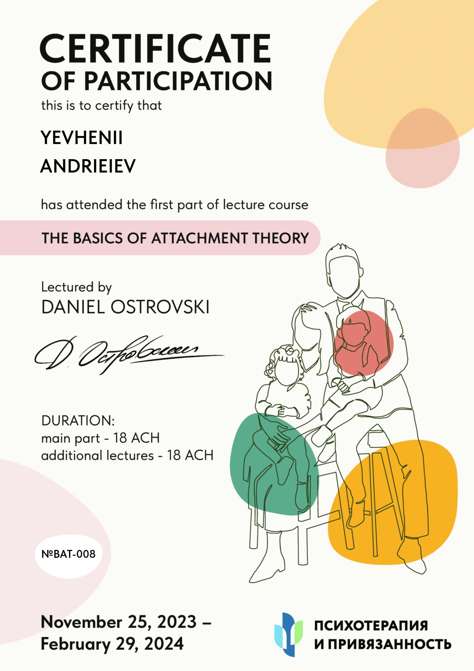 ноябрь 2023 – курс повышения квалификации «Теория привязанности и ее значение для психотерапевтической практики» (в процессе)