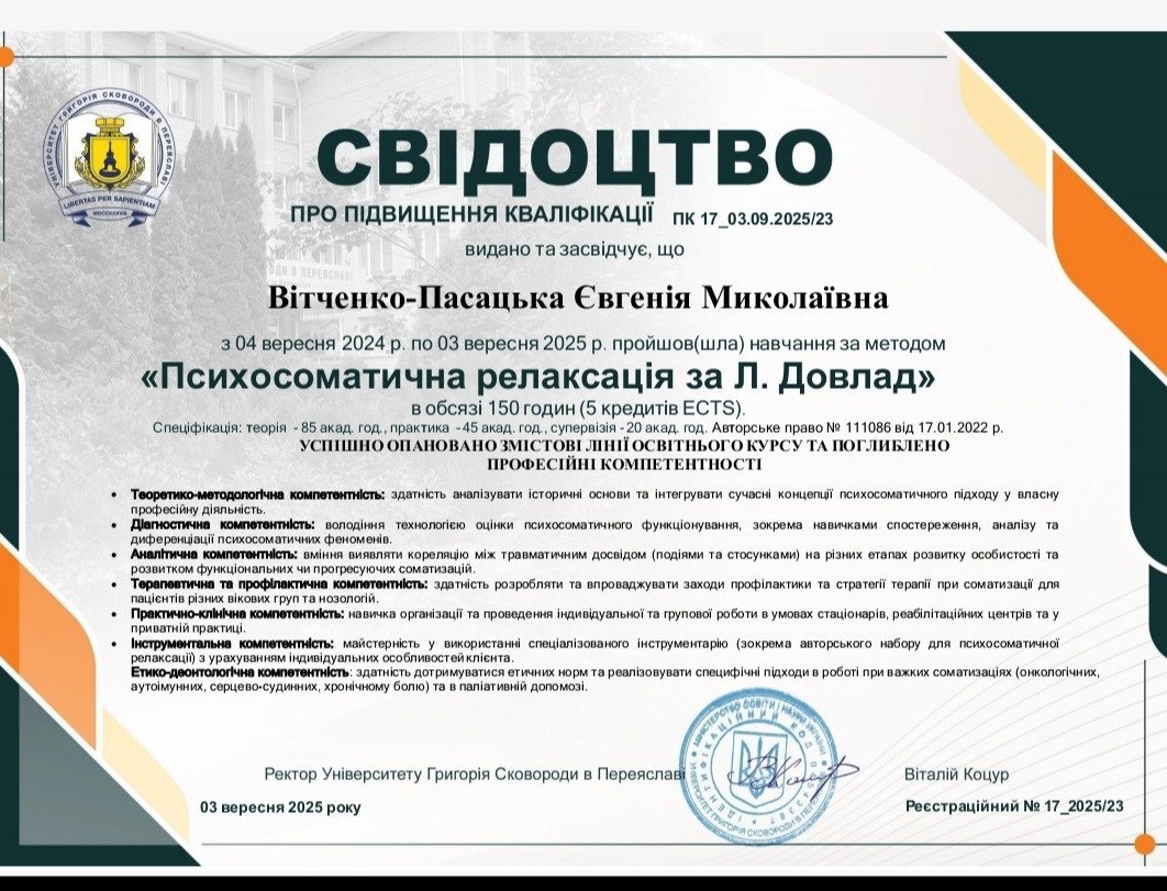 Регулярные встречи обычно один раз в неделю, онлайн или в офисе (Киевская область). Продолжительность сессии – 50 минут.