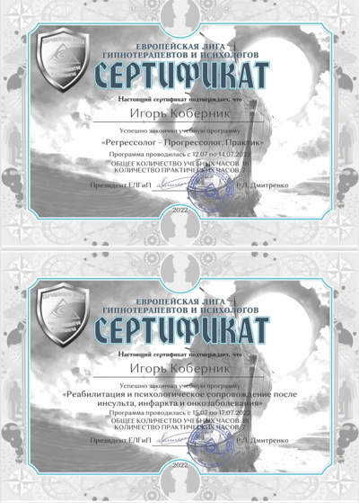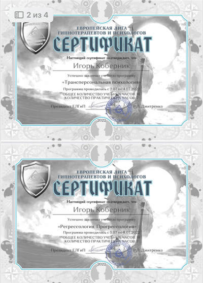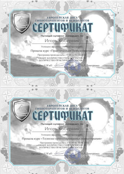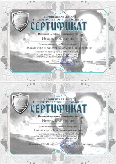 4. Європейська ліга гіпнотерапіі, курси з еріксонівського гіпнозу, директивно-класичний гіпноз, регресологі-прогресологія, трансперсональна гіпнотерапія, супровід онкохворих.