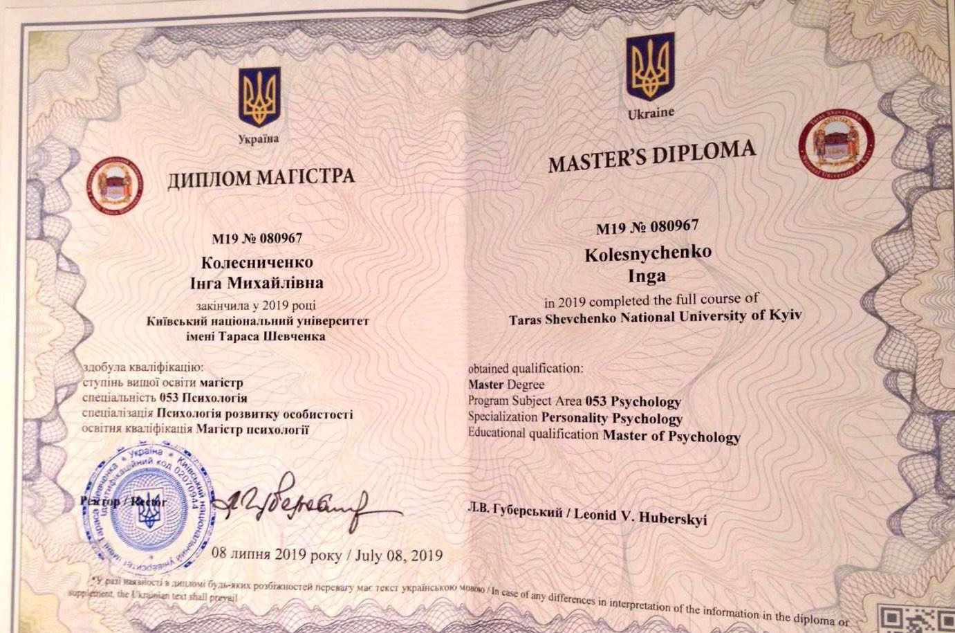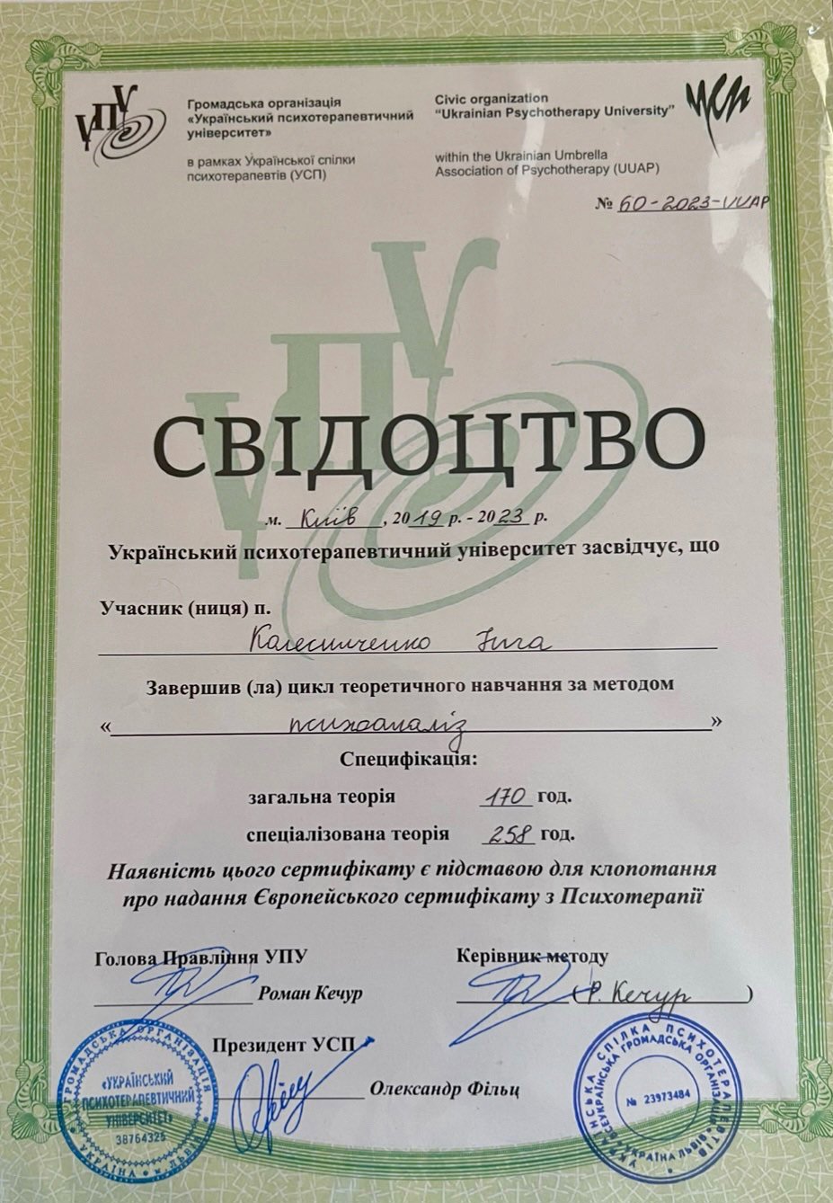 Высшее психологическое образование - КНУ им.Шевченко, специализация в методе - Украинский психотерапевтический университет, стажировка - Киевская психиатрическая больница #1, повышение квалификации - пропедевтика психиатрии, курс психосоматики