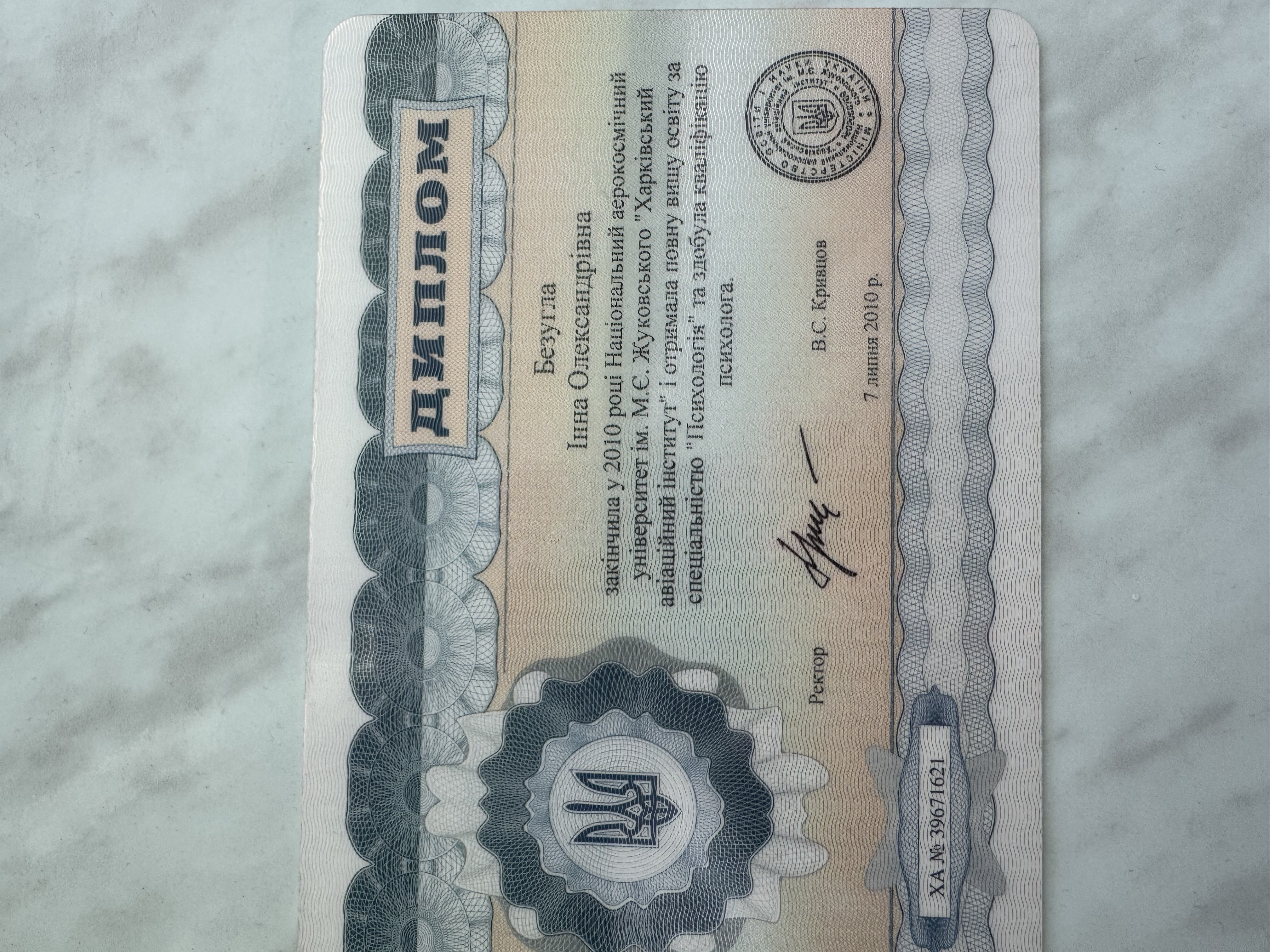 2004-2010 г. Харьковский национальный аэрокосмический университет им. М.Е. Жуковского «ХАИ» специальность магистр психологии