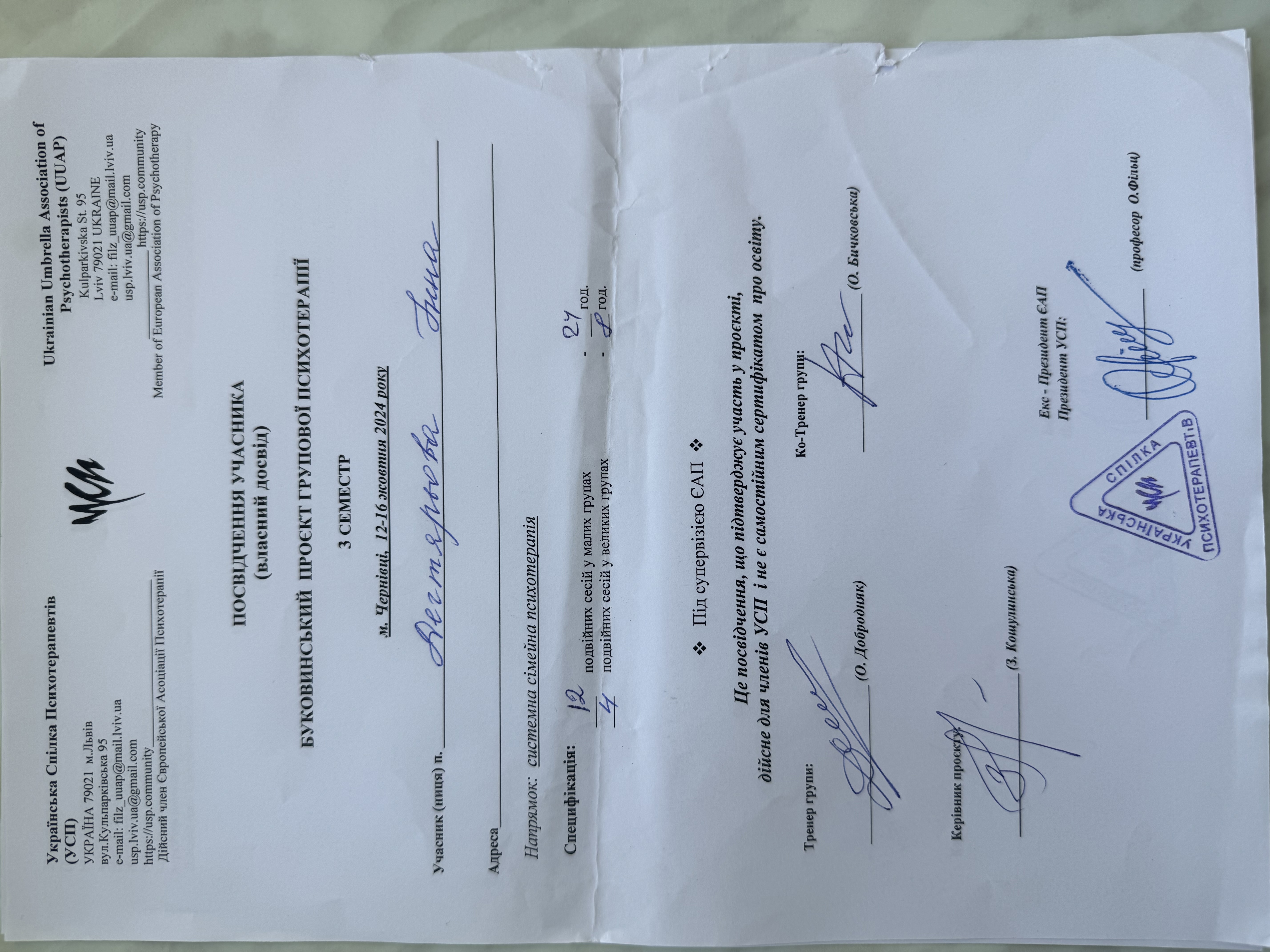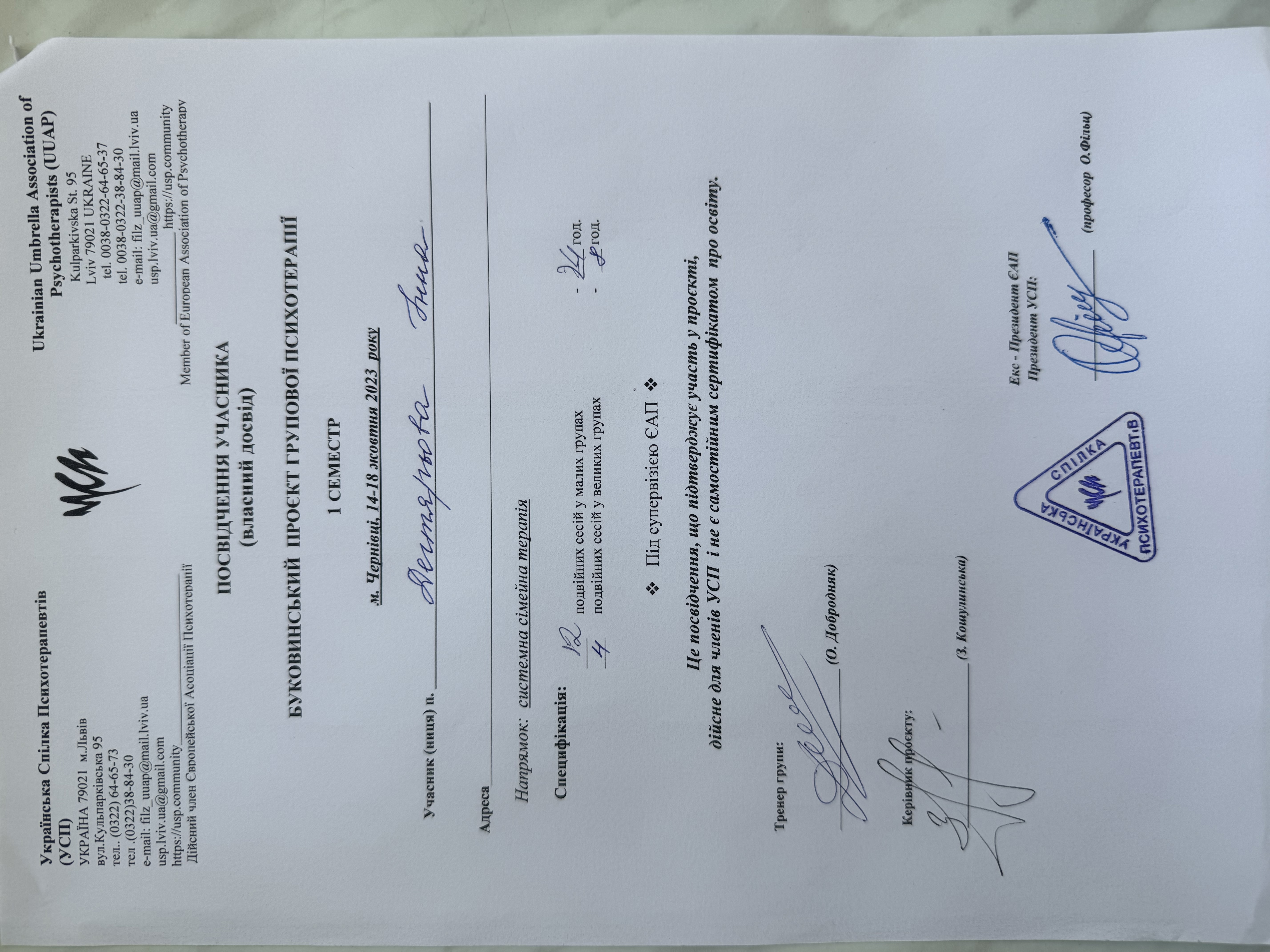 2023 г. обучение на системного семейного психотерапевта (Украинский психотерапевтический университет)