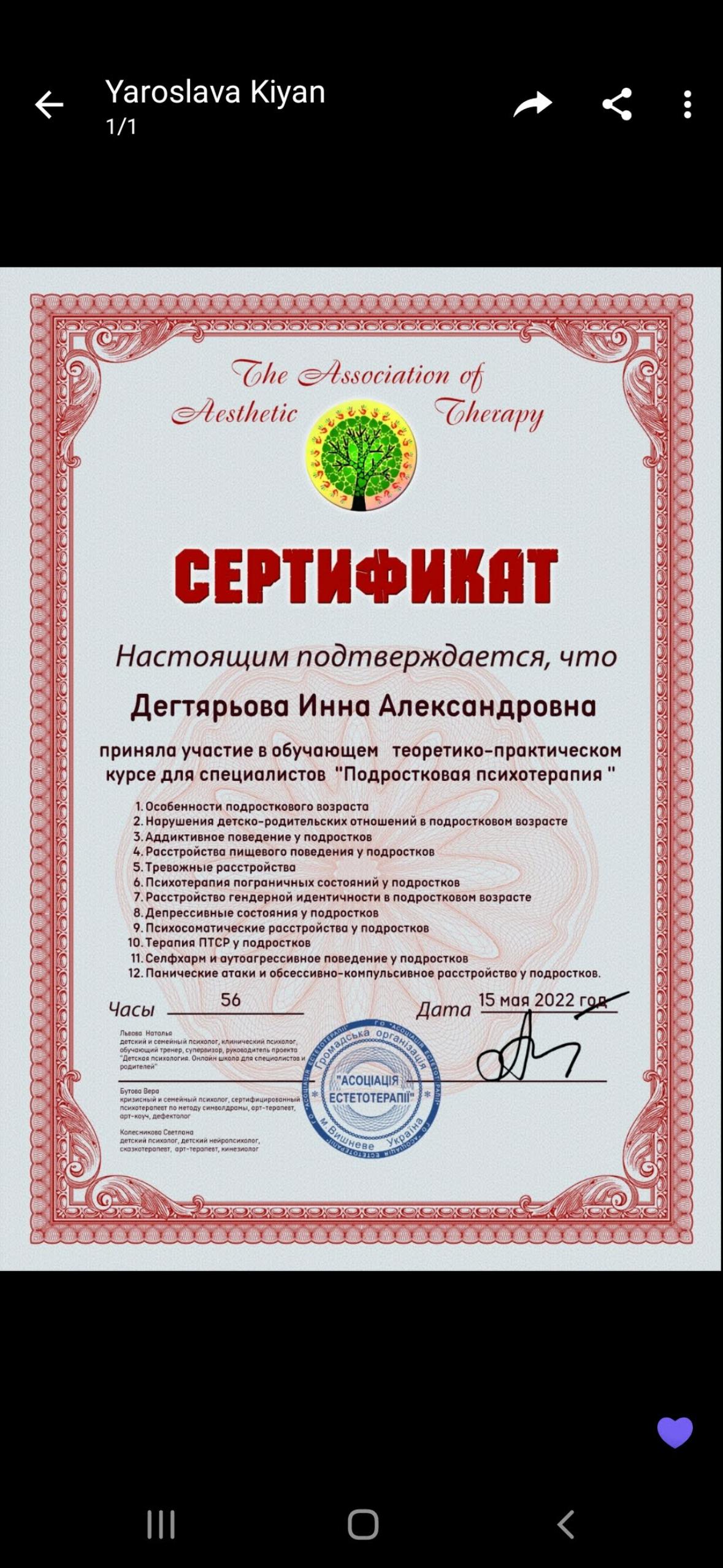 2022 г. – Курс «Подростковая психотерапия».