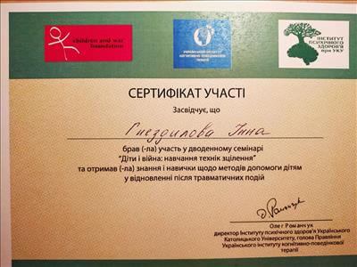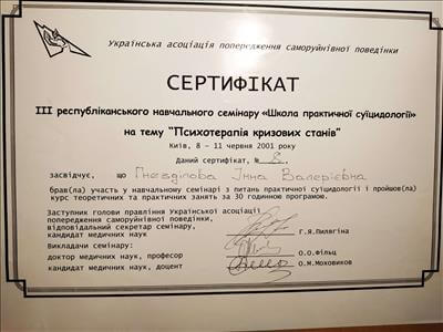 - июнь 2001 г. Обучающий семинар "Школы практической суицидологии" по теме "Психотерапия кризисных состояний" (30 часов) Украинской ассоциации предупреждения саморазрушающего поведения;
