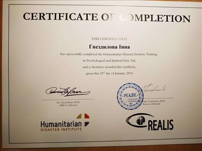- январь 2016 г. Нumanitarian Disaster Institute Training in Psichological and Spiritual First Aid;