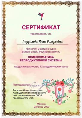 - декабрь 2020 г. «Психосоматика репродуктивной системы» (12 часов);