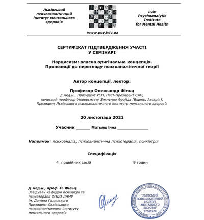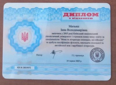 Магистр психологии - Киевский Национальный Университет имени Тараса Шевченка (2020 - 2022), с 2019 и по сегодняшний день - Институт консультирования и психотерапии Ассоциации психологов Украины