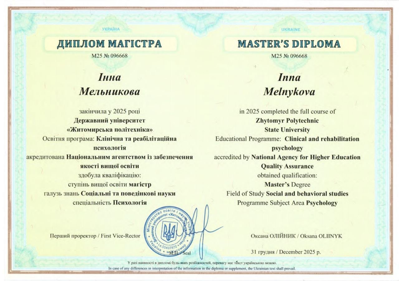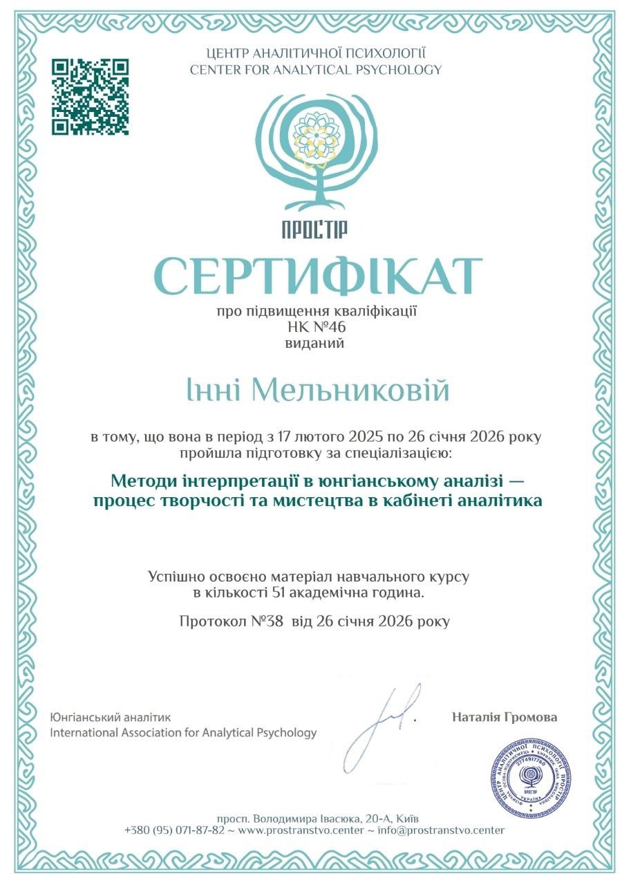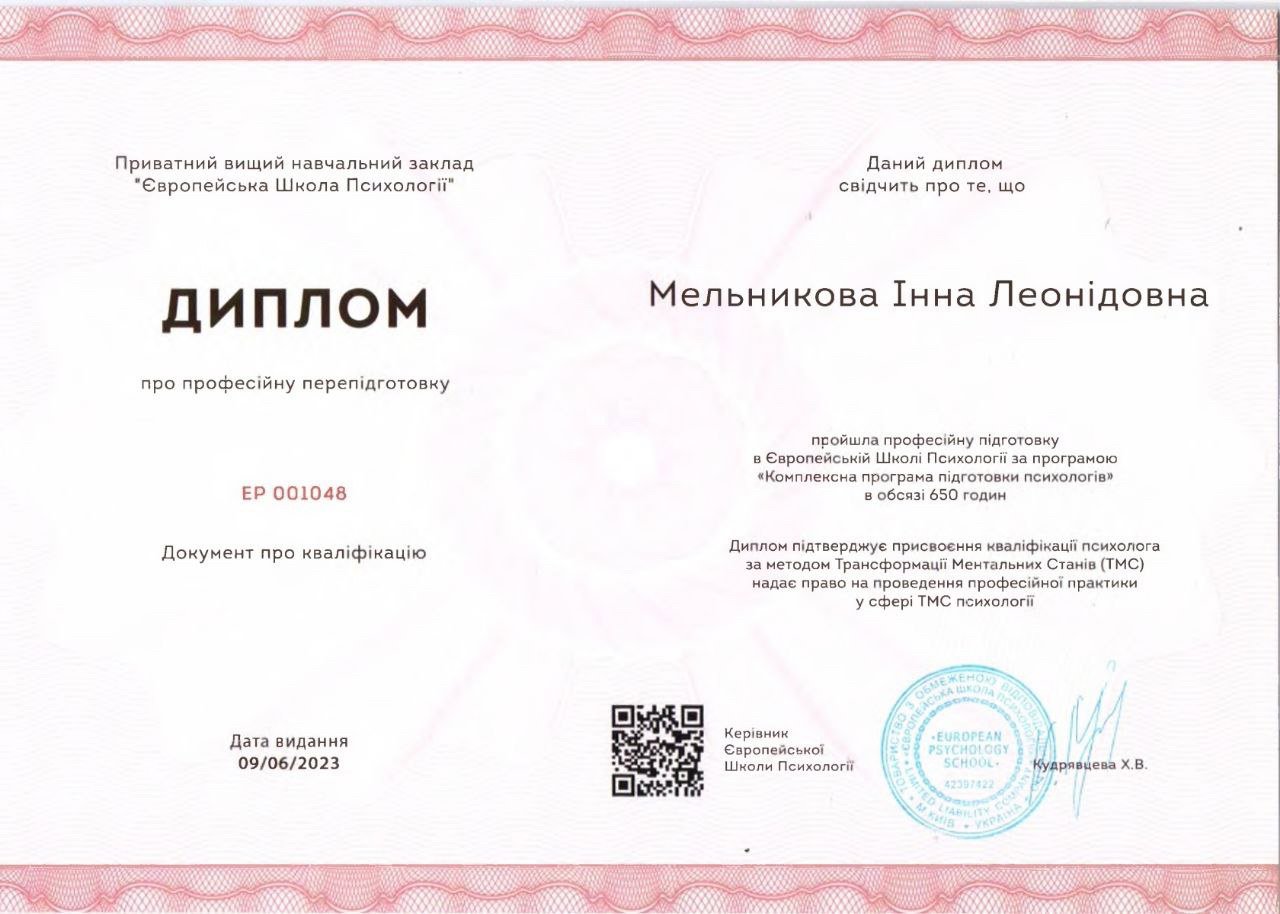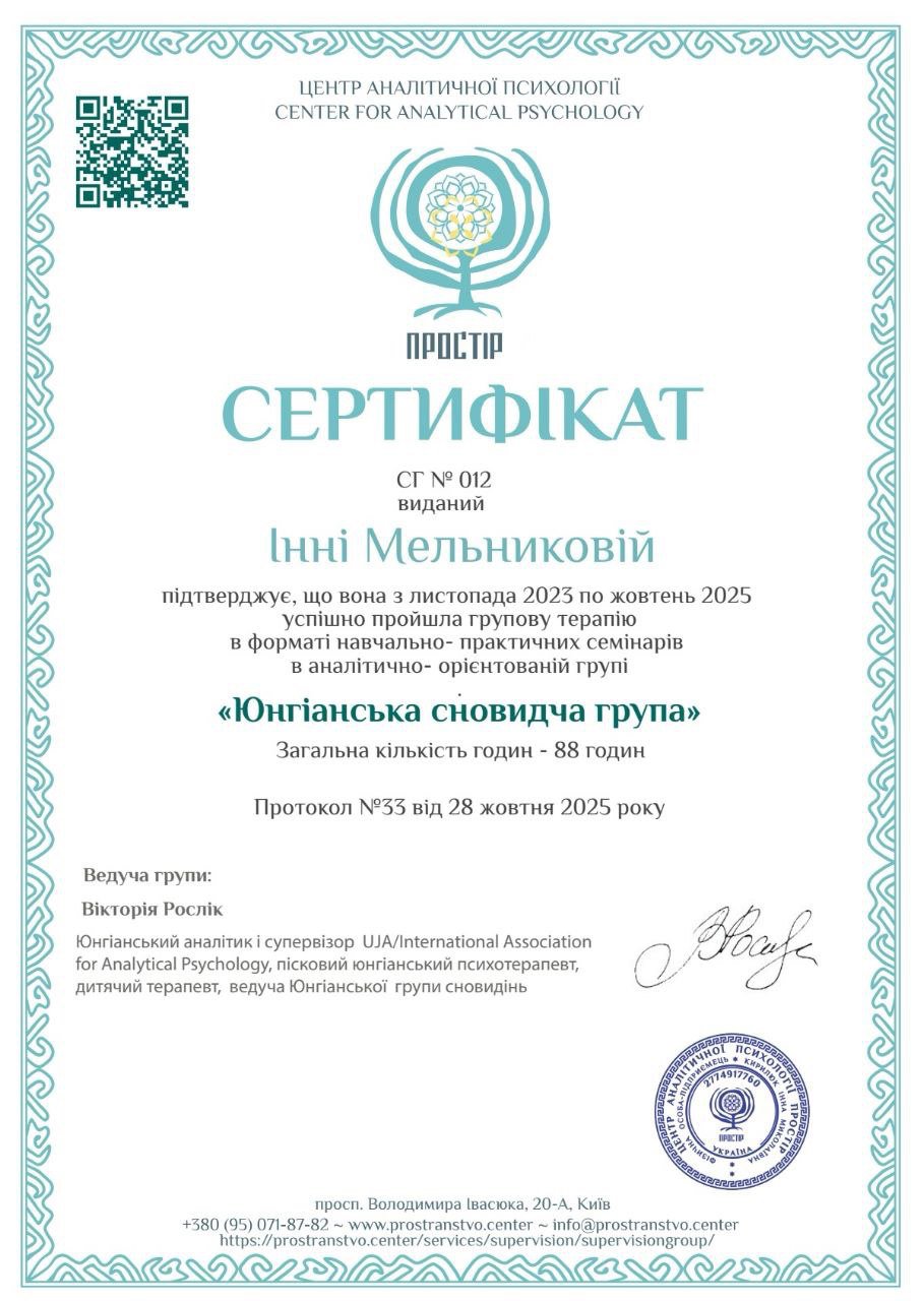 Имею опыт личной трансформации – от состояния растерянности и неуверенности до большего принятия себя, понимания своих чувств и внутренней опоры. Это помогает мне лучше чувствовать клиента и быть рядом в сложных процессах перемен.