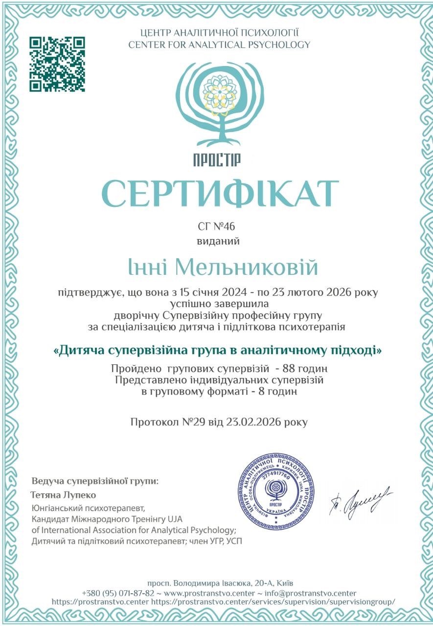 Регулярно прохожу супервидение и собственную терапию, являющуюся важной частью моей профессиональной практики.