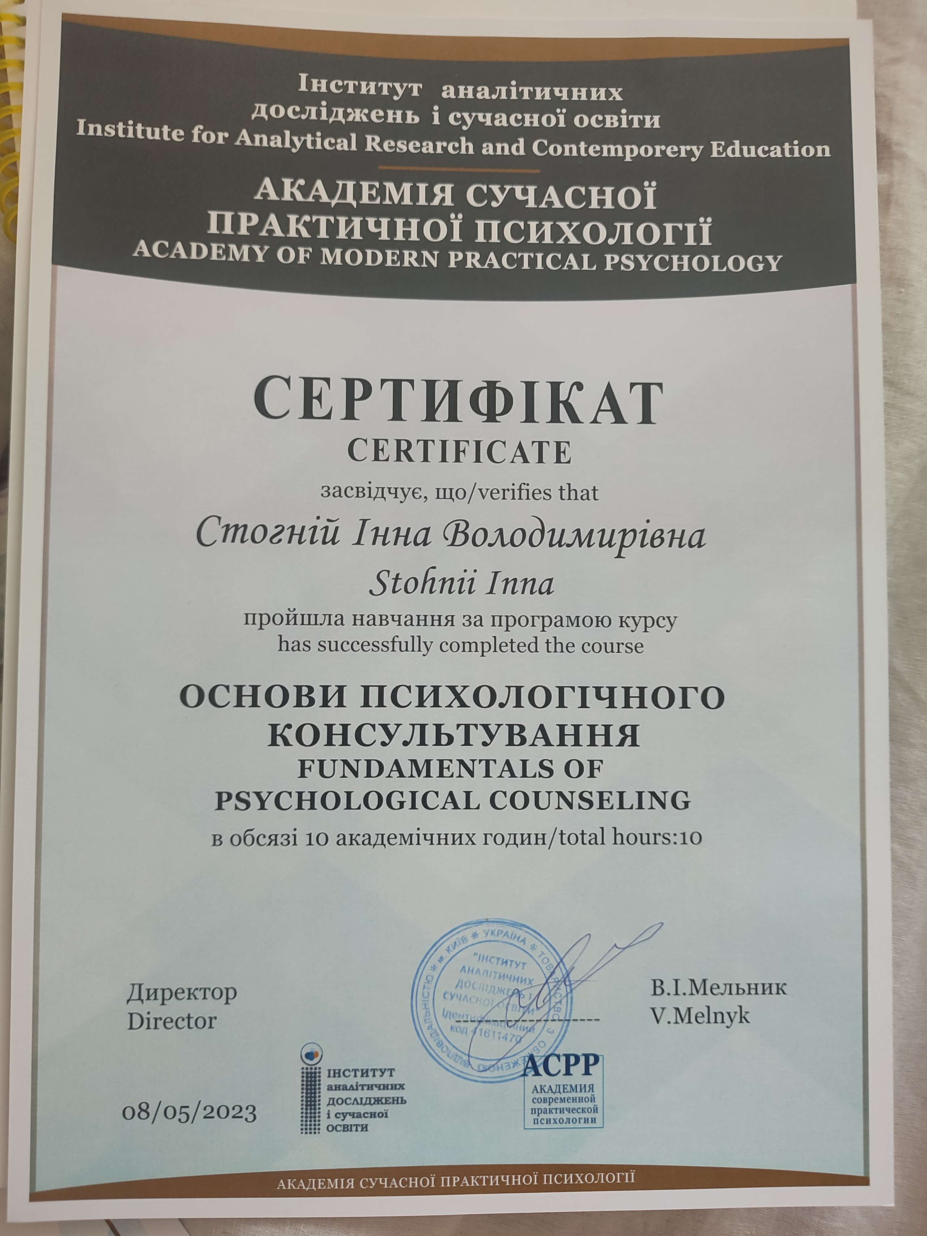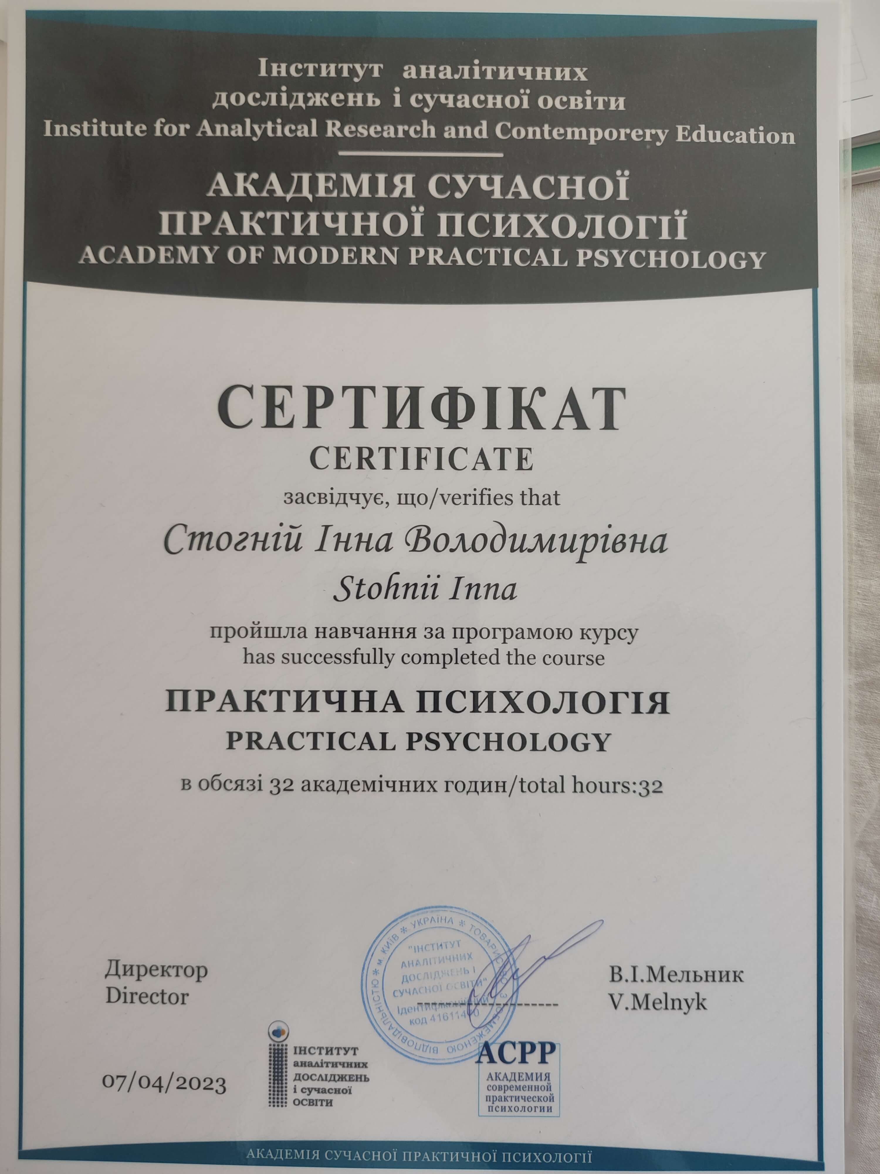 Інститут аналітичних досліджень і сучасної освіти.Академия независимости: дипломированный аддиктолог, У Ирина Ромашкан.