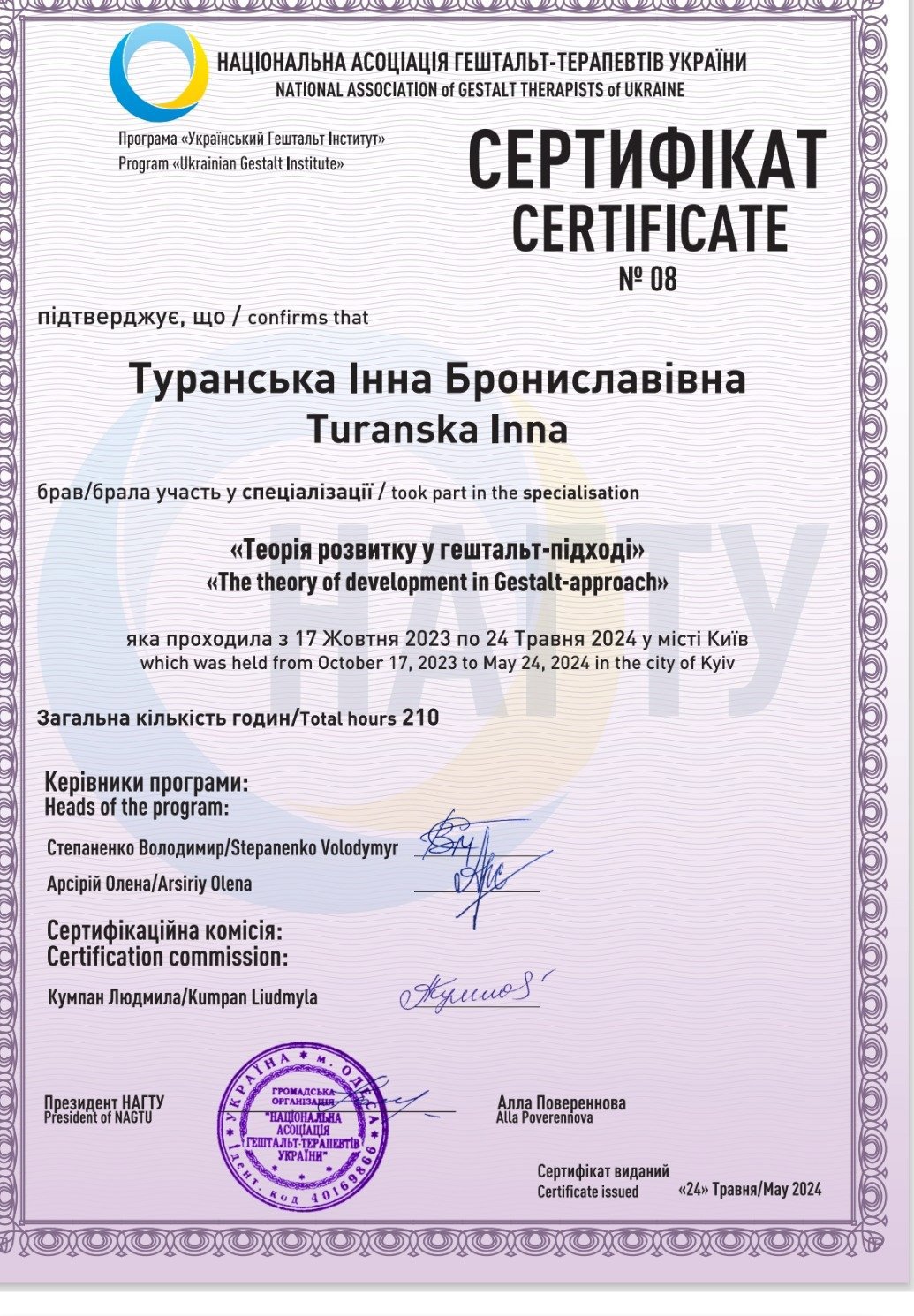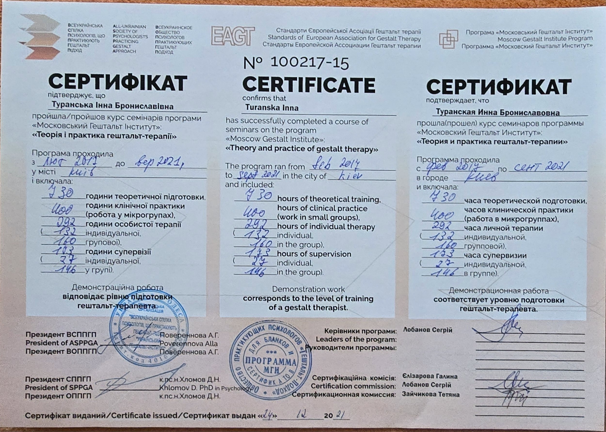 В 2021 году я была, безусловно, сертифицирована НАГТУ Теория и практика гештальт-терапии. Преподаватели С. Лобанов, Т. Зайчикова.