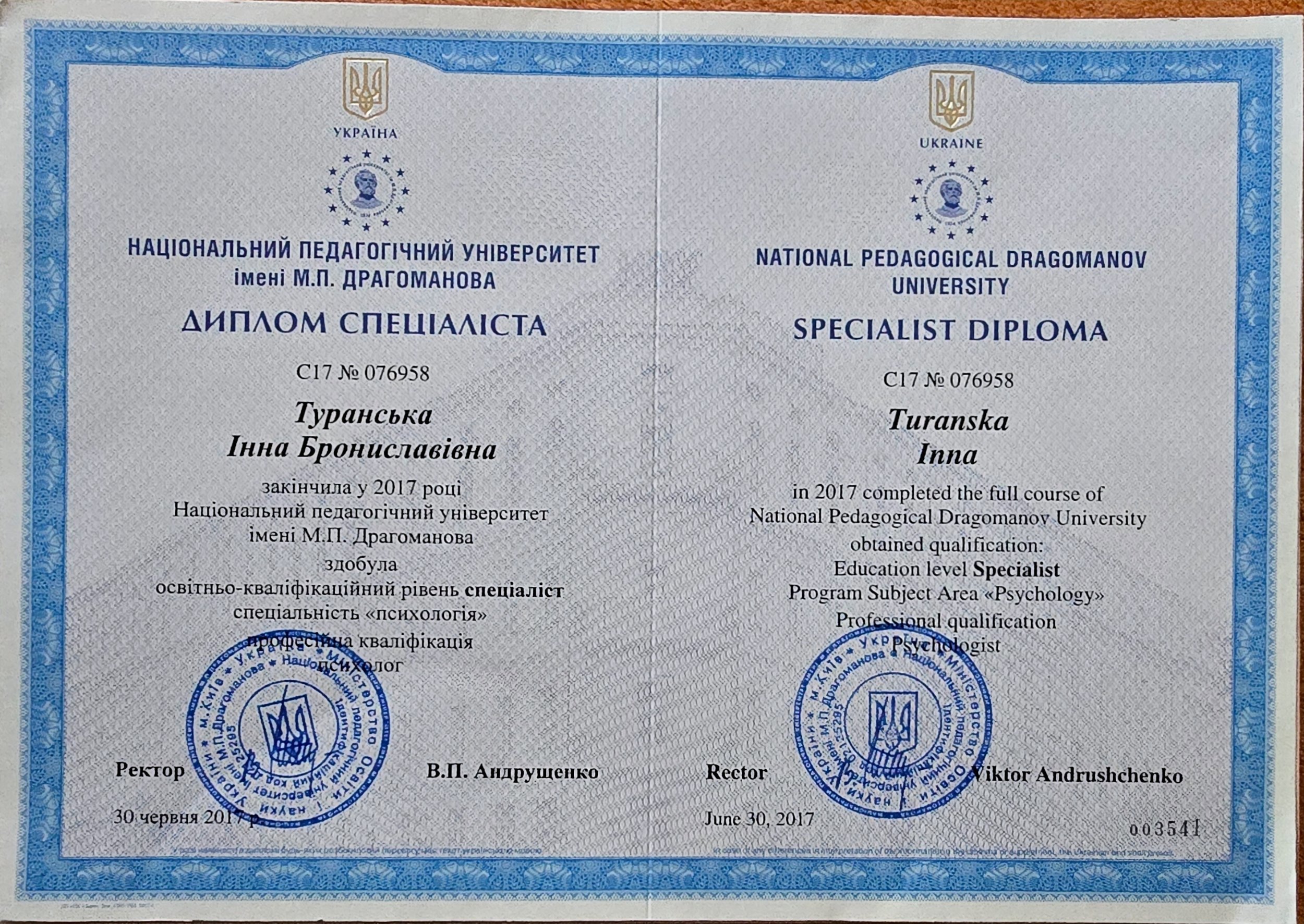 В 2017 году я получила третье высшее образование, окончив Национальный педагогический университет имени М.П. Драгоманова и образовательно-квалификационный уровень специалист специальность Психология. Профессиональная квалификация Психолог.