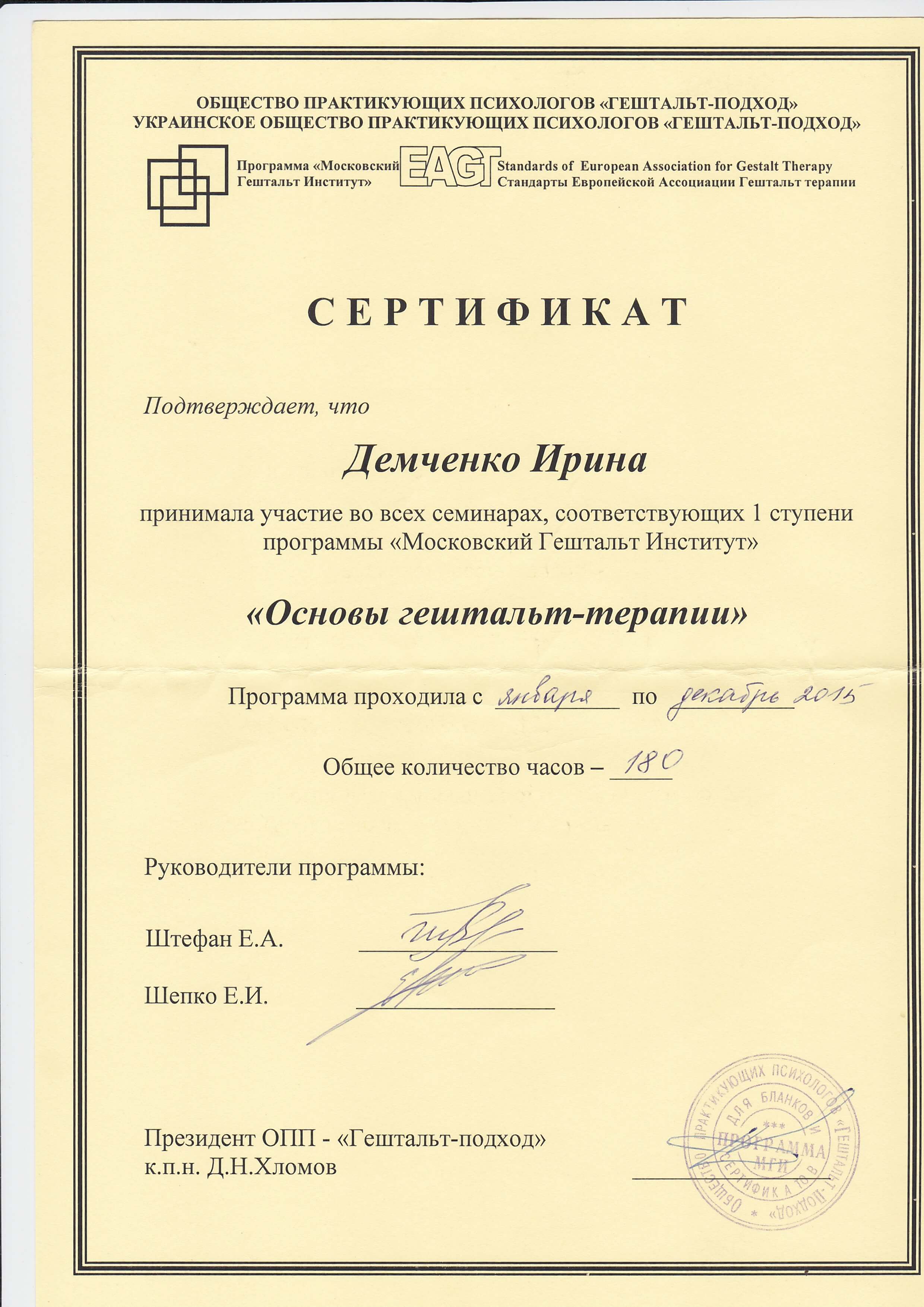 Закінчила програму підготовки гештальт-терапевтів МГІ (2-й ступінь);