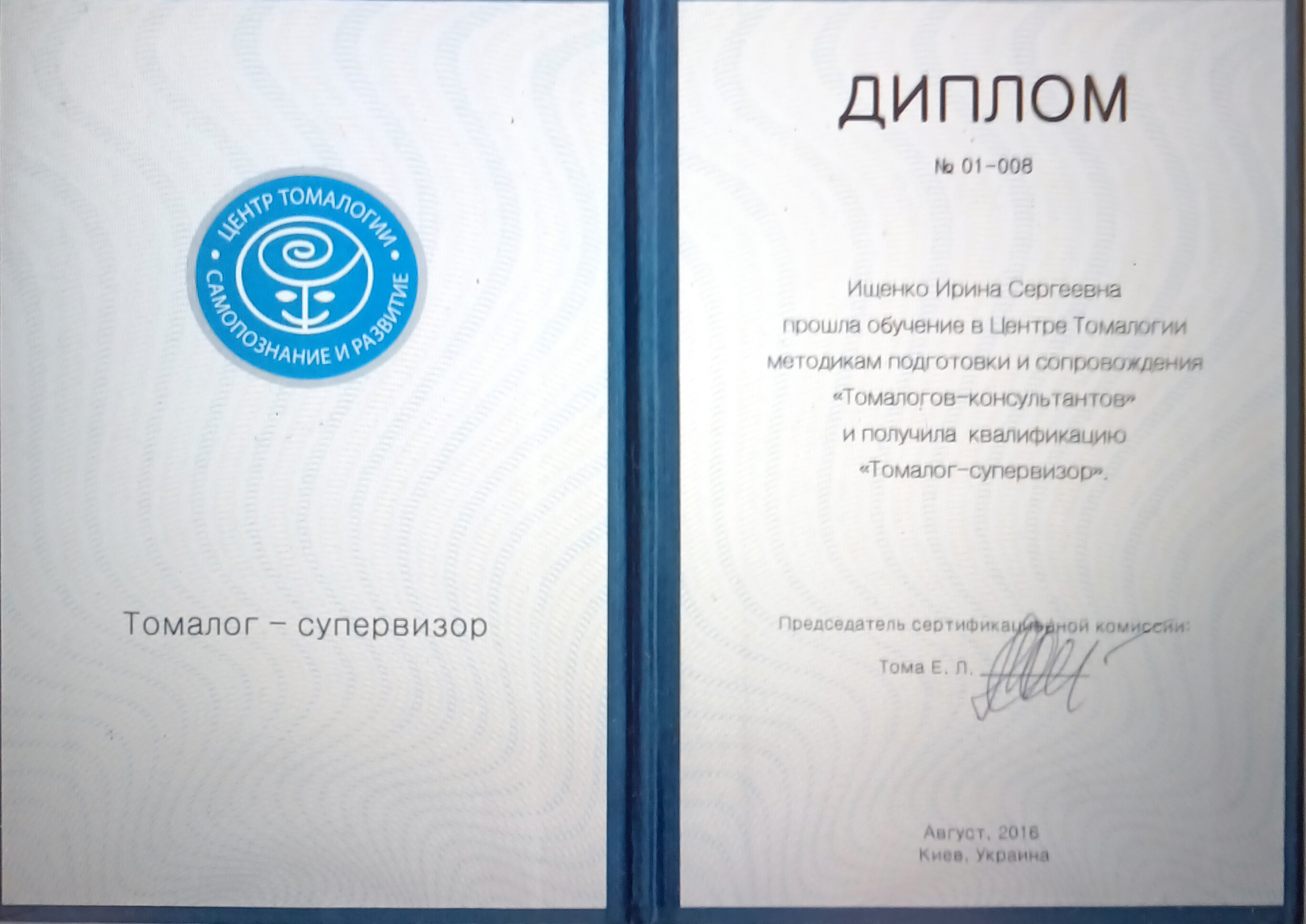 в 1992 году окончила Киевский государственный педагогический институт им. А. М. Горького, по специальности практическая психология, в 2018 году получила диплом томалога-супервизора в центре Томологии. Занимаюсь томологией с 1996 года по настоящее время и работаю в Центре Томологии с 2004 года.