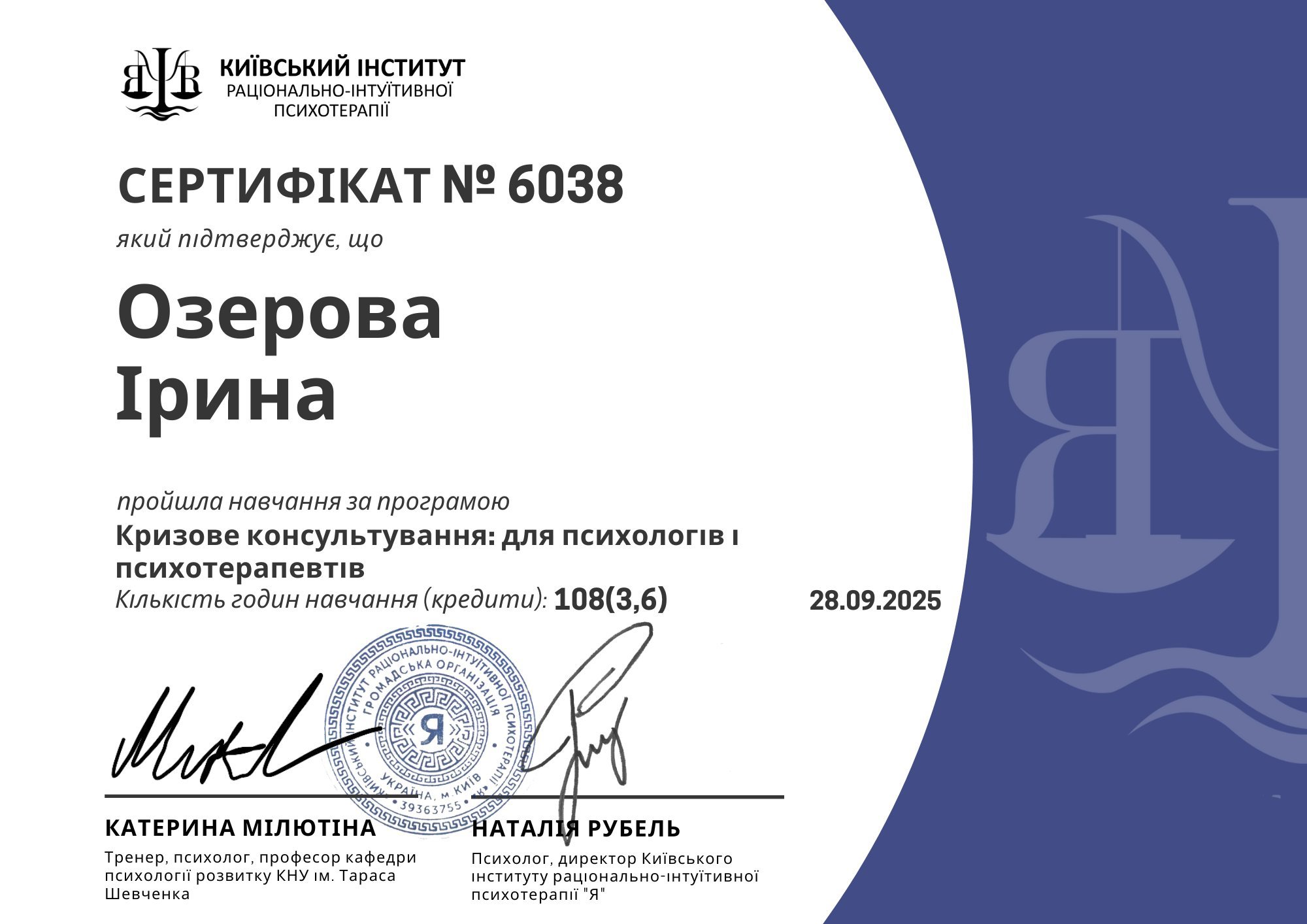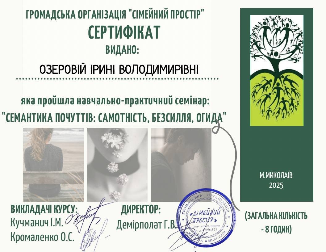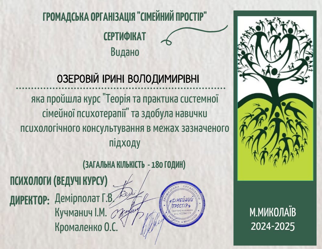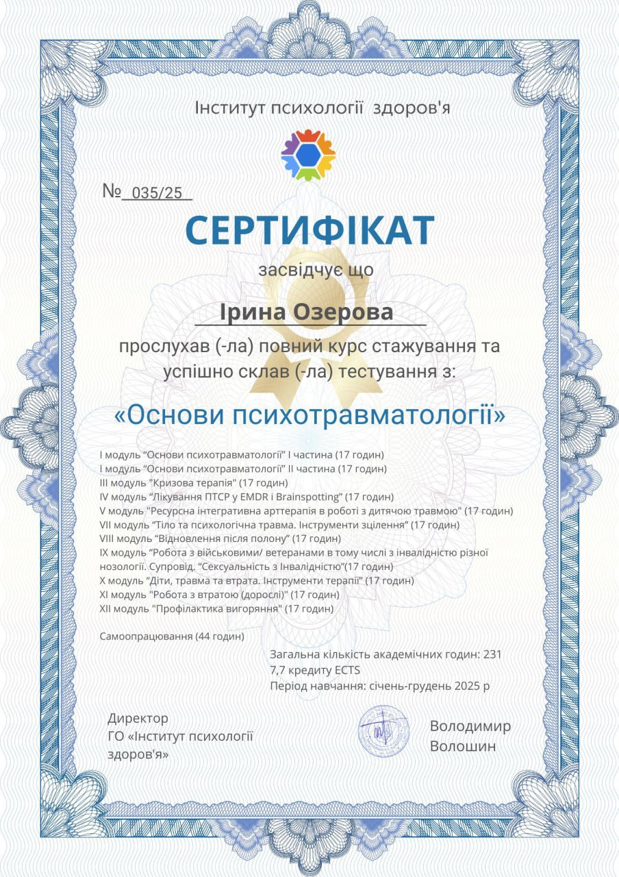 В своей работе я руководствуюсь ценностями безопасности, доверия и свободы выбора. Верю, что терапия – это не о контроле или указаниях, а о поддержке и возможности для человека найти собственный путь. Каждый мой клиент — самостоятельная личность, требующая не чужих решений, а только места для исследования себя и своих возможностей.