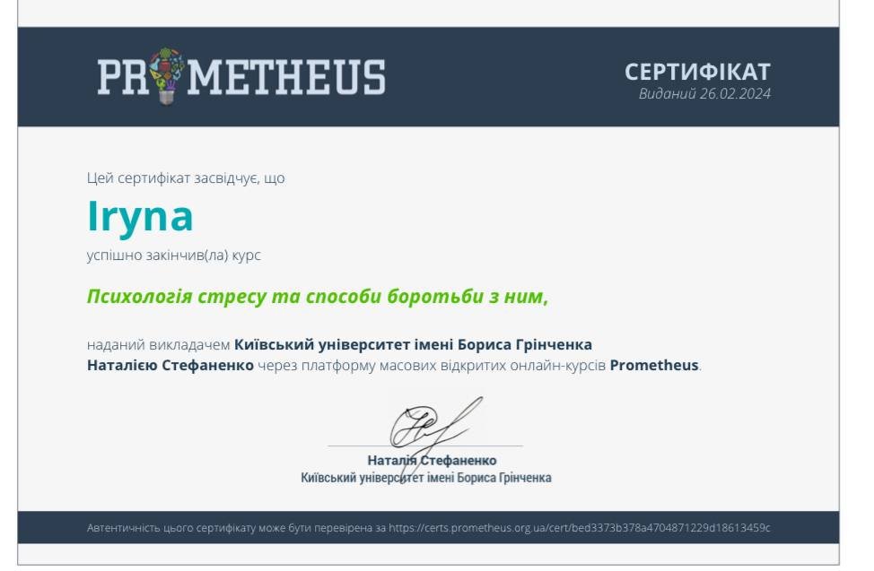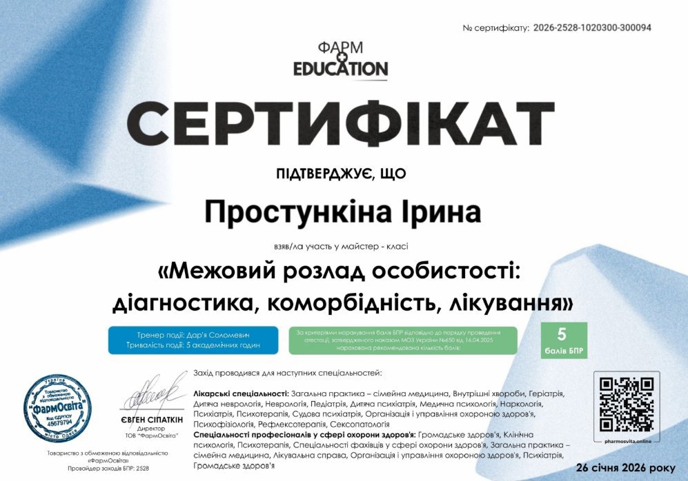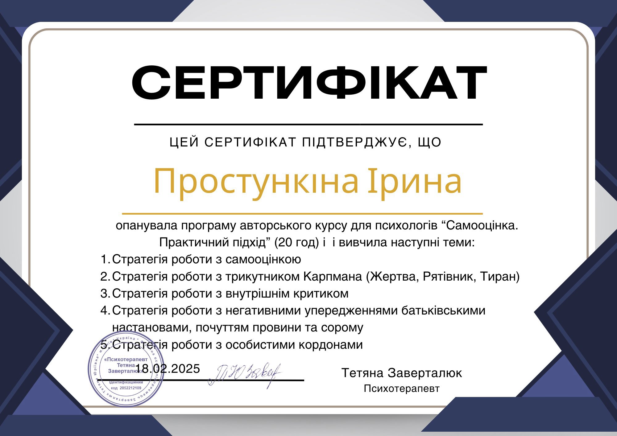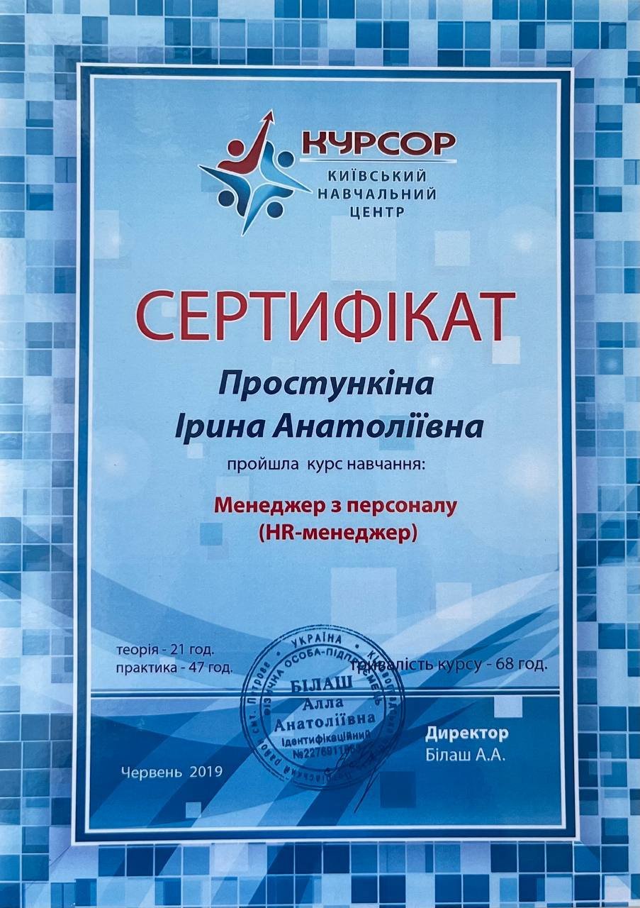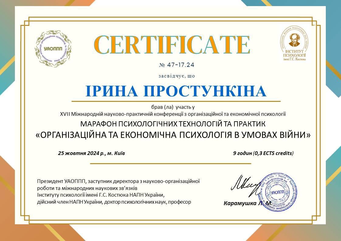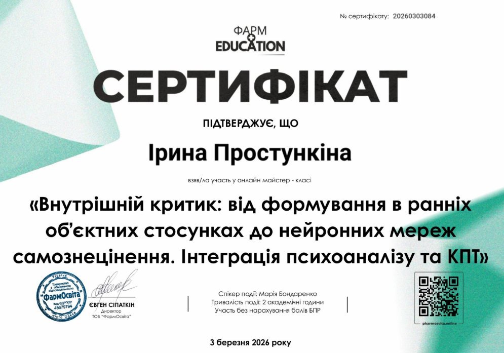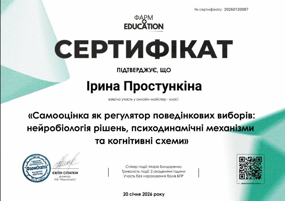 Постоянно повышаю квалификацию и прохожу дополнительные курсы по следующим направлениям: техники положительной психотерапии в работе с моральной травмой, организационная и экономическая психология, работа с самооценкой и самообесценением, внутренним критиком, негативными убеждениями, чувством вины и стыда, формирование личных границ и работа с треугольником Карп.