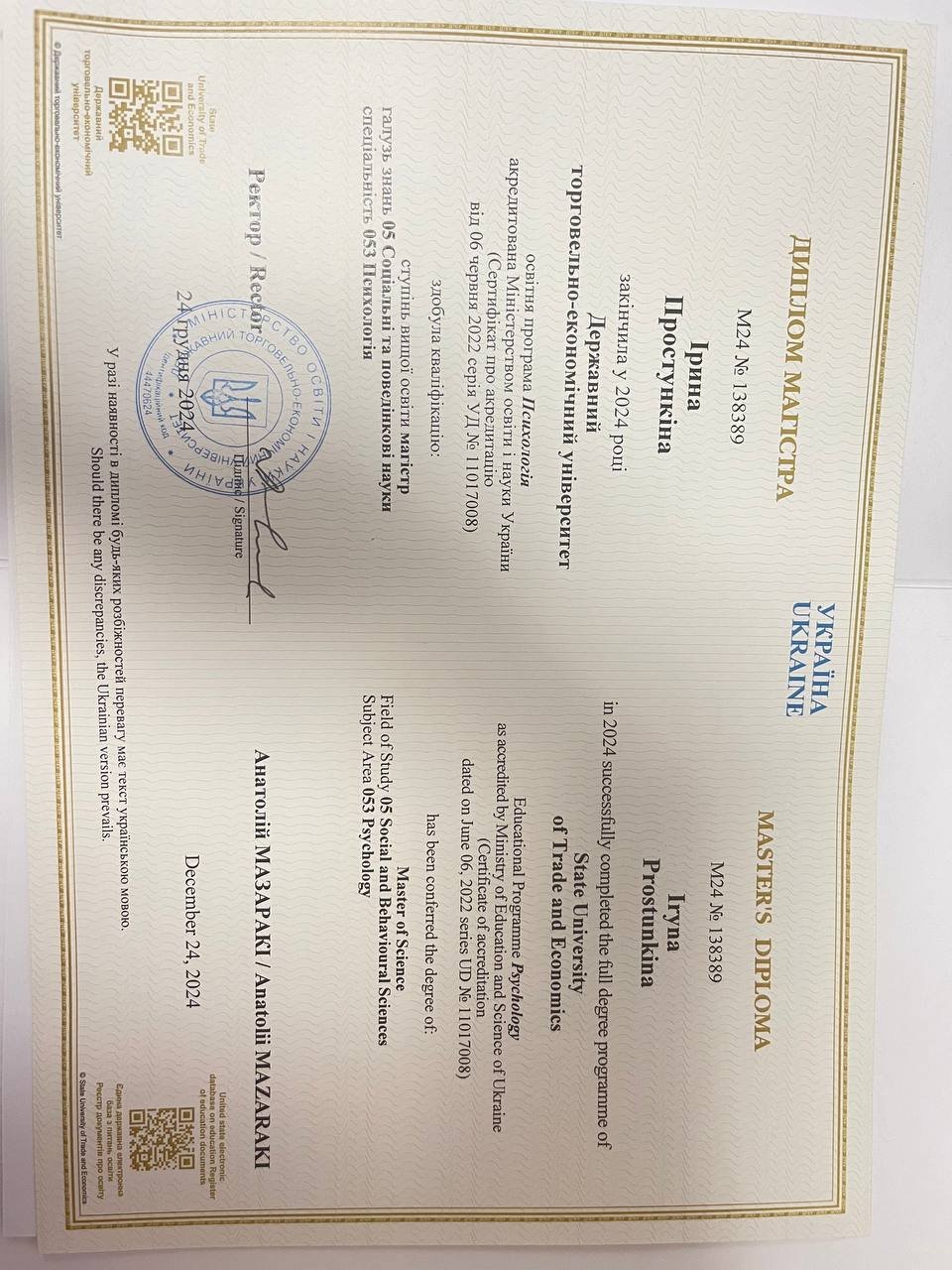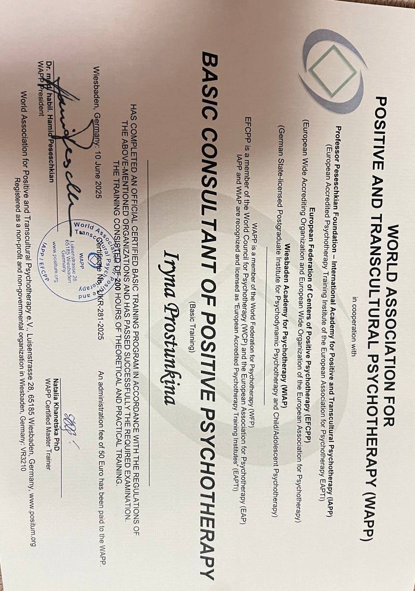 В 2024 году окончила магистратуру по специальности "Психология". Во время обучения проходила активную практическую подготовку и работала с клиентскими запросами в рамках практики и супервизии. После окончания учебы продолжаю консультативную практику. Имею сертификат базового консультанта по методу положительной психотерапии и завершаю обучение по программе «Семейный консультант по методу положительной психотерапии» в апреле 2026 года.