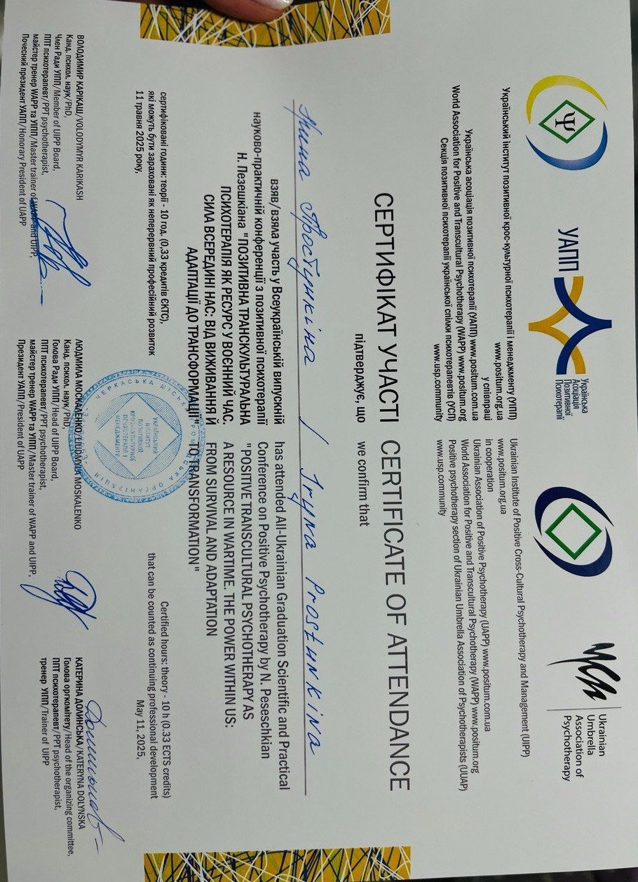 Всеукраїнська випускна науково-практична конференція з позитивної психотерапії 'ПОЗИТИВНО Я ТРАНСКУЛЬТУРАЛЬНА ПСИХОТЕРАПІЯ ЯК РЕСУРС У ВОЄННИЙ ЧАС: СИЛА ВСЕРЕДИНІ НАС: ВІД ВИЖИВАННЯ Й АДАПТАЦІЇ ДО ТРАНСФОРМАЦІЇ'