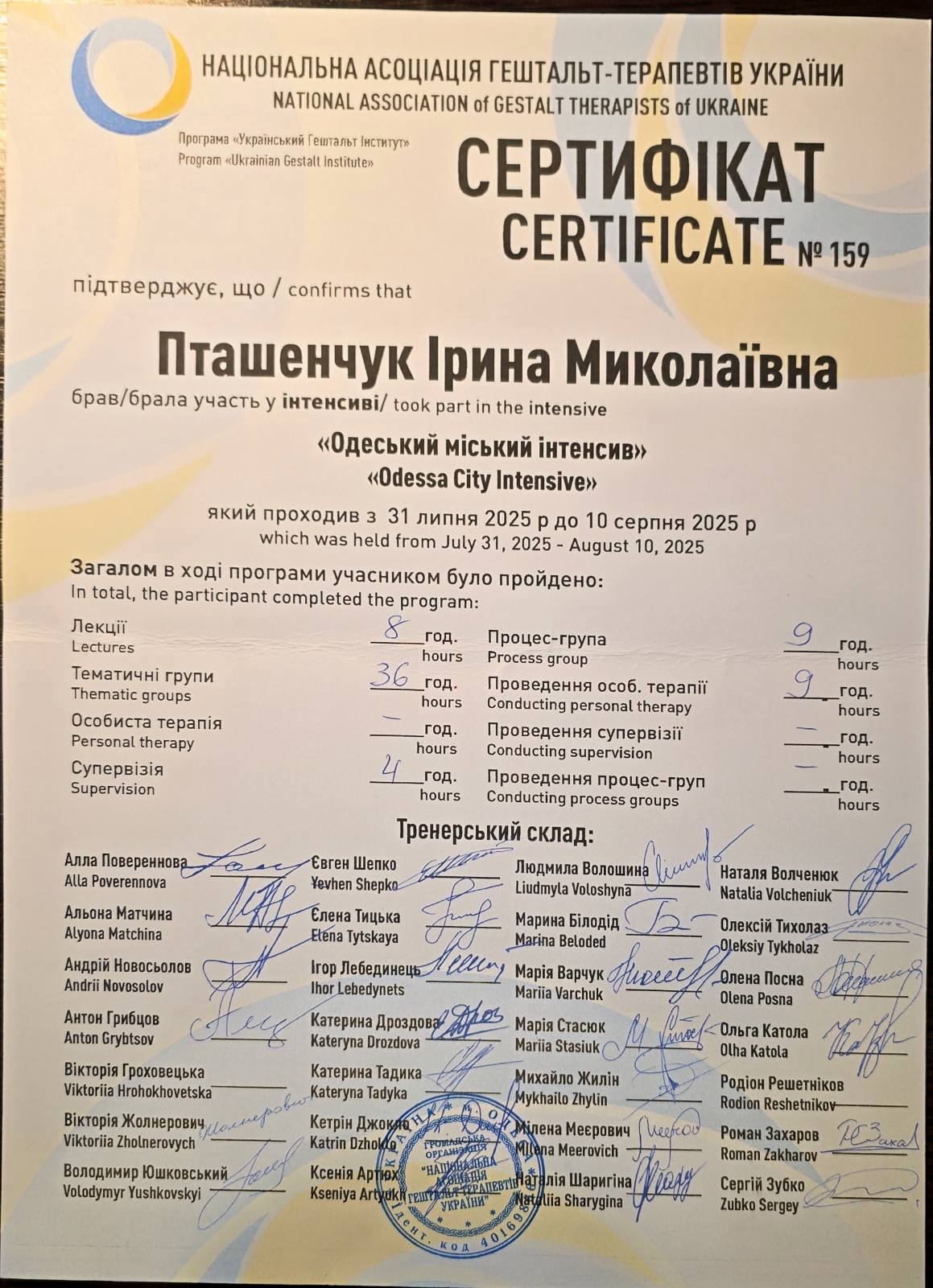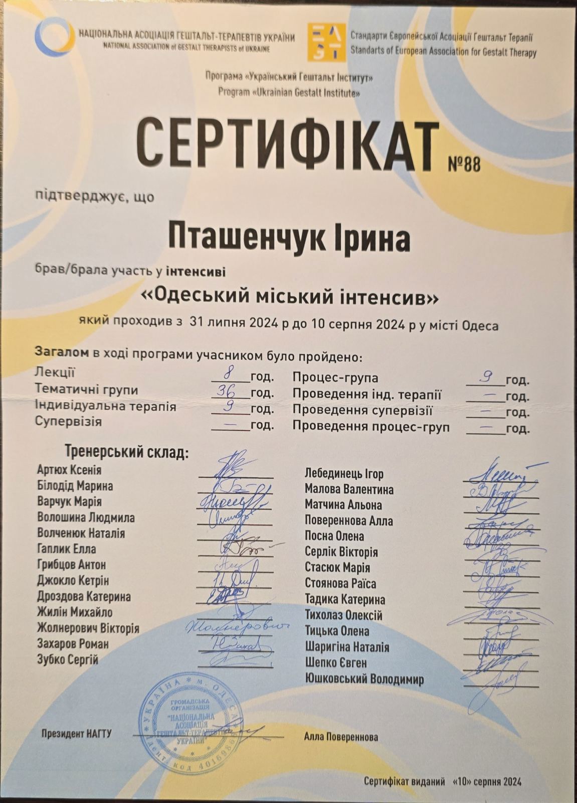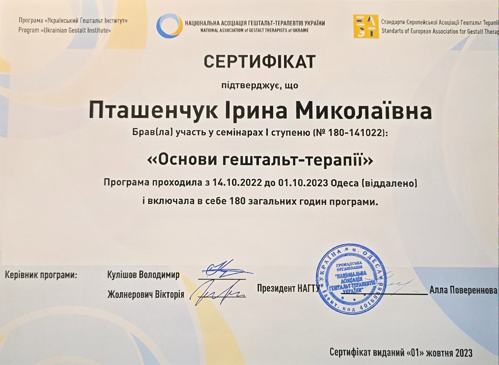 Национальная ассоциация гештальт-терапевтов Украины 1-ая степень. 180 общих часов программы.