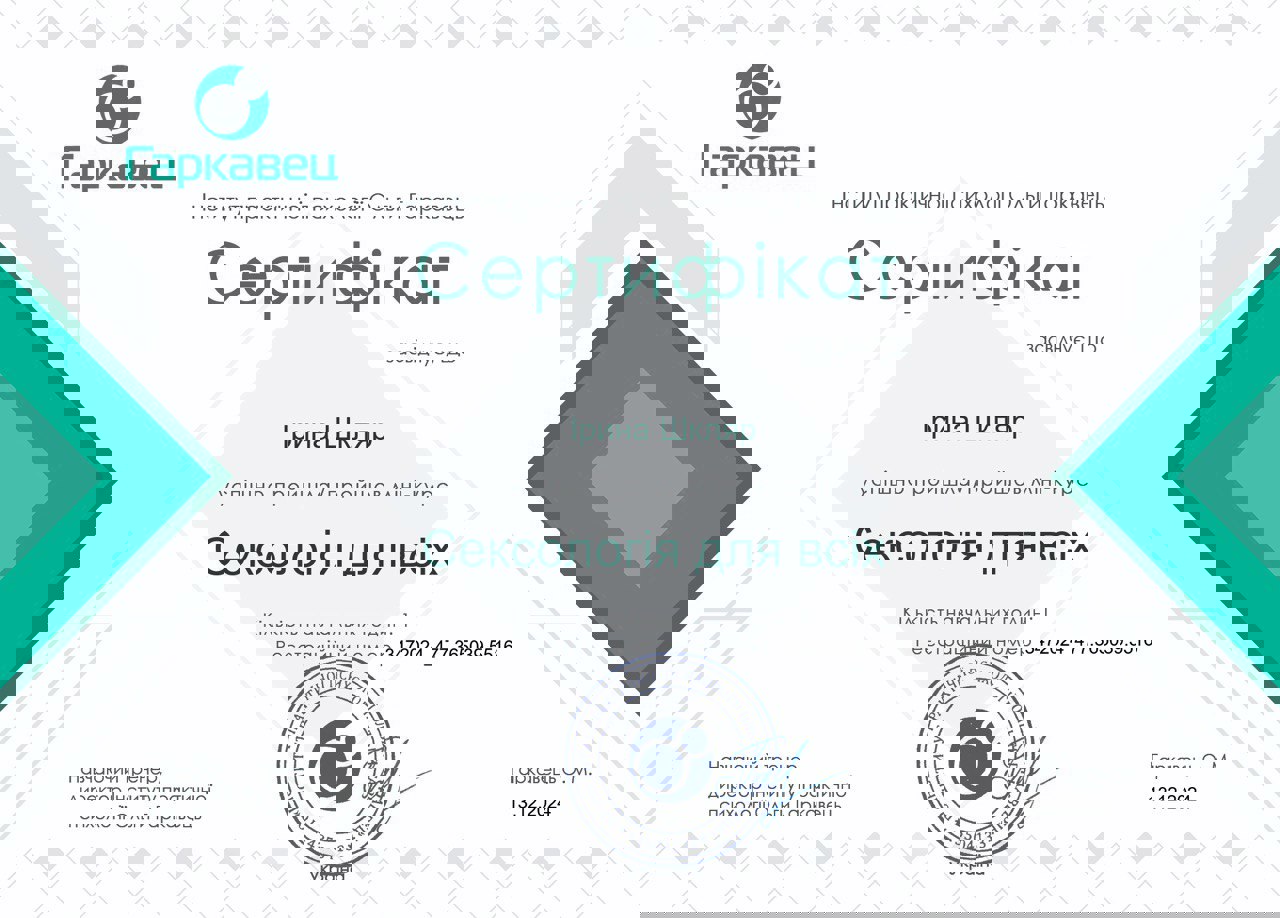5 лет опыта консультирования. Преподавание психологии в институте последипломного образования педагогических работников. В настоящее время работаю в отделении реабилитации государственного медицинского учреждения.