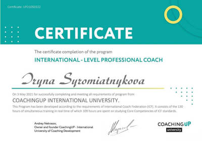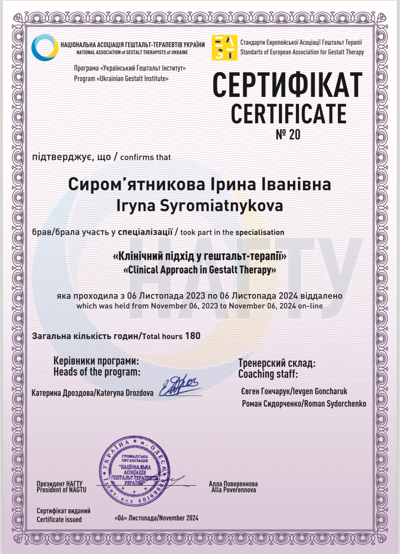 ХНУ им. Каразина (бакалавр/магистр) направление психология, в обучении II и III степень гештальт подход в институте гештальта Pogodin Academy, Коучинг в CoachingUP - International