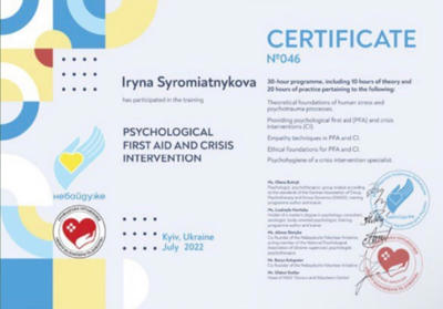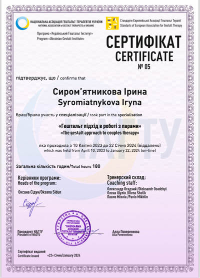 University of Coaching Development, специализации: Диалоговая модель гештальт-терапии, Работа с сексуальной тематикой в гештальт подходе, Гештальт подход в работе с парами, Первая психологическая помощь и кризисная интервенция, Клинический подход в гештальт-терапии (заканчиваю)