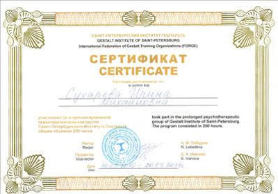 Квалификация: психолог; Санкт-Петербургский Институт Гештальта, гештальт терапевт