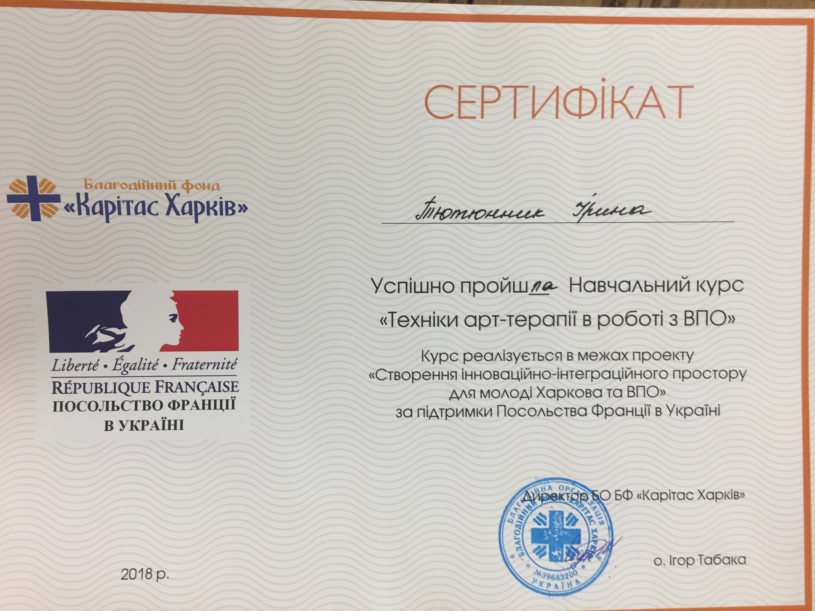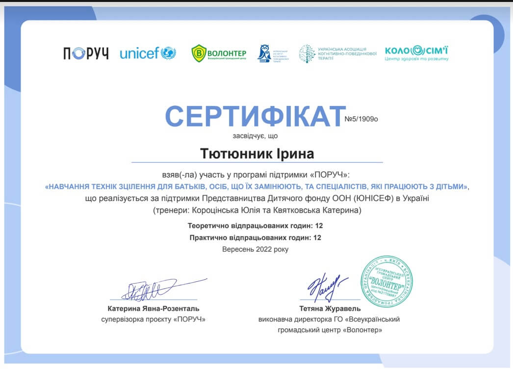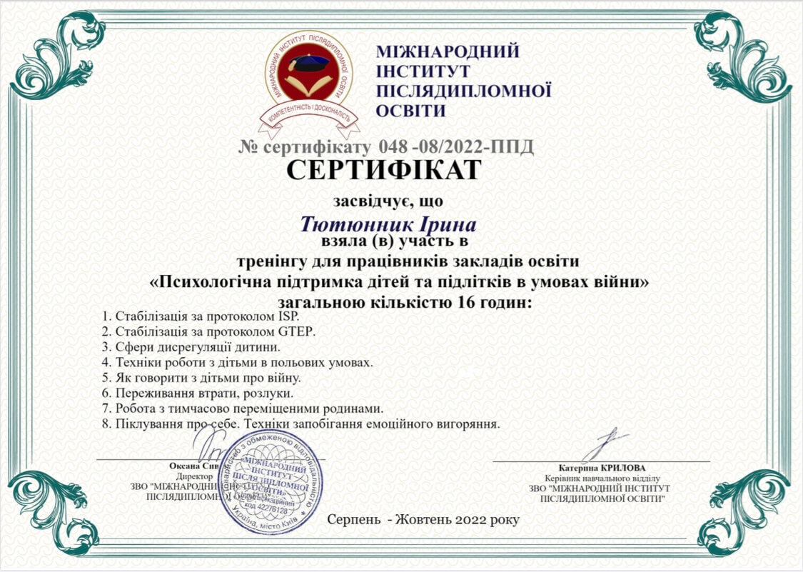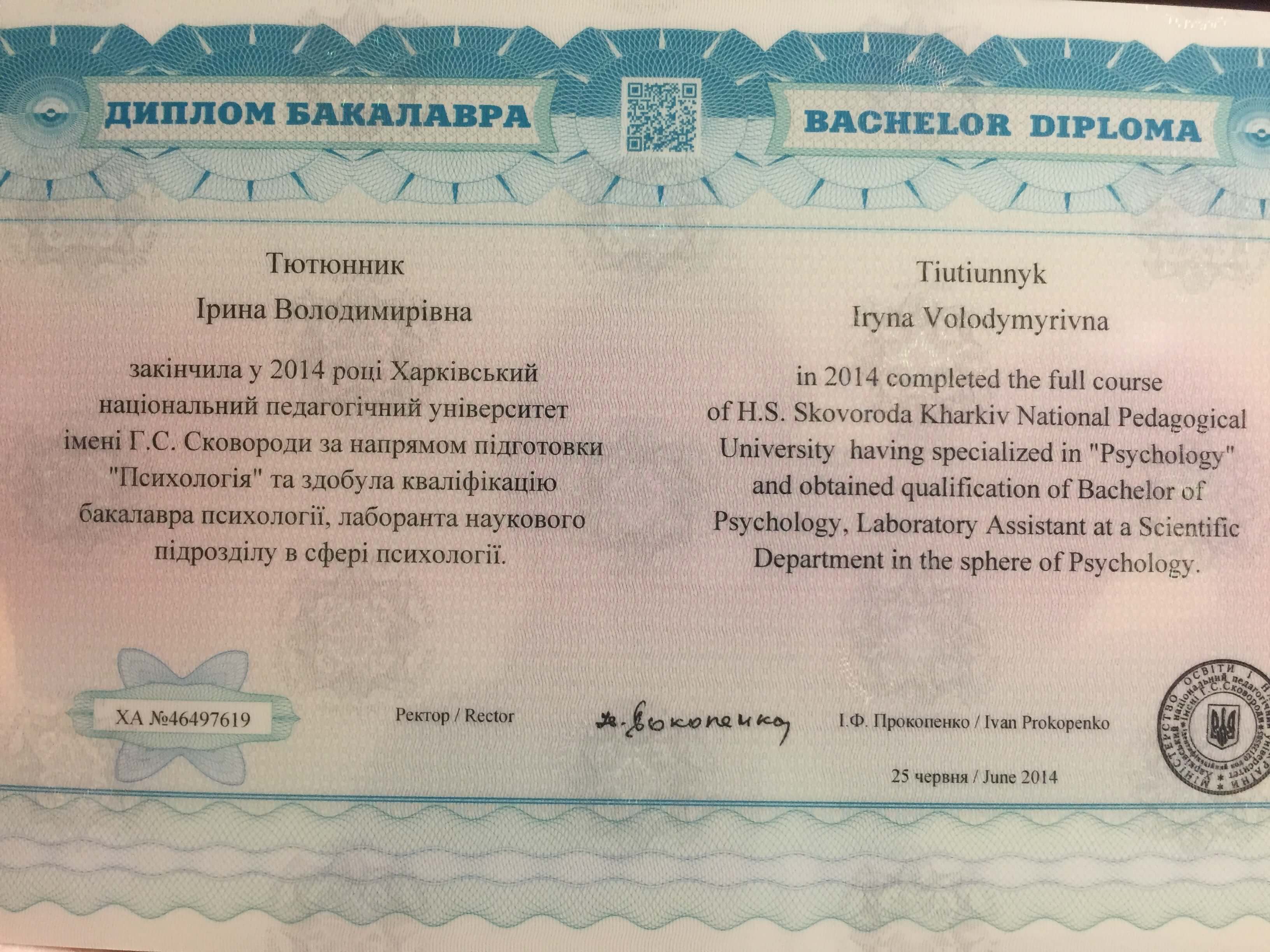 Первое среднее медицинское образование. Закончила Харьковский тазовый медицинский колледж 1. Закончила Харьковский педагогический университет имени Г.С. Сковороды, практический психолог, очно.