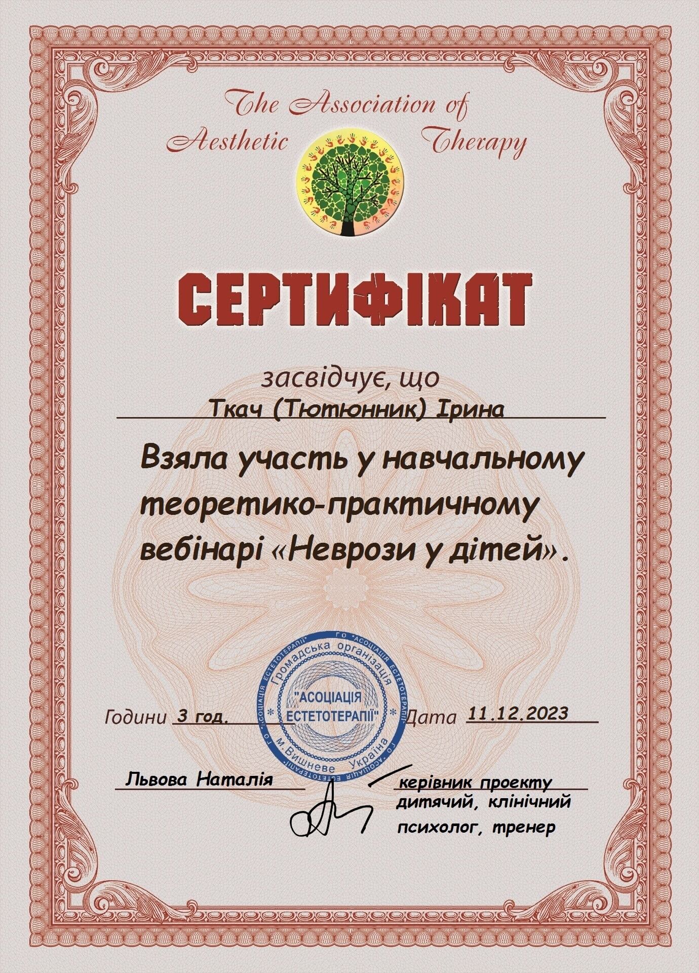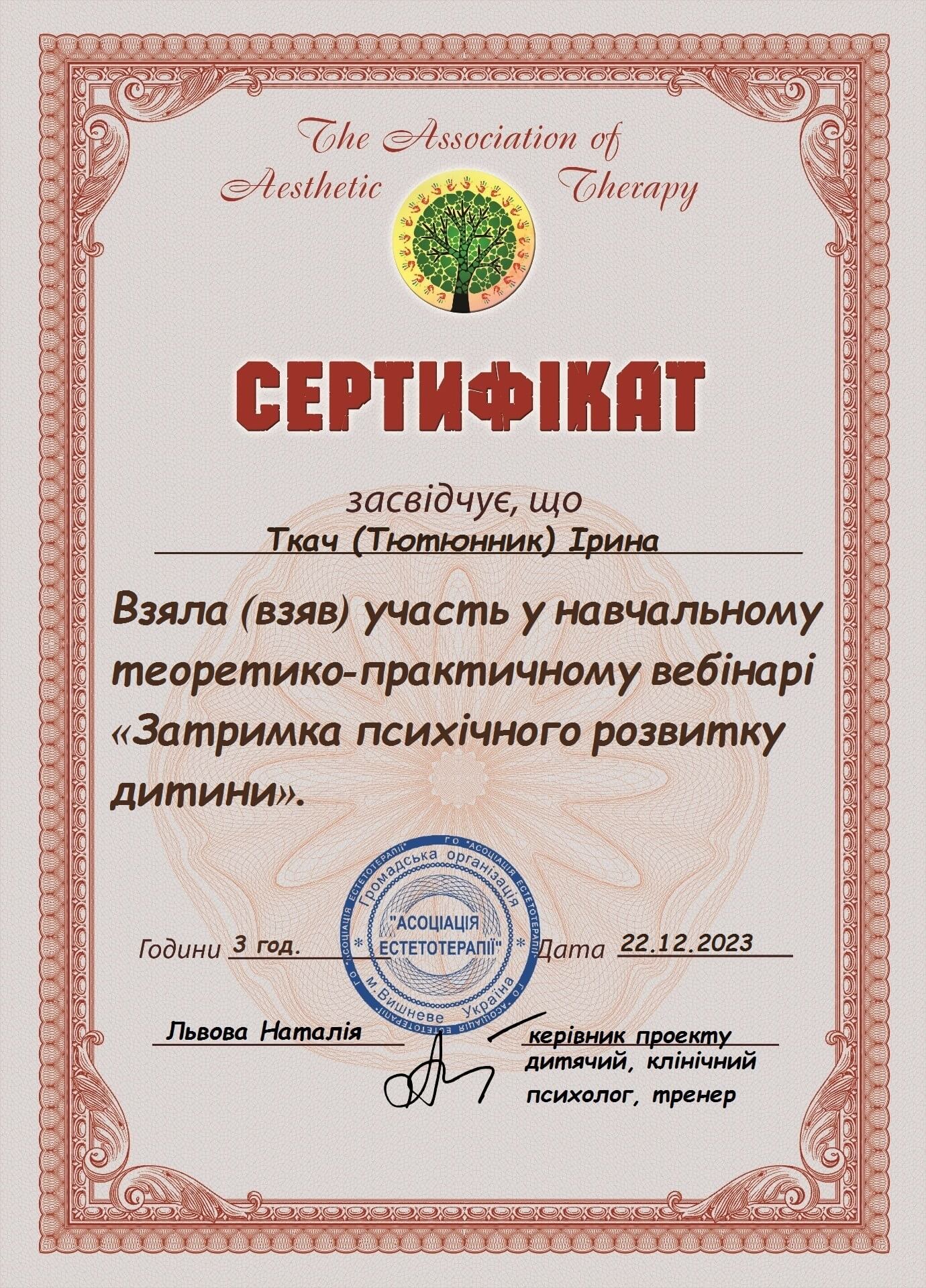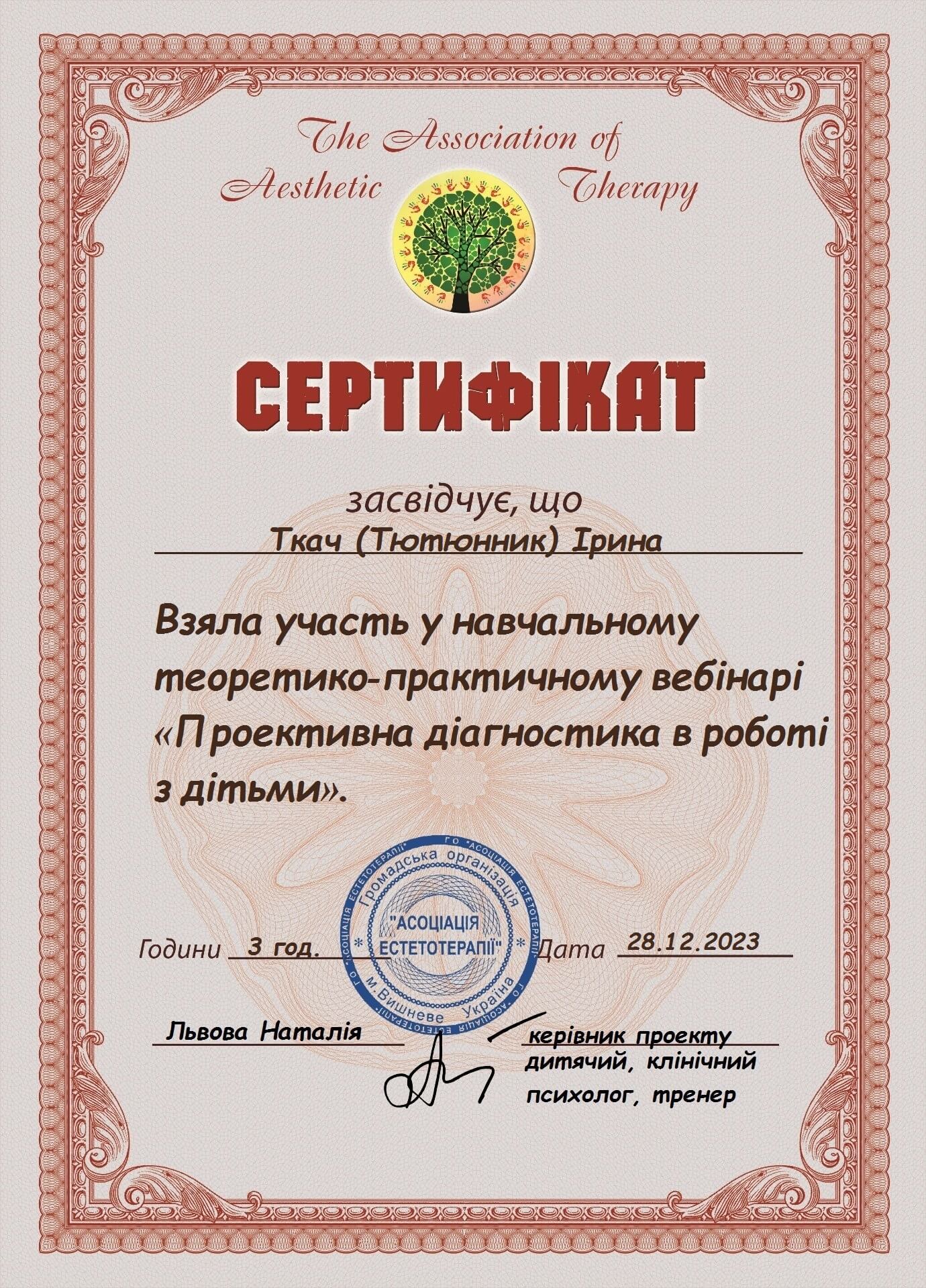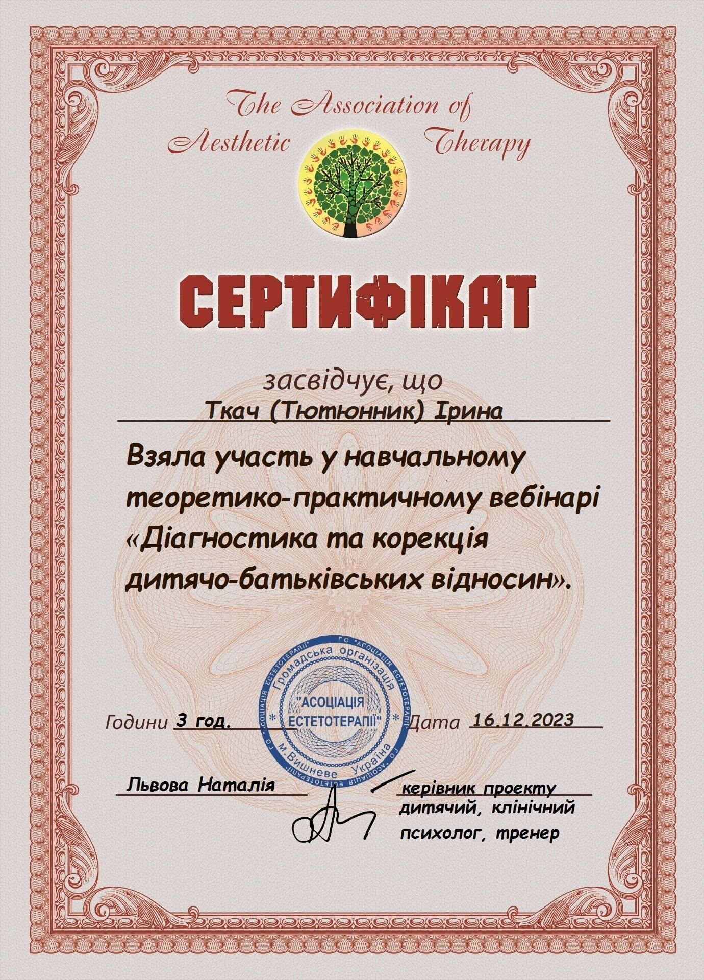 Первое среднее медицинское образование. Закончила Харьковский тазовый медицинский колледж 1. Закончила Харьковский педагогический университет имени Г.С. Сковороды, практический психолог, очно.