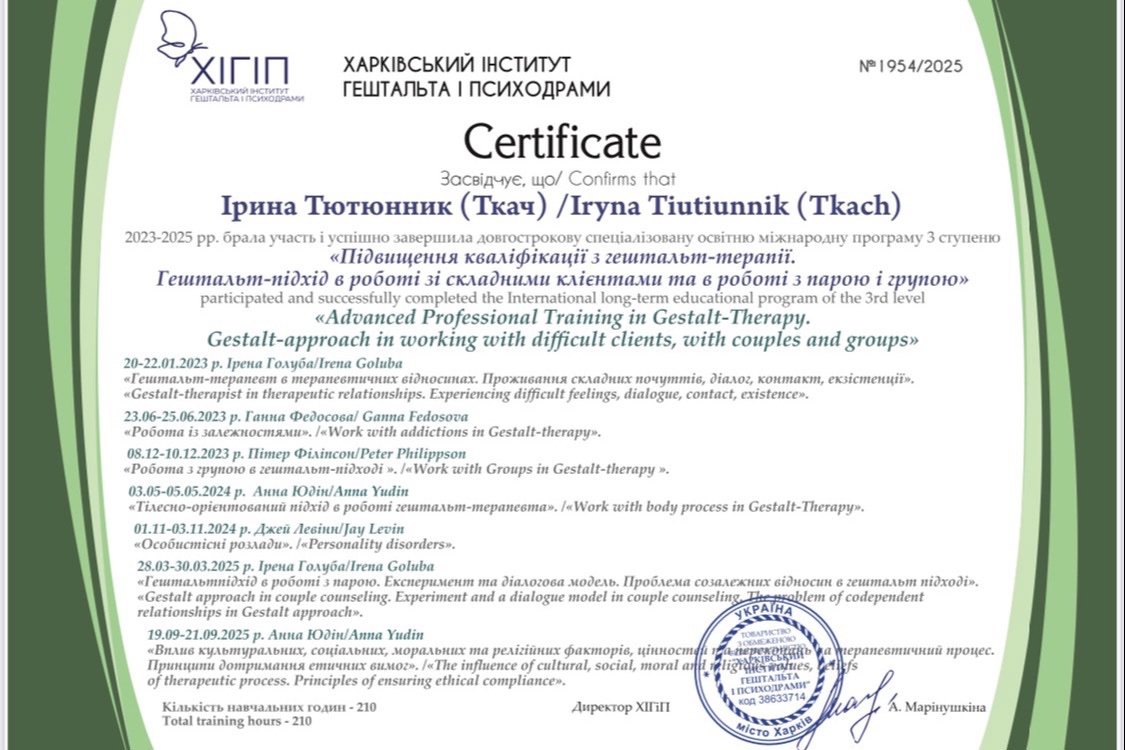 Открытая, коммуникабельная, умеющая слушать и слышать. Готова сопровождать вас на пути личных осознаний, в различных кризисных моментах и просто жизненных трудностях. Работаю в основном в гештальт подходе.