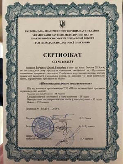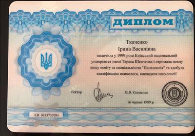КНУ имени Тараса Шевченко, диплом специалиста, психолог, преподаватель психологии. Курсы по детской практической психологии и песочной терапии. Повышение квалификации по психологическому консультированию в гештальтподходе на 152часа. На данный момент обучаюсь на второй ступени в УИСГТ, участник обучающей программы по аналитической психологии и консультирование методами КПТ взрослых клиентов.