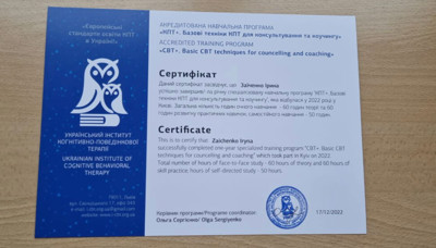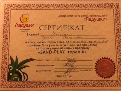 Прохожу обучение на второй ступени Украинского института Современной Гештальттерапии, также обучаюсь в программе “Грани Sandplay” ( юнгианская аналитическая психология),