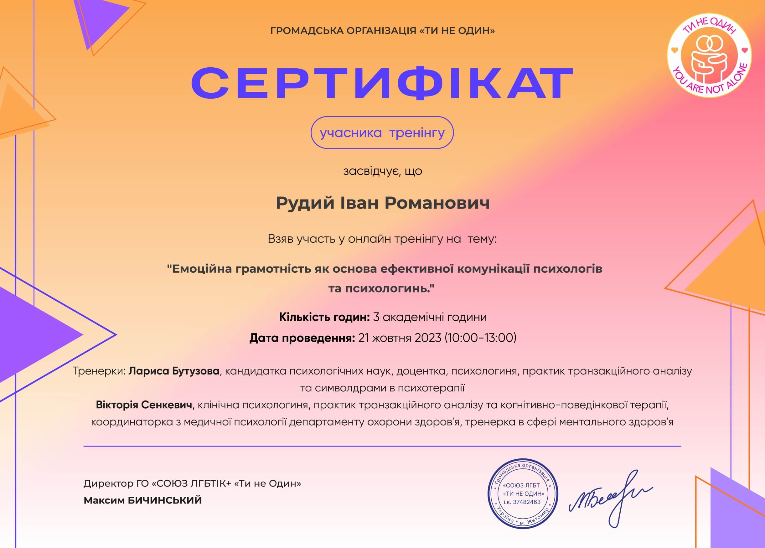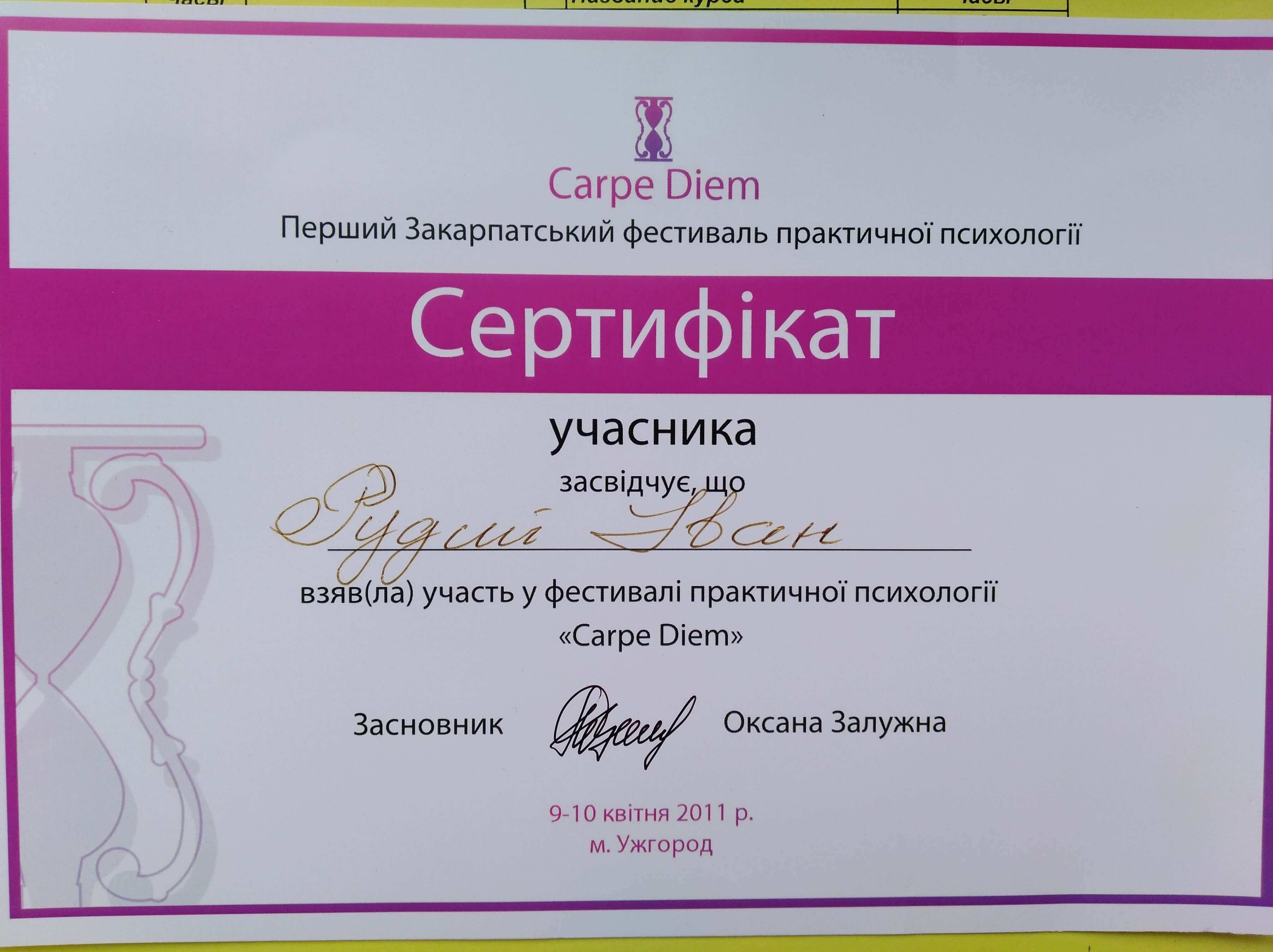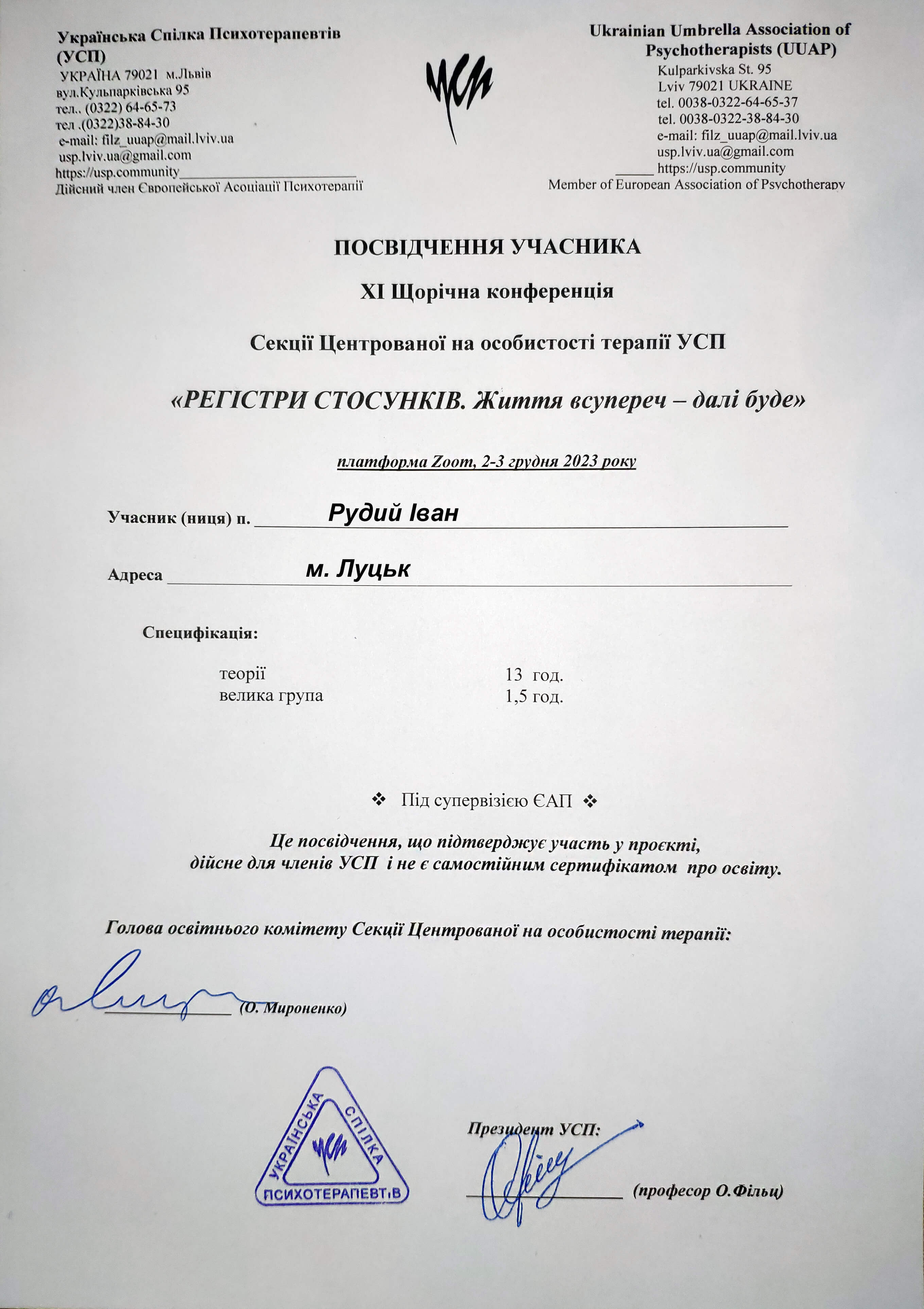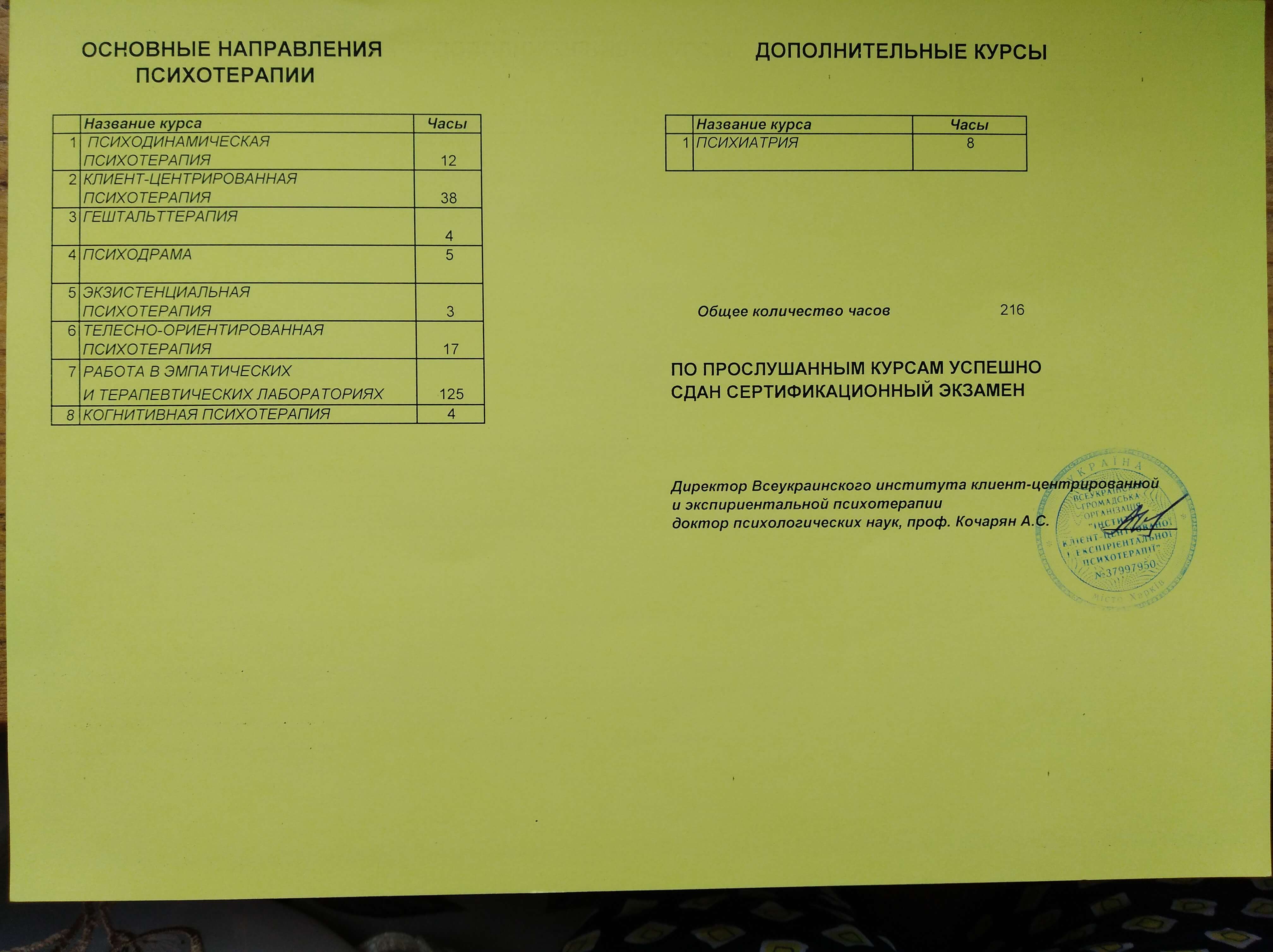Завершив курс навчальної програми по клієнтцентрованій психотерапії під керівництвом доктора психологічних наук, професора Кочаряна О.С.