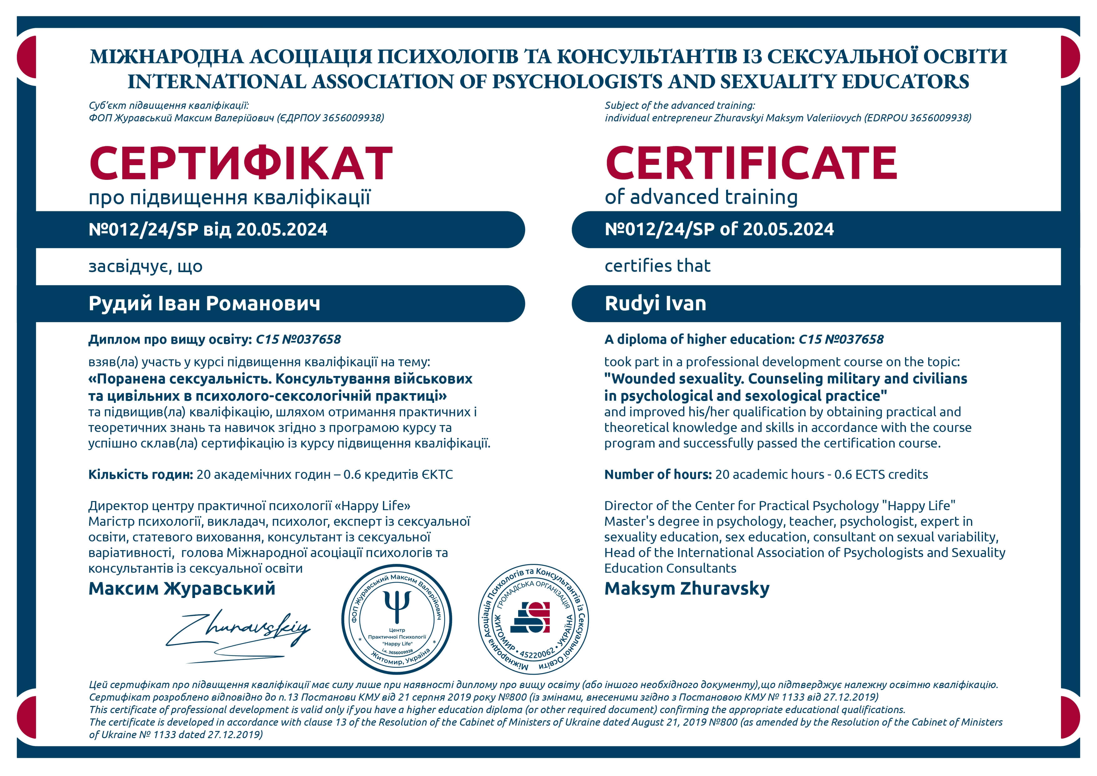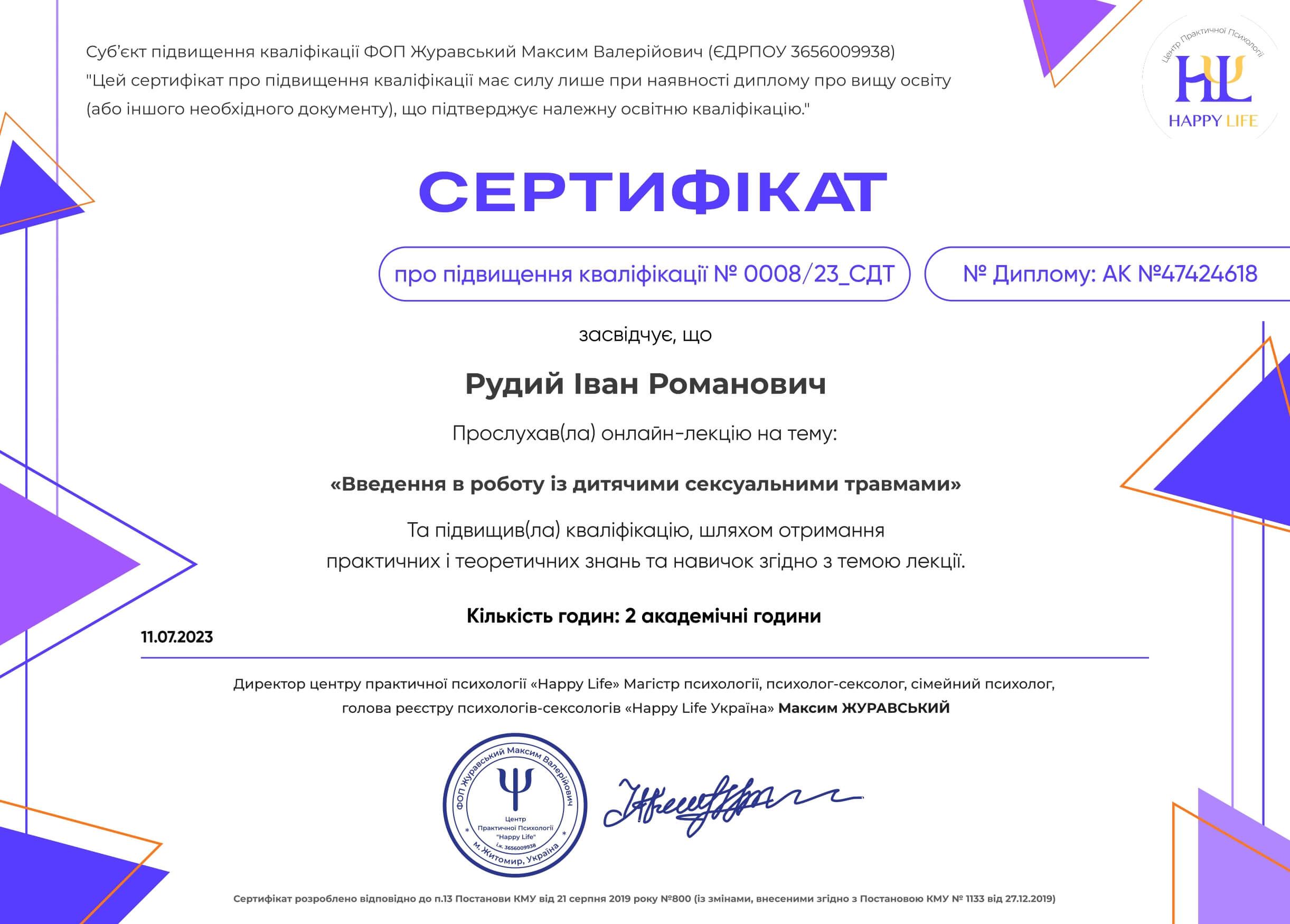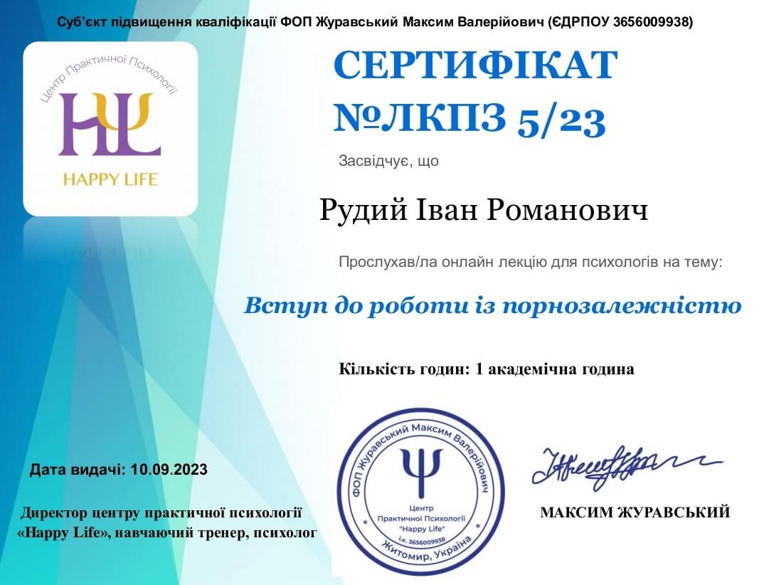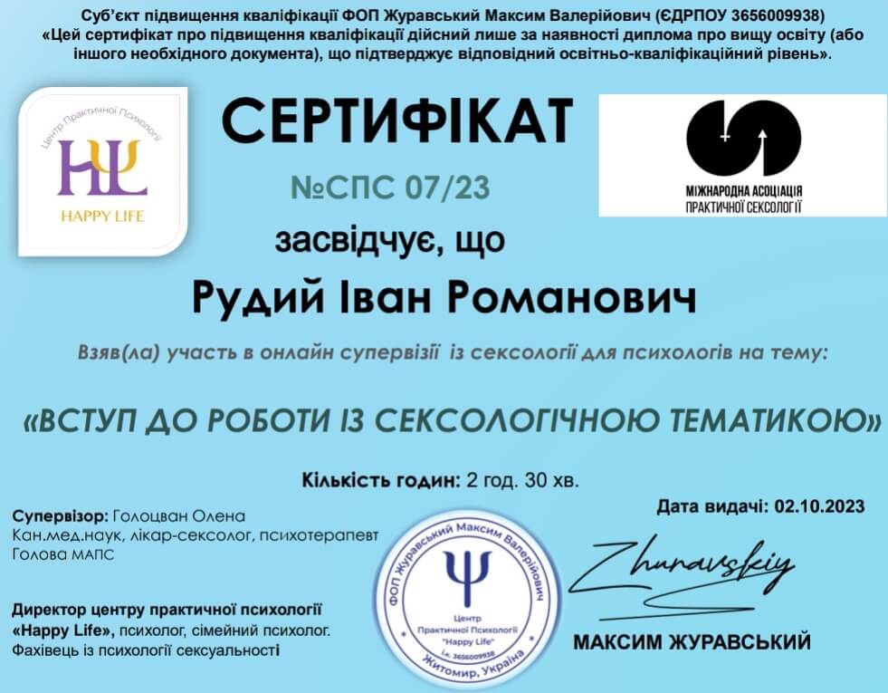 За час навчання в Луцьку почав отримувати здобуття фаху психотерапевта в галузі клієнт-центрованої психотерапії Карла Роджерса.