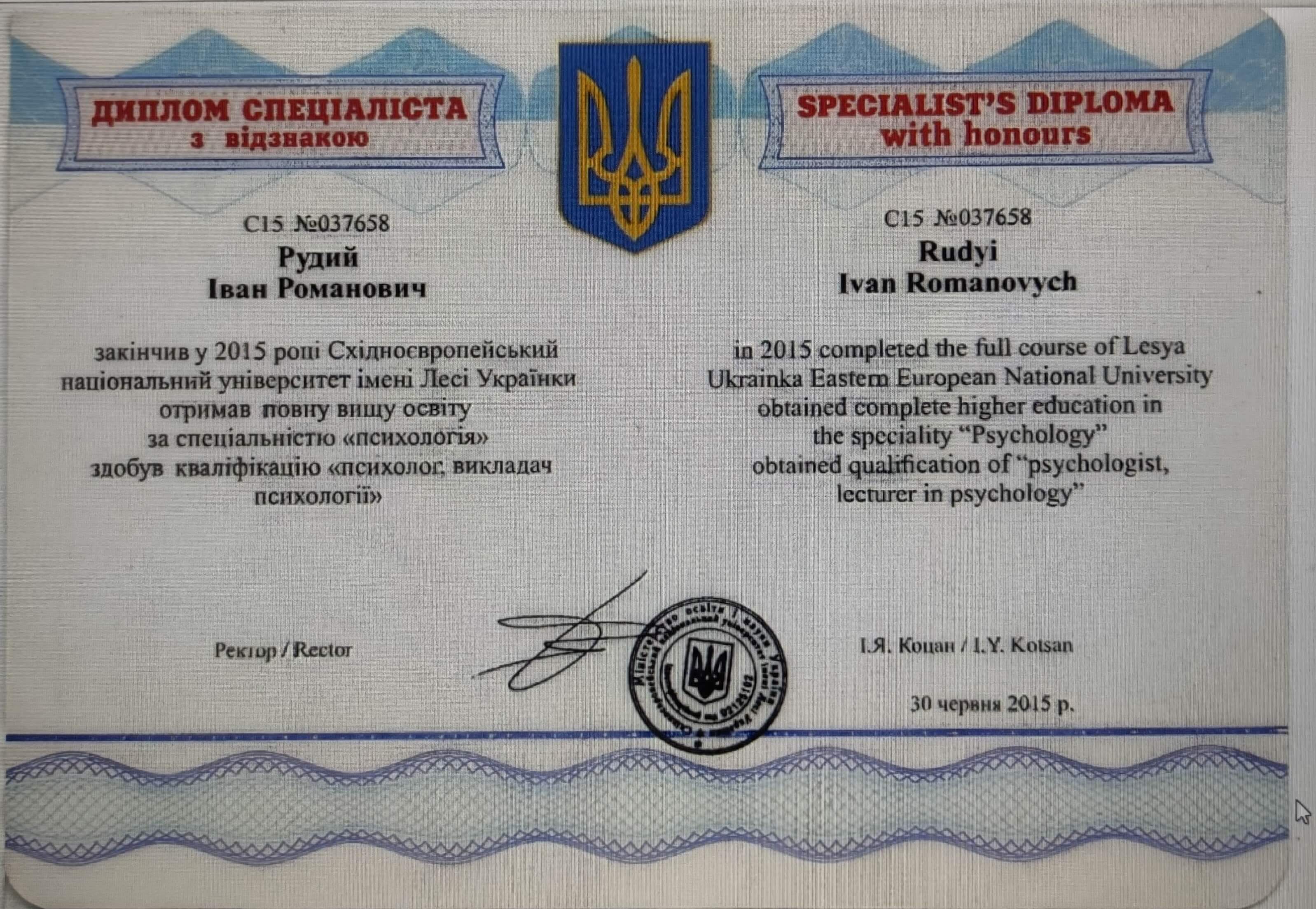 Східноєвропейський національний університет ім. Лесі Українки, Факультет психології, психолог, Луцьк, з 2014 по 2015 (1 рік)