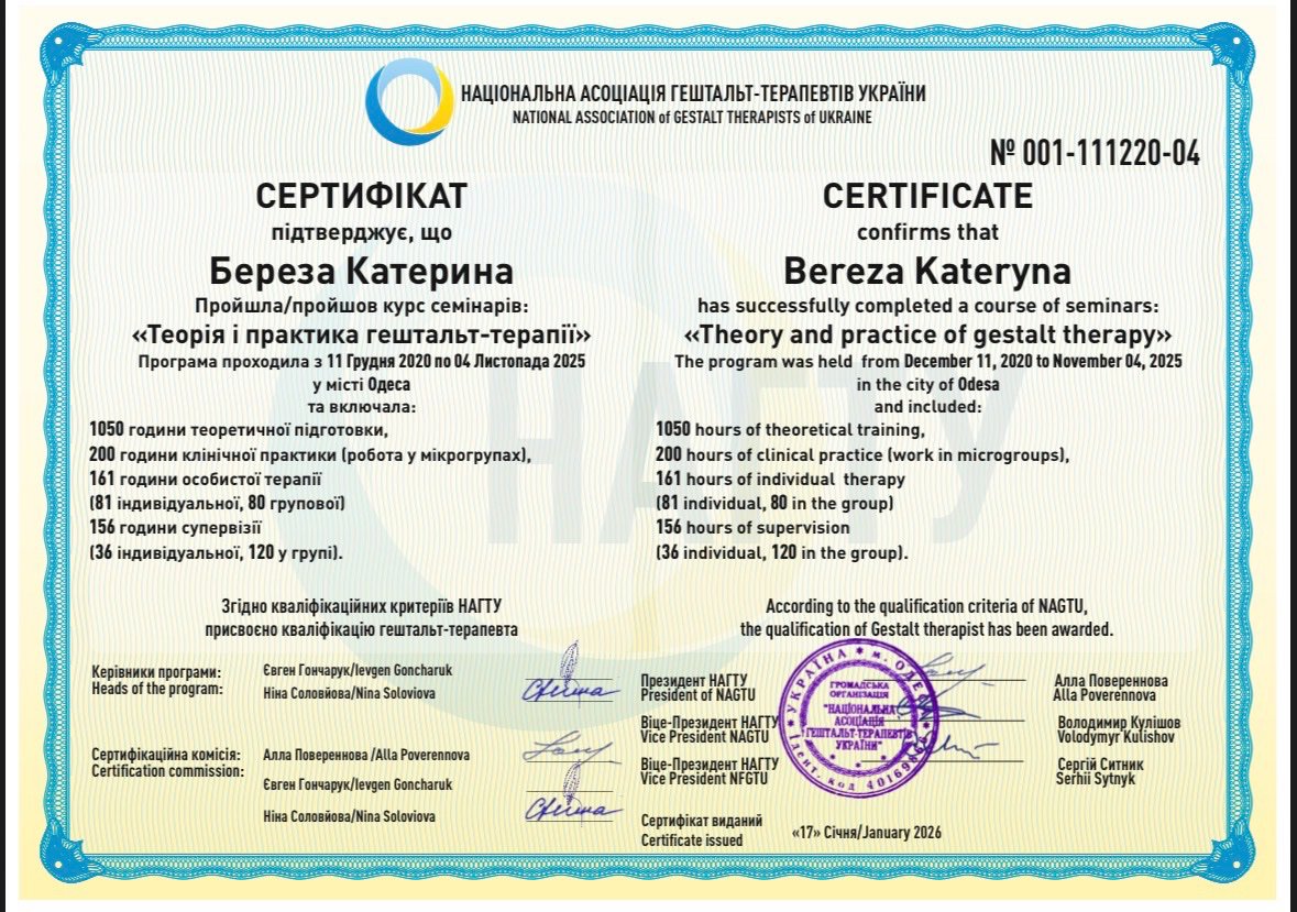 Я – гаштальт терапевт в процессе обучения более половины 2-й степени НАГТУ. В регулярной личной терапии более 6 лет. С этого времени и началось мое знакомство с психологией. И тогда я поняла, что самое интересное в этом мире – это понимание себя. Иногда психика похожа на сложный клубок нитей, где таща одну, другие становятся еще более запутанными. Это раздражает и огорчает, но с правильными вопросами и поддержкой психотерапевта есть возможность разглядеть именно ту ниточку, за которую когда тянешь, клубок уменьшается, распутывается, распутывается и… вот, у вас в руках уже готовое решение.