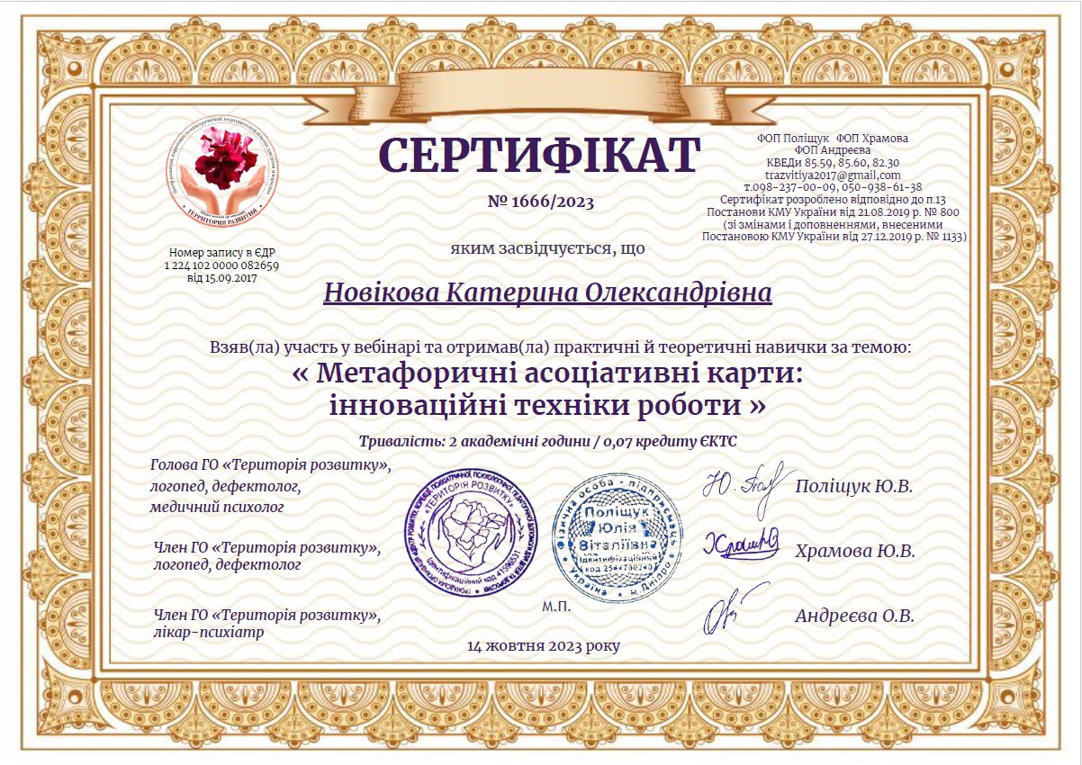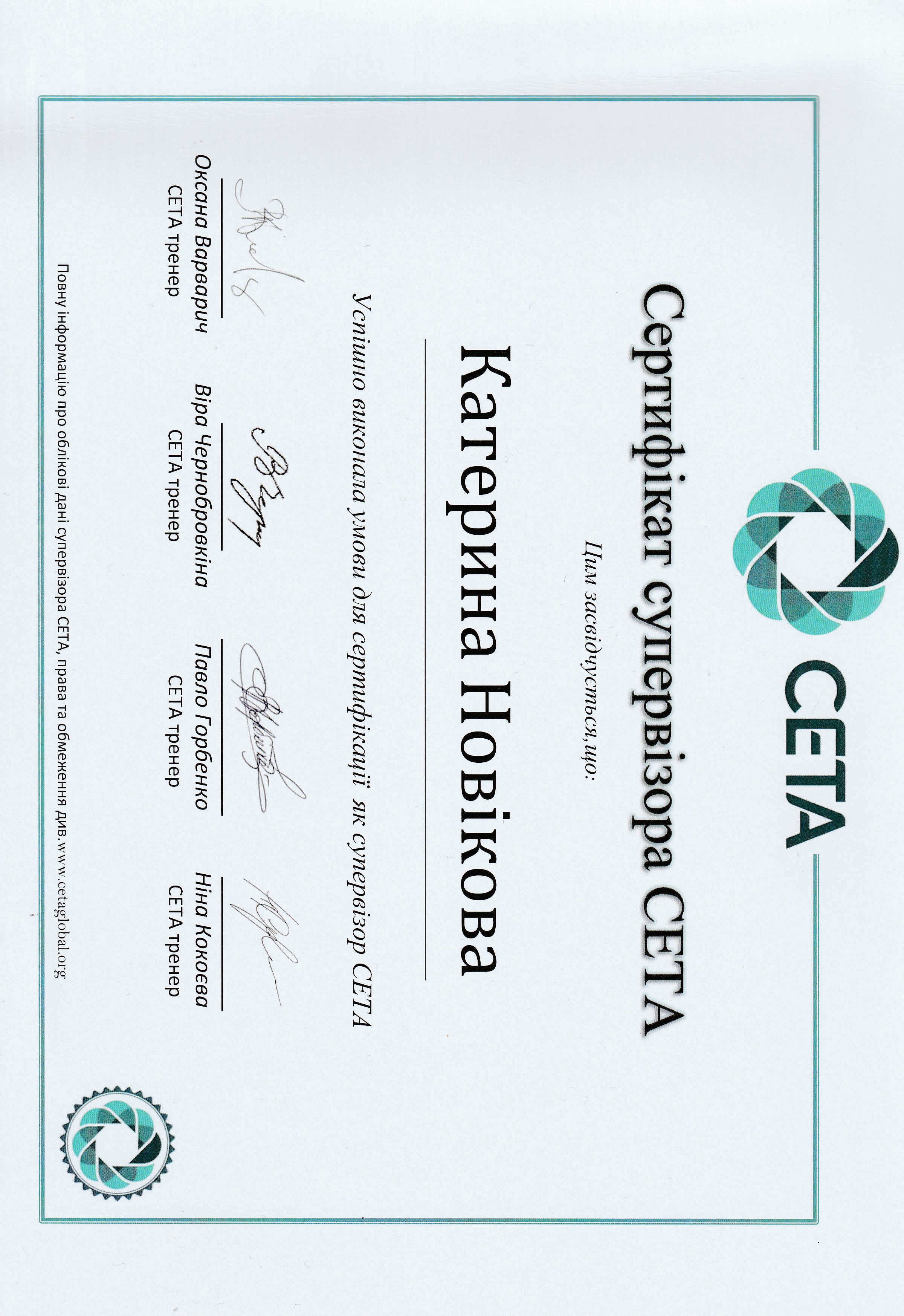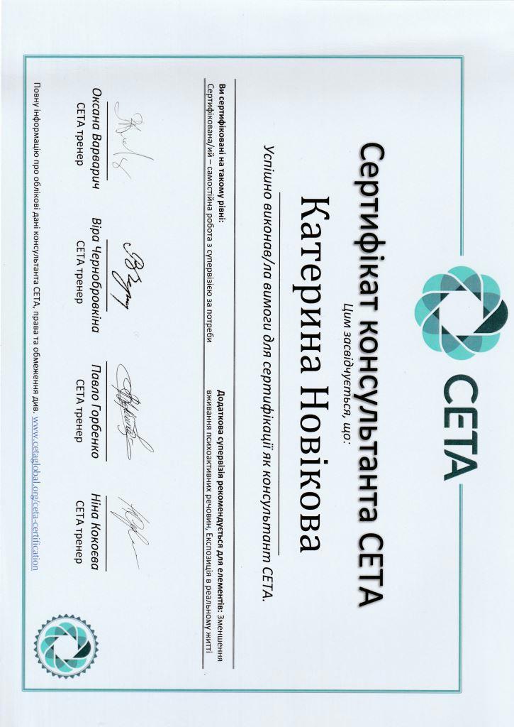 В 2021 году прошла обучение по программе СЕТА, сочетающей в себе техники когнитивно-поведенческой терапии. Получила знания по групповой работе с потерей «8-ми шаговая программа по работе с потерей». Получила сертификат Арт-терапевта. Завершила I степень Гештальт терапии и поступила на учебу на ІІ степень.