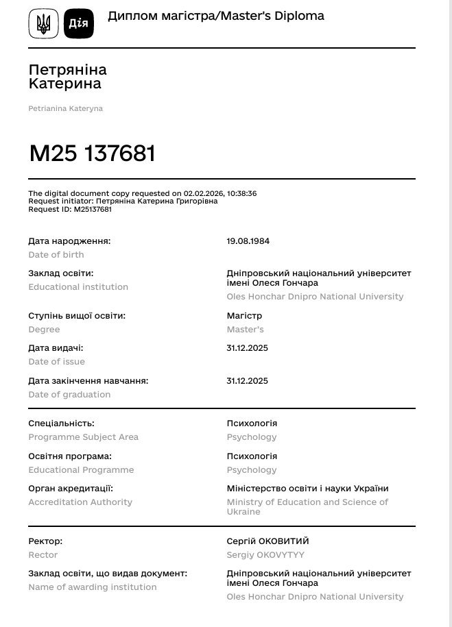 Я - практичний психолог, продовжую навчання на психотерапевта. У своїй роботі поєдную аналітичне мислення, тілесну чутливість і повагу до унікального досвіду кожної людини. Для мене важливо бути не «експертом над», а фахівцем поруч: уважним, стабільним і здатним витримувати складні стани клієнта.