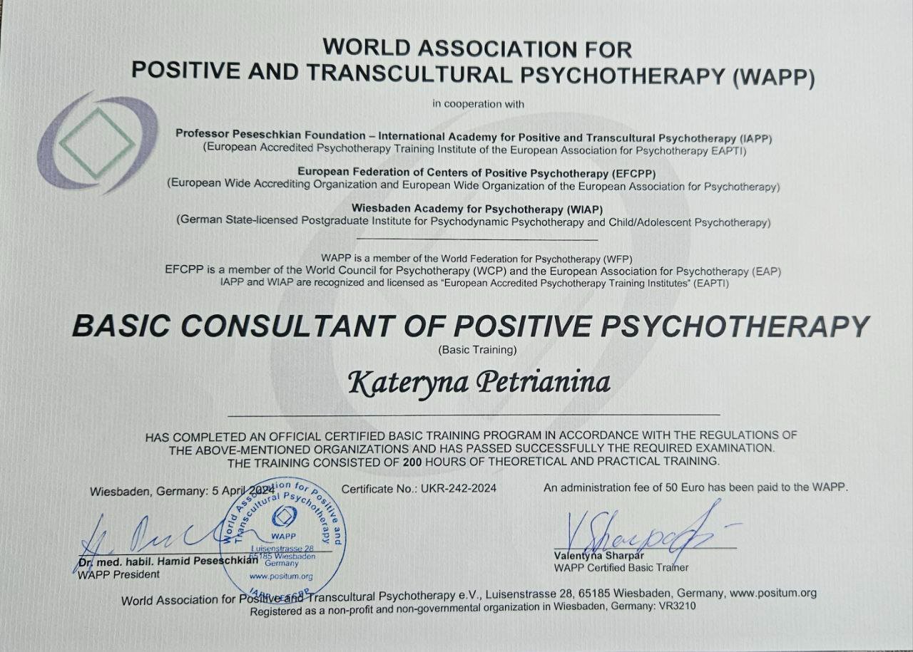 Консультант по методу "Позитивная транскультуральная терапия", продолжаю обучение на мастер курсе.