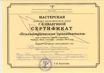 2011 г. — «Психиатрическая пропедевтика» (сертификат мастерской доктора мед.наук Пилягиной Г.Я.)