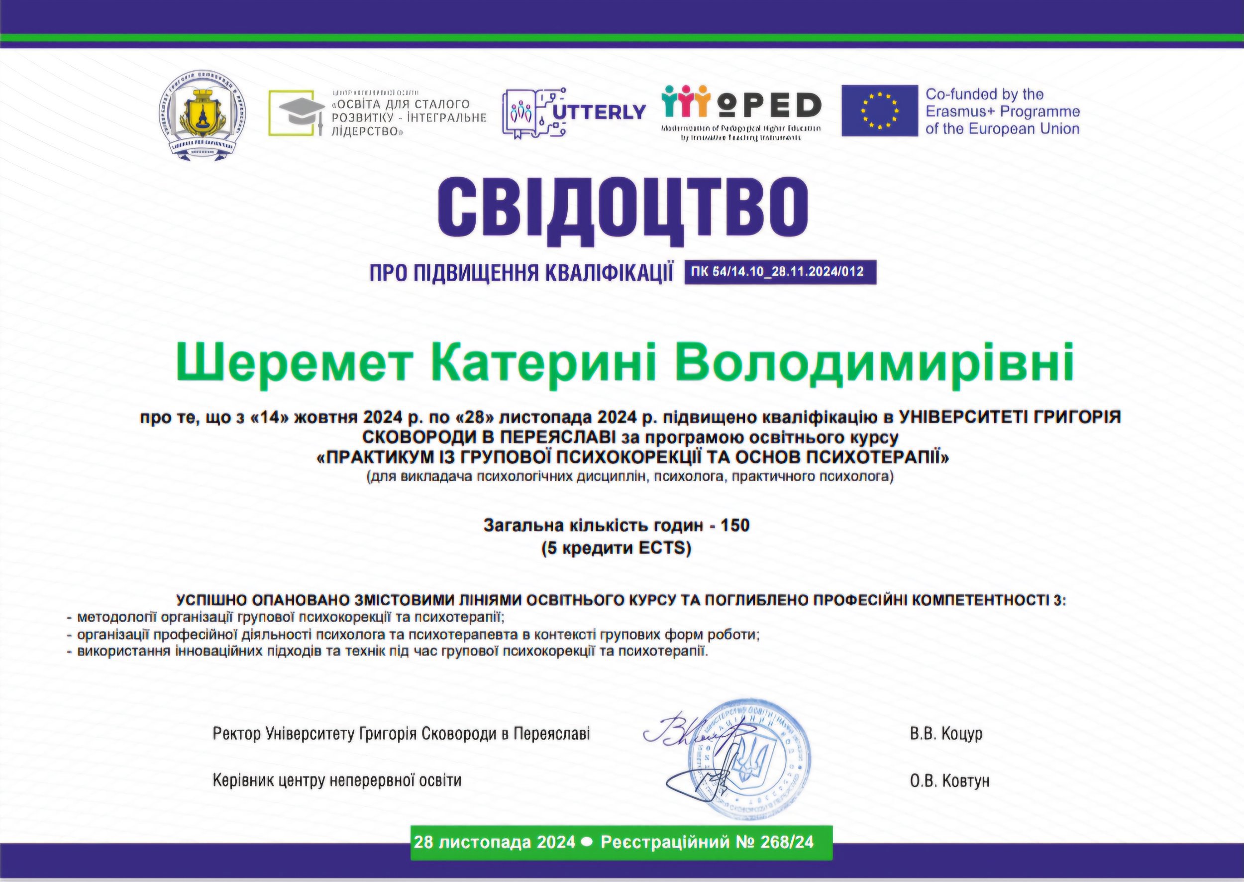 С февраля 2024 г. – членство в ОО "Украинская ассоциация экологической психологической помощи"